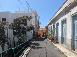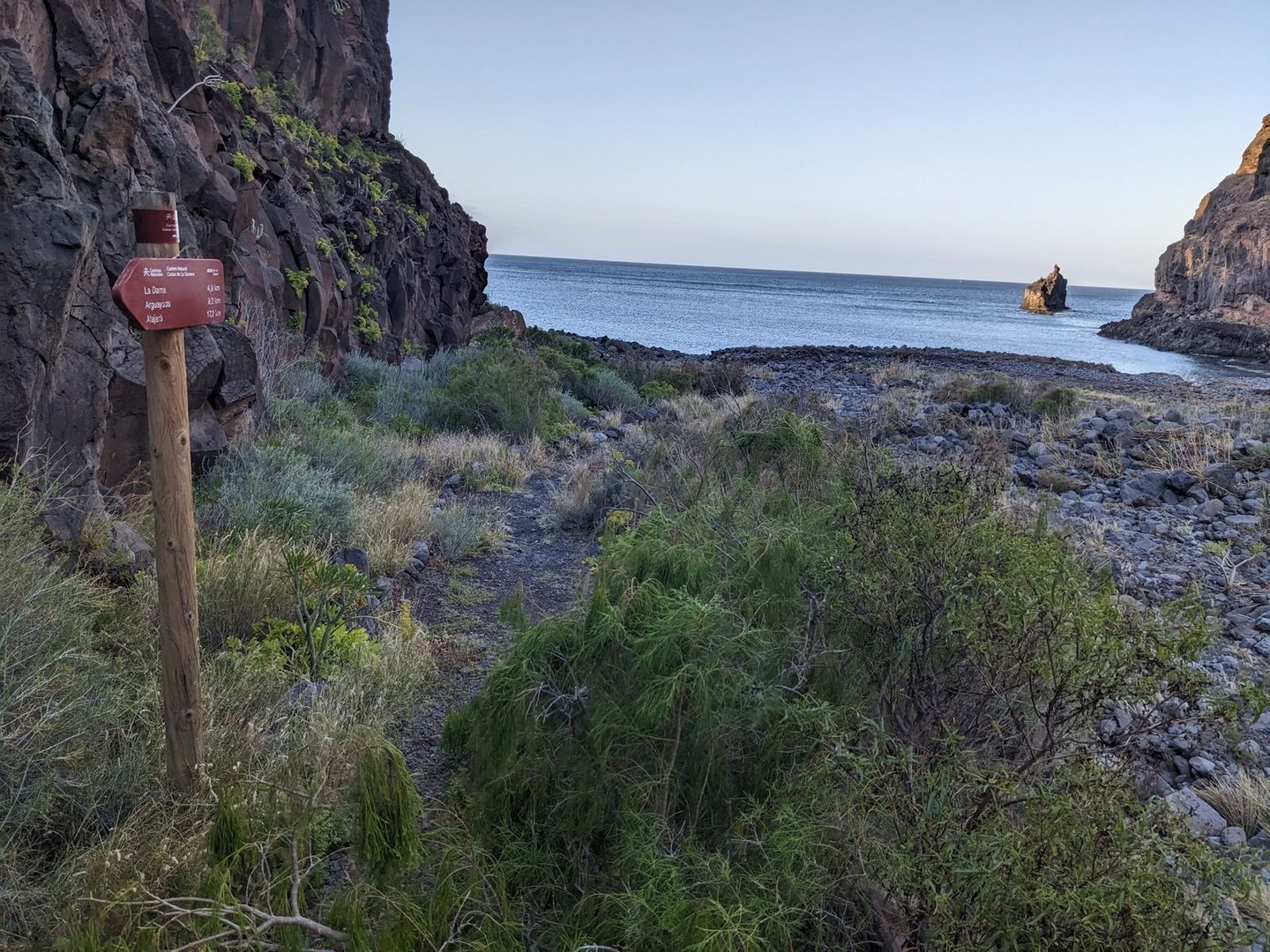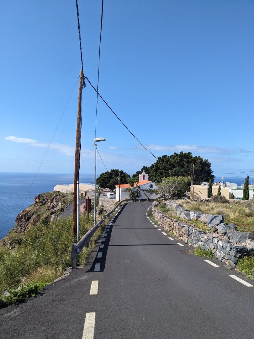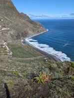 Es wundert mich nicht, dass sich Wanderer in der Hotelanlage verirren, was wohl der Stein des Anstoßes ist. Man wäre lieber unter sich. Wie immer in Ortschaften ist die Beschilderung eher naja. Ich halte mich rechts und komme beim Strand raus. Ein Spanier, offensichtlich ein Angestellter, in einem Golfwägelchen kommt mir entgegen. Wo ich Trinkwasser kaufen könnte, frage ich. Er grinst und winkt mir, ihm zu folgen. Bei einem Wasserhahn meint er, “bestes kaltes Trinkwasser”. Es schmeckt frisch & gut. Ich bedanke mich und fülle einen halben Liter ab, ich sollte eh bald in San Sebastian sein. Es geht nochmal einen Grat hoch und wieder runter - und dann gelingt es dem Weg bis San Sebastian quasi nochmal ein Küstenwanderweg zu werden. Ein schöner Ausklang. Das Barranco de la Guancha führt kaum noch Wasser und ist mit großen Steinen verblockt. Und völlig zugemüllt. Ich nehme ein Autofolie und ein paar Tüten mit, aber es ist völlig aussichtslos. Am Playa de la Guancha gehts dann nochmal hoch. Mit Blick auf Teneriffa und den verschneiten Teide geht es weiter. Ein Barranco will noch genommen werden. Und dann final der Blick auf San Sebastian. Es bläst ein wirklich knackiger Wind. Es geht runter. Am Heizkraftwerk vorbei, wieder Richtung Innenstadt, zurück zum Ausgangspunkt. Geschafft!