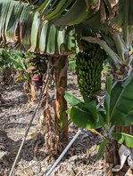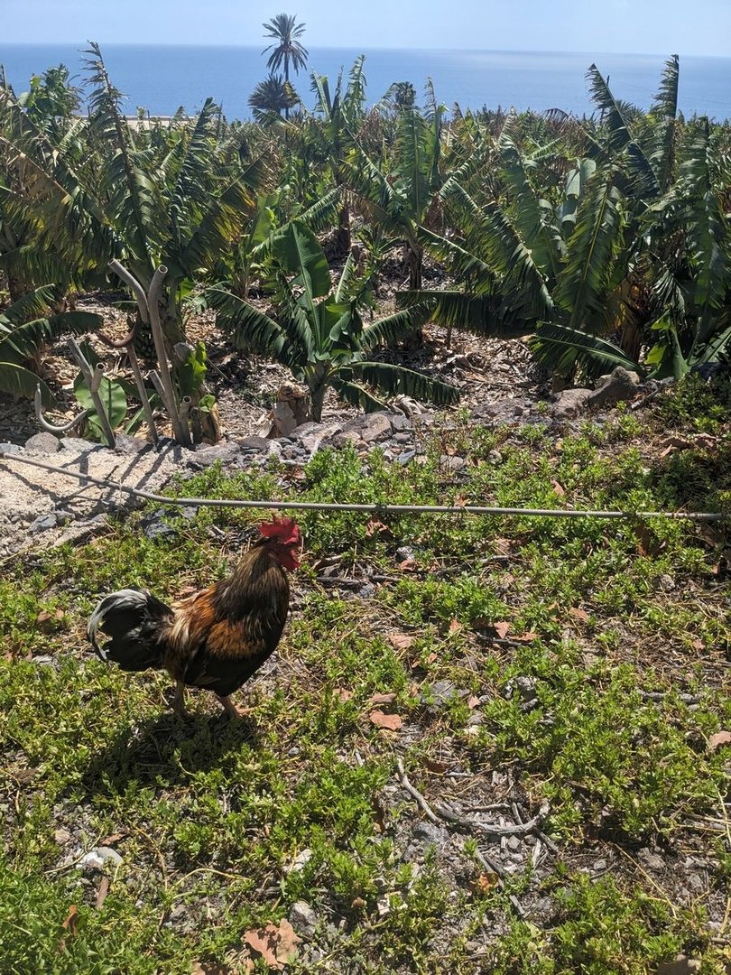 Ich fülle mein Wasservorrat wieder auf über 3 Liter auf - das nächste gibt es laut Karte erst wieder in El Cabrito, so die Besitzer wollen. El Cabrito (das Geißlein) befindet sich in Privatbesitz und das Netz ist nicht nur begeistert davon, mal sehen. Todo estará bien. Ab jetzt beginnt der trockenste Teil meiner Reise, vor allem landschaftlich. Es dauert etwas bis ich final aus dem Ort draußen bin. Es geht durch Hotelanlagen und Golfplätze. Bananenanbau mit Hahn, einer Henne und ihren Küken. Tageswanderer begleiten mich noch erstaunlich lange durch die Hitze. Es geht steil runter ins Tal. Steil raus aus dem Tal. Und nochmal das ganze im nächsten Tal. Es ist heiß.