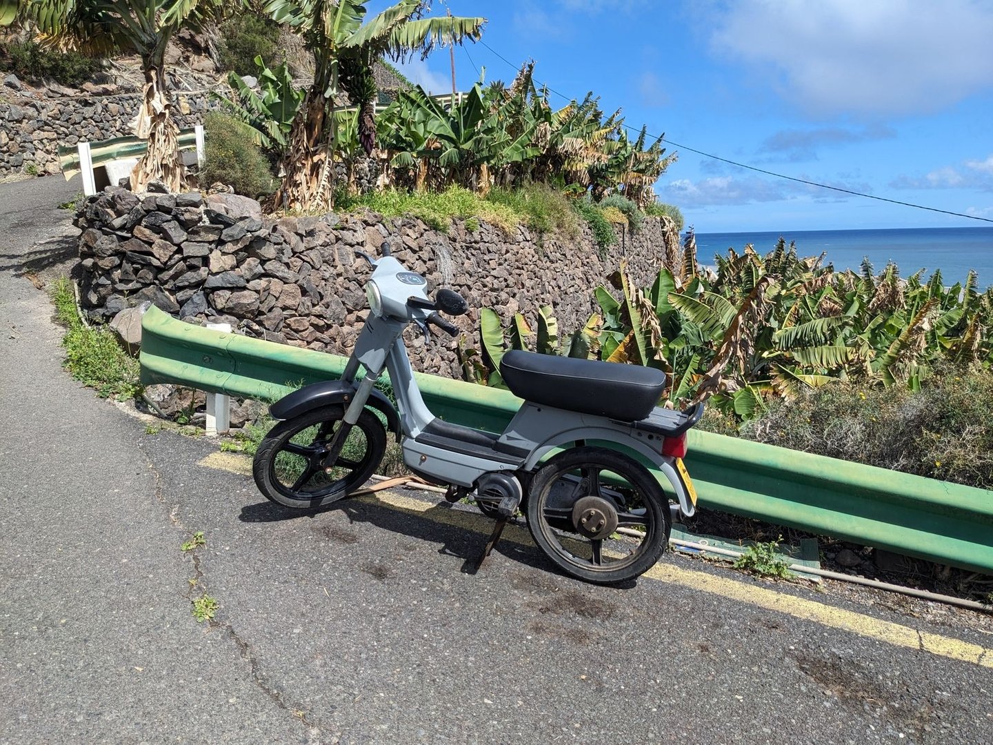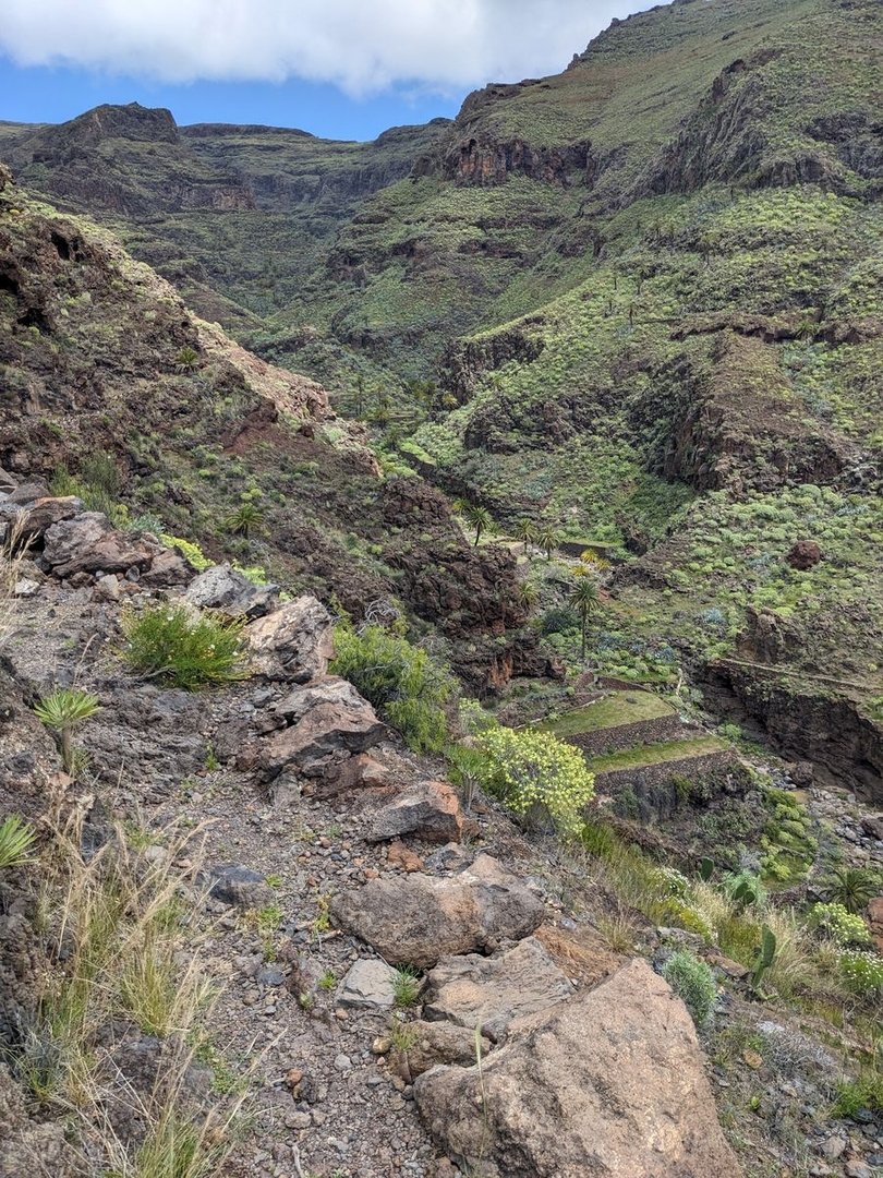 Es geht immer weiter runter, an einigen Bewässerungssystemen vorbei. Es hat immer wieder genieselt, aber jetzt zieht es zunehmend zu. Endlich komme ich in einem Dorf an. Aus der Bar laute Schreie. Wtf? Ich habe Hunger. Ich ziehe meine mittlerweile übelst müffelnden Schuhe aus, hänge die Socken zum Trocknen auf und schlurfe barfuß in die Bar. Man streitet nicht, man diskutiert! Und trinkt Wein! Aus Saftgläsern!? Salut! Ich frage ob es etwas zu essen gibt. Boccadillos! Ich bestelle “Lomo” --- Ja, klar, bitte mit Mayo. Dazu etwas Rotwein aus dem 5l Tetrapack der hinter dem Tresen steht. Lessons Learned: Wein macht nur halb so platt wie Bier, Mittags. (Muss am Hopfen liegen, war angeblich die Idee der Hl. Hildegard von Bingen). Noch schnell Wasser kaufen im Supermarkt. Es haben sich neue Gäste eingefunden. Die Diskussion geht euphorisch weiter. Wie kann man nur so plärren, ohne sich zu prügeln? Noch ein Käffchen und weiter geht's auch für mich. Ab jetzt, aufwärts. Zunächst die Straße lang, immer weiter hoch und später dann wieder Eselsweg. Wunderschöne Terrassenanlagen, mit Agaven und Palmen. Von hinten drückt es dunkle Wolken rein. Ob die vorbeiziehen? Je höher ich komme, desto stärker wird der Wind und desto schlechter wird das Wetter.