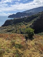 Die Piste wird zum Feldweg mit beträchtlichem Gefälle. Eher was für einen guten FWD. Immer wieder gab es Erdrutsche oder Steinschläge die den Weg für Fahrzeuge unpassierbar macht. Es ist auch schon recht spät und wird bald dunkel. Ich verlasse den Naturpark Parque Natural de Majona und finde einen verlassenen Bauernhof mit Terrassenanlagen. Ich geh weiter. Ziegen blöken die ganze Nacht. Schräge Strategie für einen Herbivoren. Ein Tier mit Micky Maus Stimme hat sein Didgeridoo dabei. Es regnet immer wieder bei einem gefühlten böigen 3er Wind.