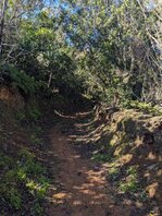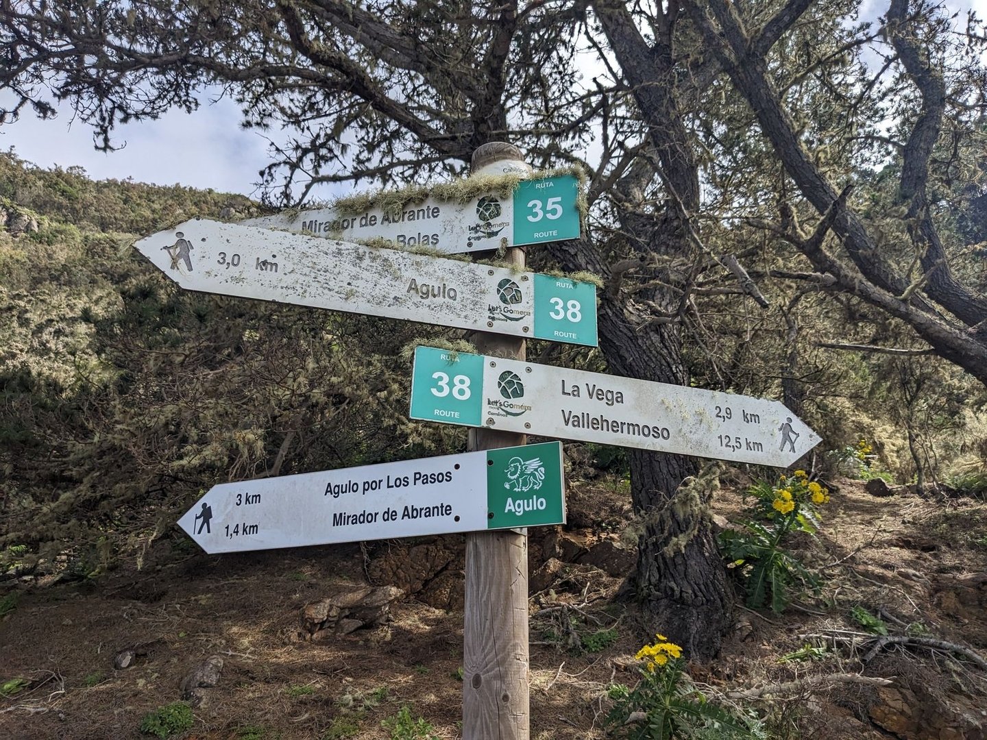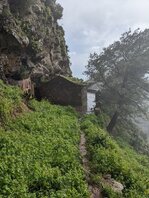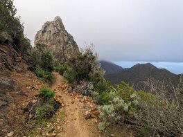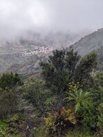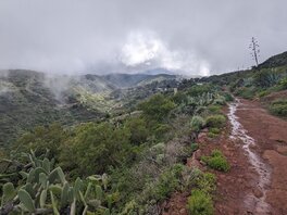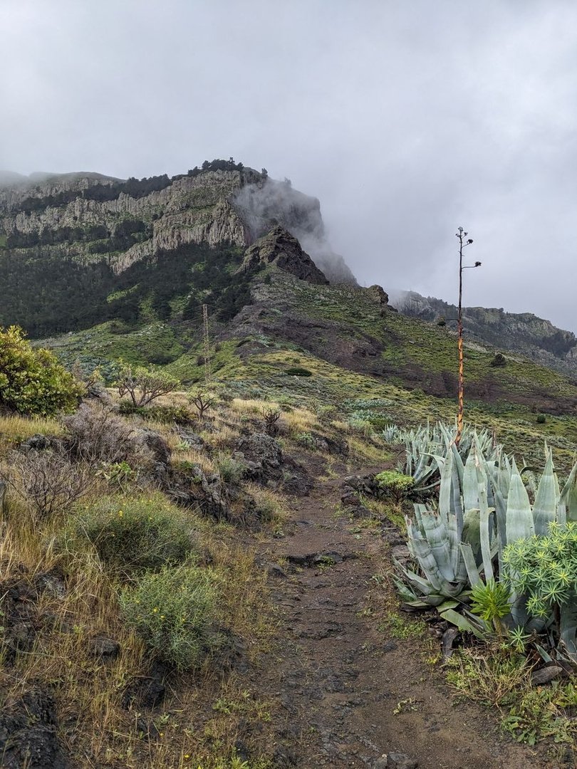 An sich war der irgendwann mal der Plan hier oben zu bleiben, aber es ist noch deutlich zu früh und hier ist deutlich zu viel los. In Juego de Bolas ist dann das “Centro de Visitantes del Parque Nacional de Garajonay”, wenn man so will die “Ranger Station”? Es gibt Toiletten und Wasser, die Bäckerei verkauft nur seltsam trockenes, aber immerhin eine Fanta springt raus. Es beginnt zu regnen, und ich beschließe, dass hier kein guter Ort ist um zu bleiben und gehe weiter. Zuerst Teerstraße, dann Singletrail. Es regnet mittlerweile so stark, dass ich einen Bach mit dem Weg verwechsle, da selbiger mit einem Erdrutsch auch verschüttet ging. Ich muss nochmal zurück. Der Regen wird immer stärker. Man kommt durch eine Siedlung und ich stelle mich ein paar Minuten unter einem Carport unter. Aber wo bleiben? Bei La Hormiga sieht es gut aus, aber es ist immer noch vor 17:00, ich stehe inmitten einer Wolke, also im Nebel und es regnet. Der Wald ist zu dicht, und wo kein Wald ist, ist Lehm und Schlamm und wirklich knackiger Wind. Ich lauf weiter. Mal raus aus der Wolke, etwas tiefer. Beim Staudamm Embalse del Garabato, der sich langsam wieder zu füllen scheint, komme ich durch ein Dorf. Es geht ab hier wieder aufwärts durch einen Wald, viel zu dicht, viel zu steil. Oben angekommen sind ein paar Schoßhunde, die mich verfolgen und ankläffen. Weiter geht's. Auf der Karte ist eine Kapelle eingezeichnet, die sich als Mini-Schrein erweist. Es wird immer steiler. Und vor allem wird es immer später. Um 19:30 sollte ich einen Schlafplatz haben. Ich laufe also weiter. Bei Roque Chico sieht es flach aus auf der Karte. Der Weg streift dort zwei Felsnadeln, wohl ehemalige Vulkanschlote. Auf dem Weg? Nein. Es beginnt zu dämmern.