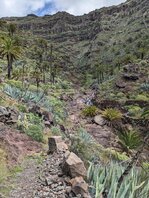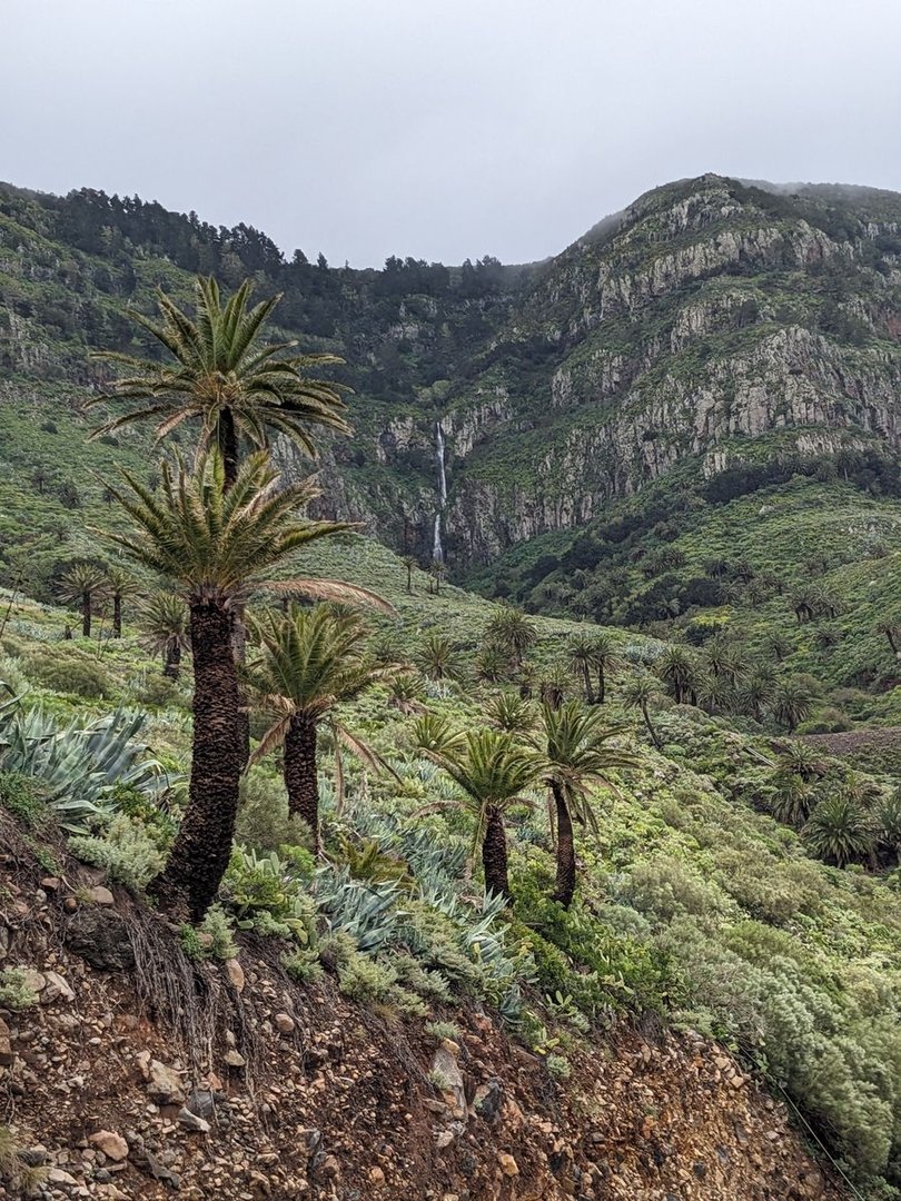 An sich ist La Gomera ein einziger Berg im Atlantik. Vulkanisch, aber seit 2 Mio Jahren inaktiv. Man läuft an sich immer bergauf oder bergab. Und nicht selten, kaum hat man sich die Serpentinen auf der einen Seite der Schlucht nach oben geschleppt, gehts auf der anderen Seite wieder runter. Es hatte wahnsinnig viel geregnet, und so hatten alle Flußbette Wasser geführt. Es gab epische Wasserfälle in einer Fülle, wie ich sie bisher nur in Norwegischen Fjorden gesehen habe. Und alles war grün. Es gibt sicher einmal am Tag eine offizielle Möglichkeit, wie Restaurant oder Supermarkt, Wasser zu fassen. Bis auf eine Etappe ist an sich immer ein Supermarkt und/oder ein Restaurant dabei. Und an sich gibt es auch genug Unterkünfte, die ich allerdings mit quasi Minimum 75€ (als Einzelzimmer) ECHT teuer fand. Die Vegetation ist hauptsächlich Makia (Span.: “Matorral”?, Buschwerk, Wolfsmilch und Kakteen), oben gibt es sehr dichten Wald (Lorbeerbäume?). Die Insel erscheint mir ziemlich Hängematten ungeeignet, bin aber Bodenbrüter. Die Tour ist wirklich sehr abwechslungsreich, und jeder Tag irgendwie anders