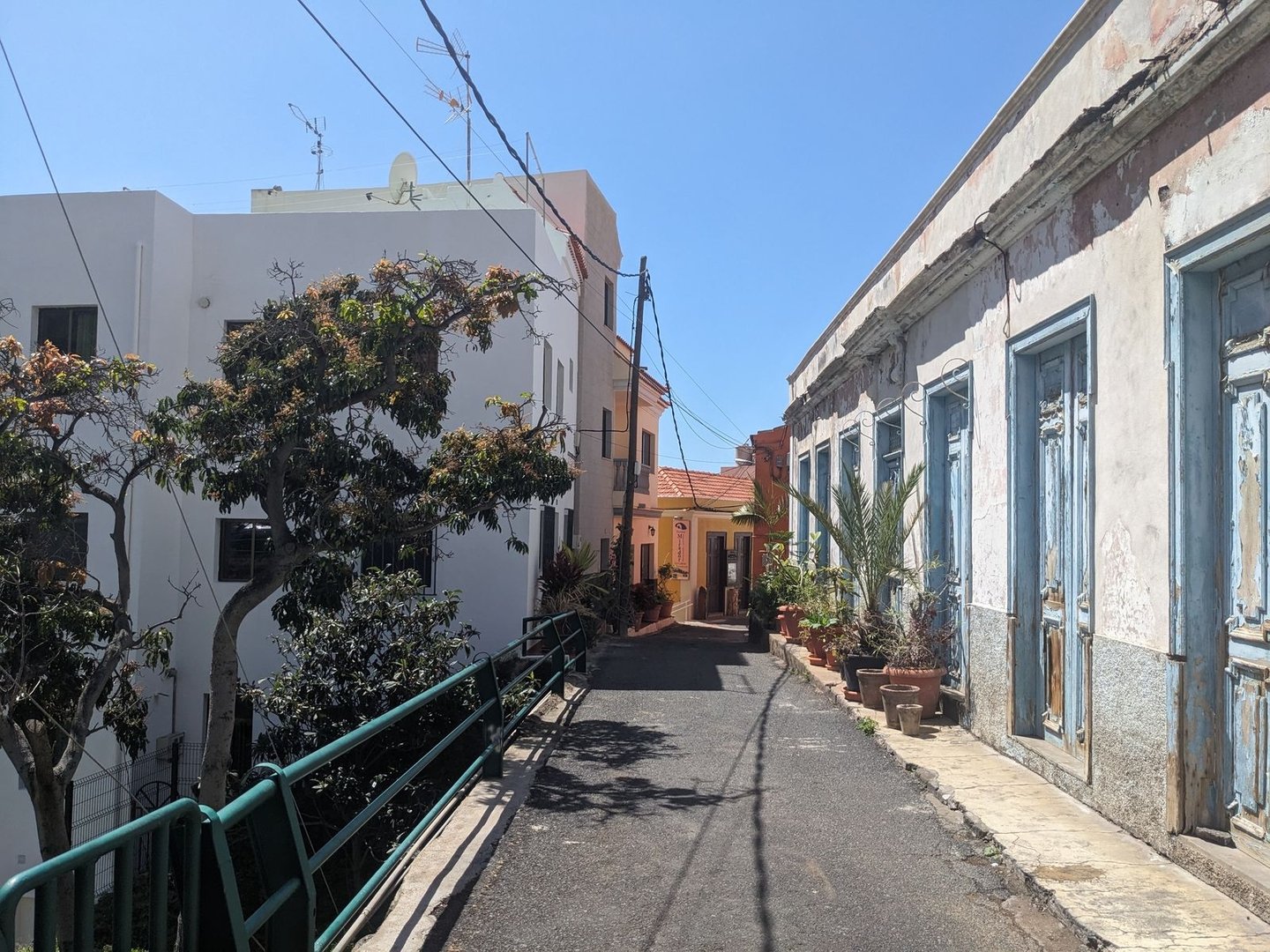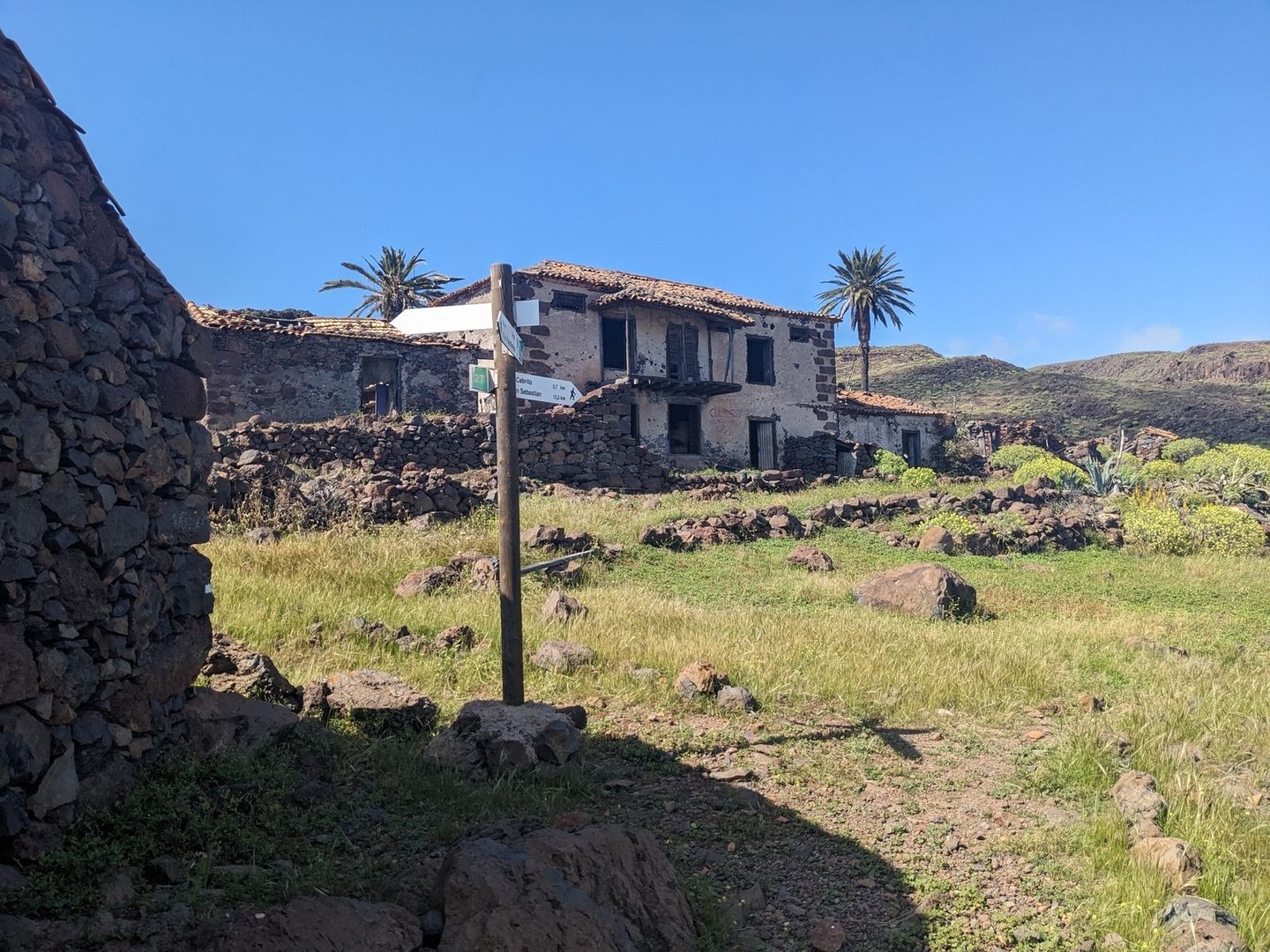 Der Weg verlässt nun endlich die Straße und man schlappt wieder durch den Schlamm, immer wieder durch die Ruinen längst verlassener Häuser auf einem Single Trail. Palmen & Buschwerk. Man geht die Küste entlang immer tiefer, bis man auf eine asphaltierte Straße trifft. Dort gehe ich erst mal runter zur Bucht Playa de la Caleta de Hermigua. Es gibt eine Dusche ohne Duschkopf, WCs ohne funktionierende Spülung. Metallisch riechendes Wasser kommt aus den Hähnen. Die Sonne scheint und ich trockne meine Sachen. Ersma Kaffee. Eine Katze fühlt sich einsam und fordert maunzend Streicheleinheiten. Roter Hintern = Würmer? Vielleicht doch das nächste mal Händedesinfektion mitnehmen. Ich kraule sie hinterm Ohr. Dann geht es zurück die Straße hoch. Oben angekommen, ein toller Blick über das Tal von Hermigua. Ein steiler Pfad zieht sich nach unten zur Küste. Wenn man unten etwas die Straße hoch geht, kommt man zu einem Supermarkt. Es gibt auch Unterkünfte und Restaurants.