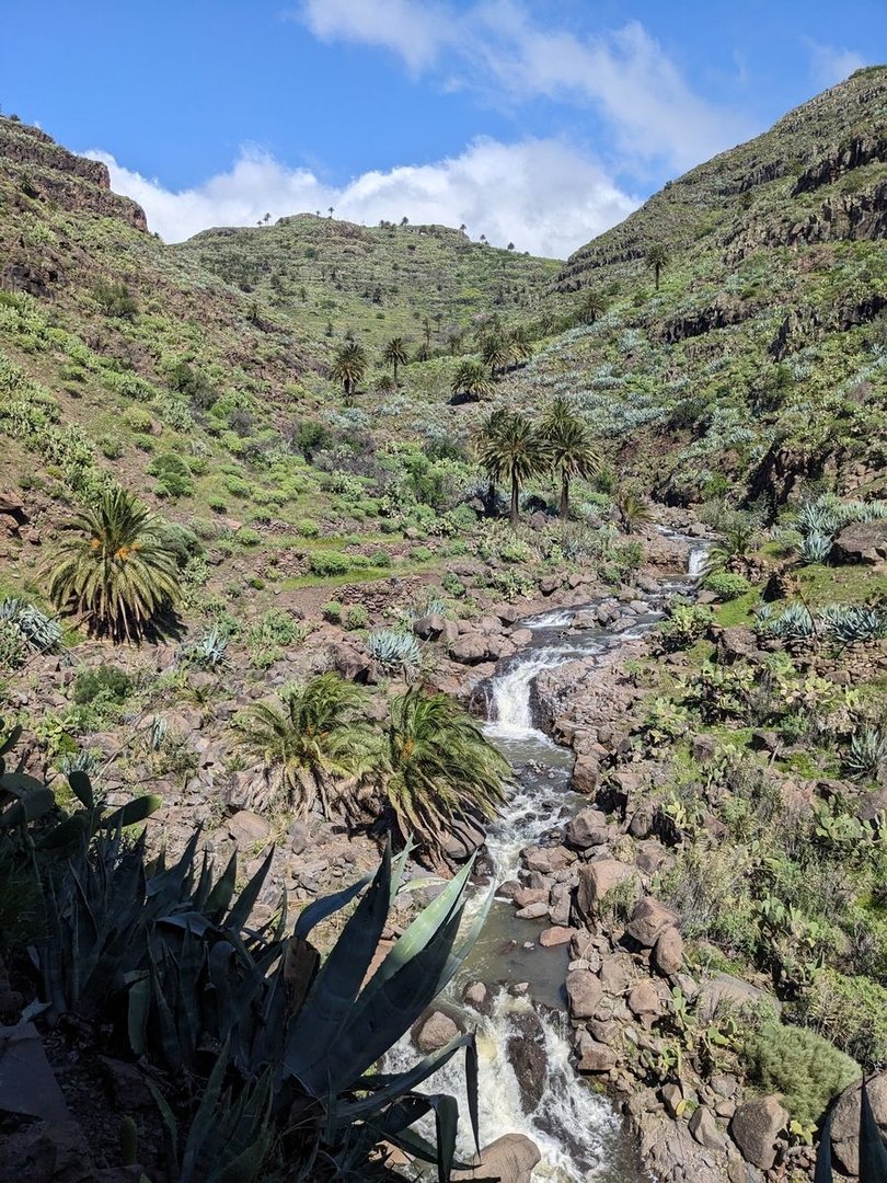 Es gilt einen reißenden Bach zu überqueren. Das passiert hier wohl den wenigsten Wanderern. Zum Waten zu reißend, springe ich von Stein zu Stein. Dann geht es wieder hoch. Ab Los Almácigos, einem bewohnten Gehöft, geht es etwas Straße lang bis es wieder rechts auf einen Trampelpfad geht. Ich fange an etwas Sonnenbrand an den Waden zu spüren. Es geht wieder etwas runter zu einem kleinen Stausee mit frischem Gras und dann final hoch nach Alajeró, wo ich mir in der dortigen Bar erstmal ein Bier gönne. Cheers!