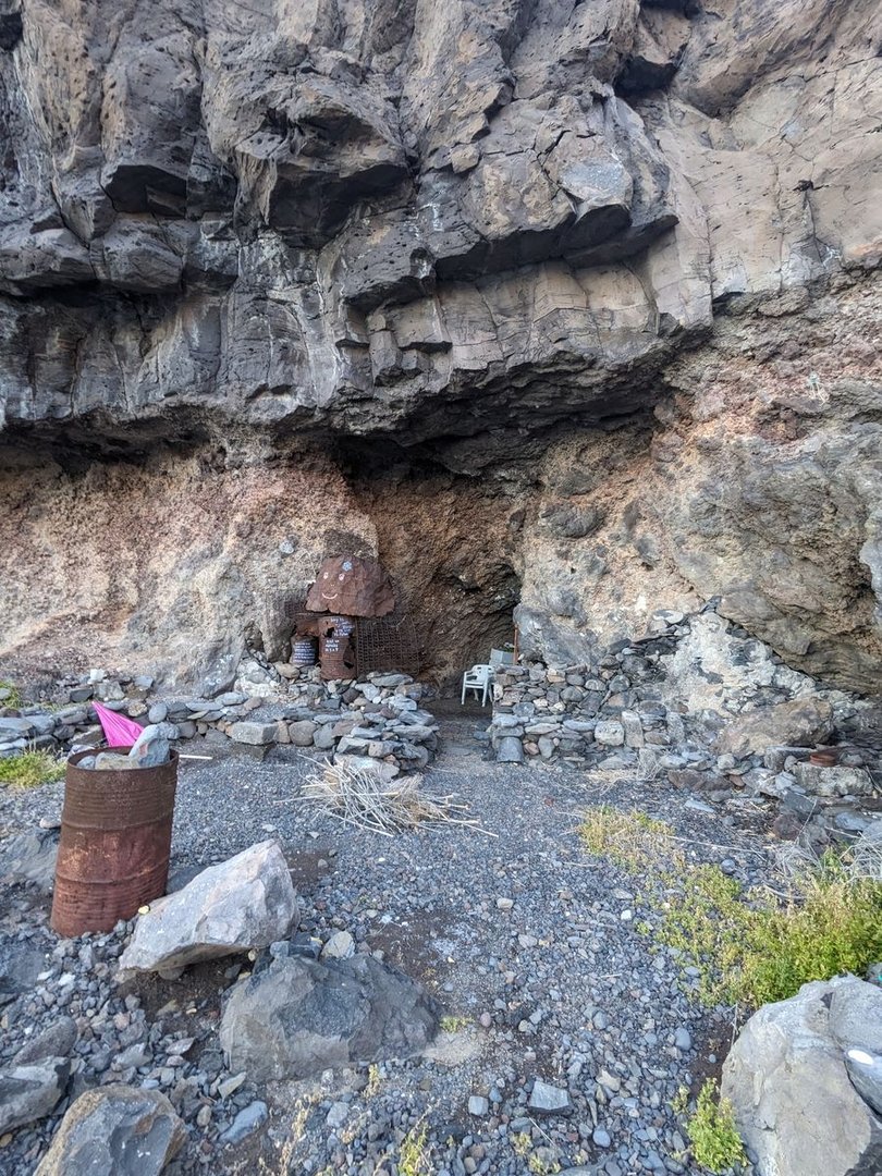 Ab da geht es runter. Zuerst durch einen kleinen Ort, und dann immer durch Terrassenfelder durch. Etwas gerstenartiges wächst grün und üppig überall. Es ist wie eine Zeitreise und man läuft durch mittelalterliche Landschaften. Der Wind spielt Muster in die Halme. Alles Menschenleer und verlassen. Oder wie in einem Computerspiel. Fast schon surreal. Was ist passiert, dass all das aufgegeben wurde? Je weiter man nach unten kommt, desto trockener und hässlicher wird es. Bei Loma de Pepe ein Hippy Café, aber ich habe noch Weg vor mir. Gleich danach eine aufgegebene Bananenplantagen. Aber ich wollte noch runter in die Barranco de Iguala um mich zu waschen. Es wird zunehmend spät und bald wird es dunkel. Das allwissende Internet meint in 30min ist Höchtswasserstand im Meer. Dann kommt das Meer sicher nicht viel weiter rein als jetzt. Ich laufe einen Eselsweg runter zu Playa de Iguala. Es gibt dort eine beschlafbare Höhle, ein paar Ruinen und neben großen Steinen immer wieder etwas schwarzen Sand am Strand. Ich wasche mich im Fluss & koche mir erstmal etwas getrocknetes zum Abendessen. Das Tier mit Mikeymaus Stimme und dem Ditsch ist wieder da. Hat wohl fliegen gelernt. Ist das etwa eine Krähe? Hä? Der Wind ist ablandig und stark böig, die Brandung rauscht wie eine Schnellstraße.