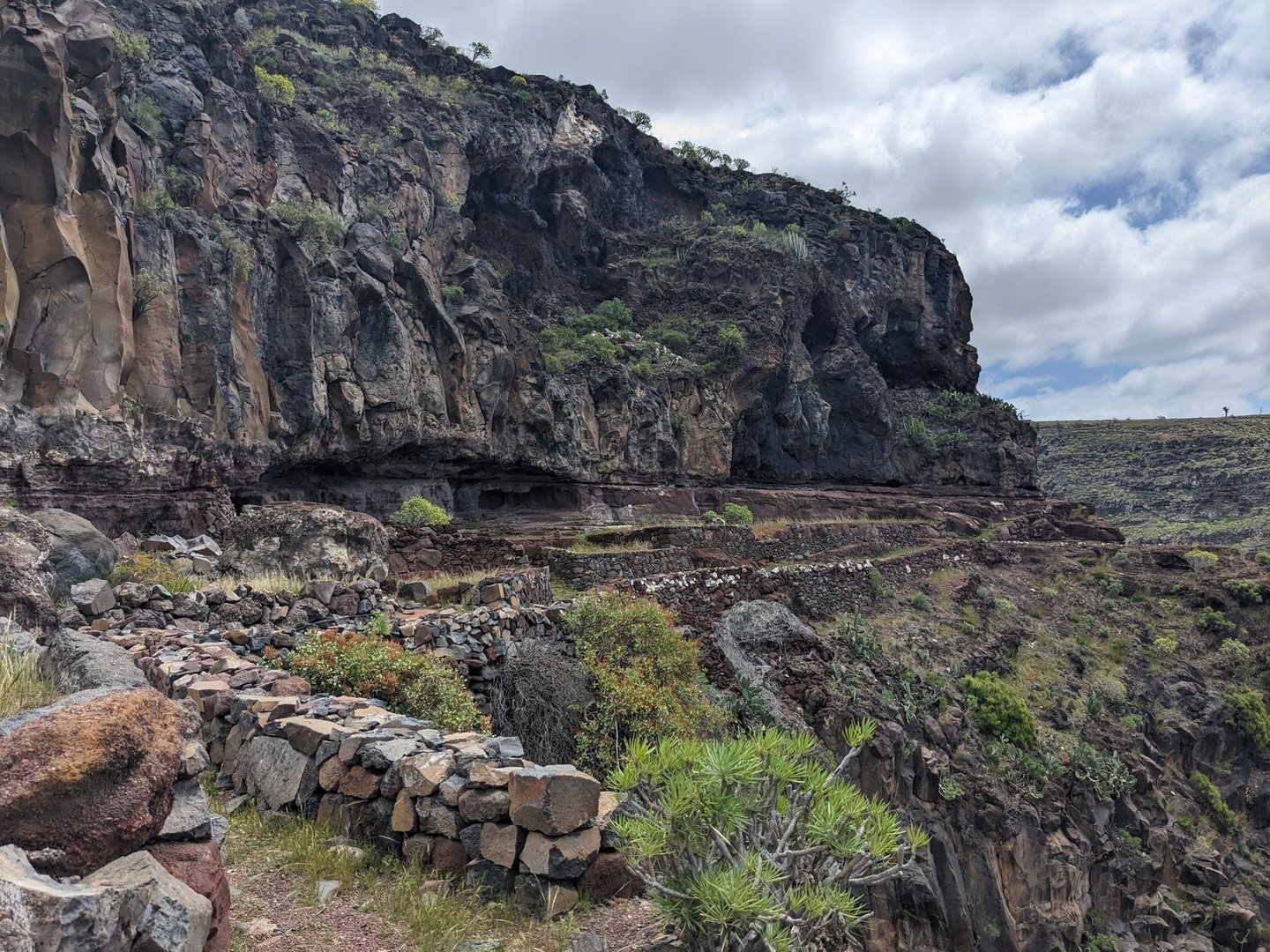 Es geht erst mal richtig steil runter – an einer Baustelle vorbei, und – richtig steil hoch. Alles trocken hier und gelb. Und dann geht's nicht mehr gar so steil hoch. Bei Arguayoda ein nicht funktionierender Wasserhahn. Eine Frau bietet mir von sich aus an, meine Flasche zu füllen, was ich dankend ablehne, die noch verbleibenden 2,5 Liter tragen sich eh schon schwer genug. Und dann kommt mit dem Barranco de la Negra und dem Barranco de Almagrero, der zweite wirklich herausragende Teil des eh schon schönen Trails. Man läuft auf Eselswegen in das steile Tal. Unten ein rauschender Bach. Immer wieder Terrassen. Mittig der Blick auf eine große Wohnhöhle. Der Weg versucht die Höhe zu halten (was ihm nicht gelingt) und man läuft immer weiter in das grüne Tal hinein.