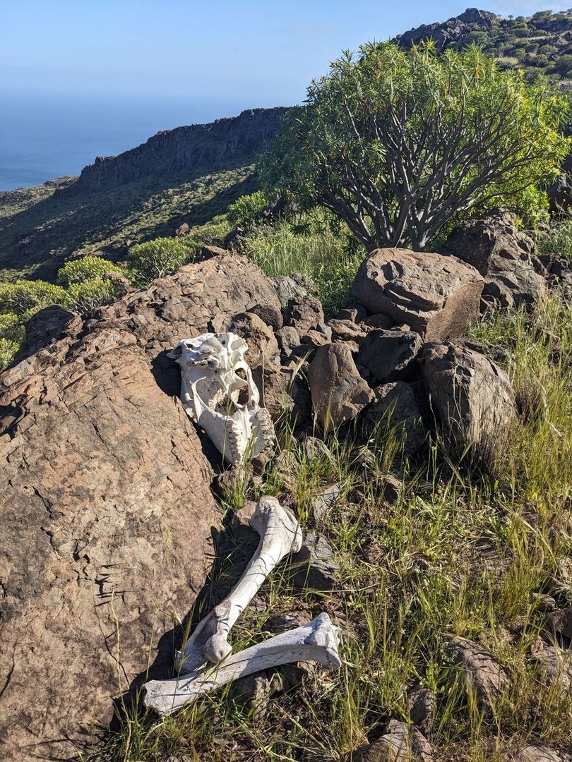 Ich breche mit wenig Wasser auf, in ca 3h sollte ich in La Calera sein mit Supermarkt und Restaurant (und klar auch Unterkünften). Es geht aus dem Ort raus, zuerst Straße, dann Piste, dann Trail mit schönen Aussichten in den Barranco de Arure. Man kommt an einer von Ziegen bewohnten Höhle vorbei. Ein Wanderin sitzt lesend oben in den Felsen, grüßt herunter und grinst. Nachdem ich den Sattel passiere, die Ruine eines alten Bauernhofes. Und ab da ziehen sich die Terrassen runter, weit bis nach Casa de la Mérica, mit wunderbaren Blick aufs Meer.