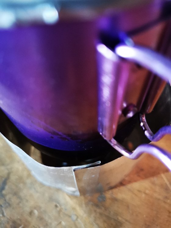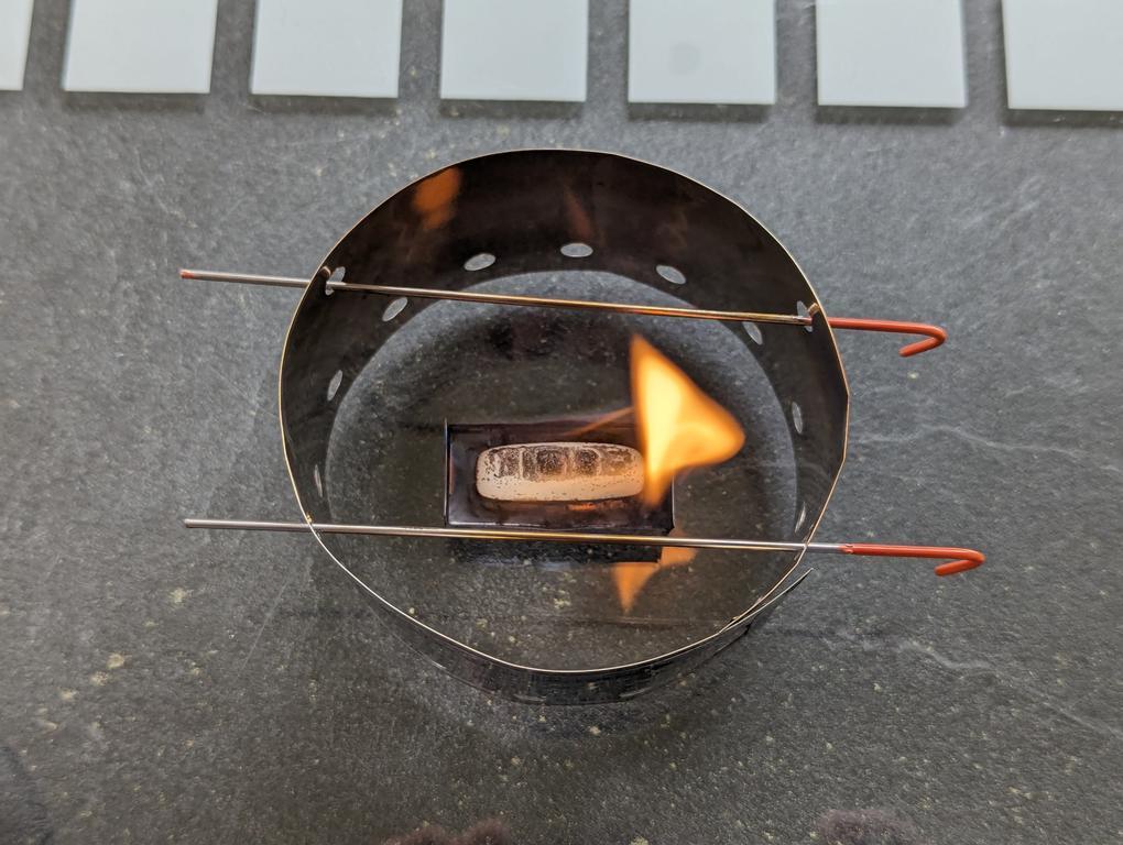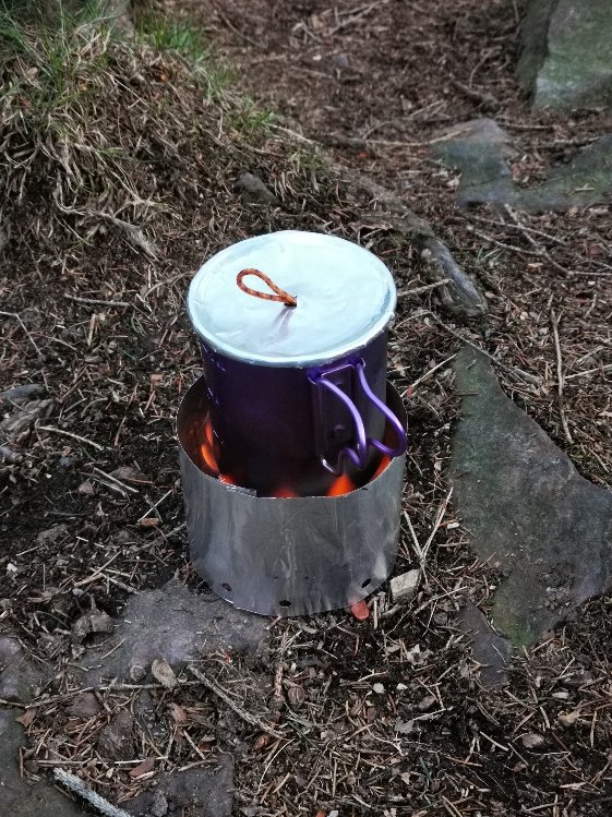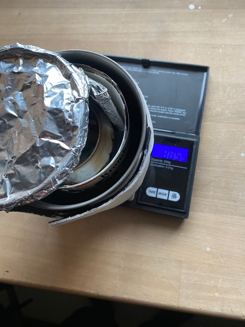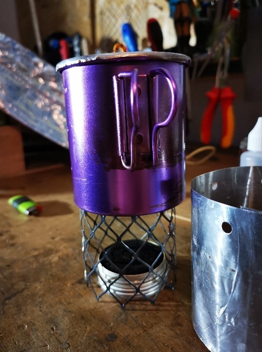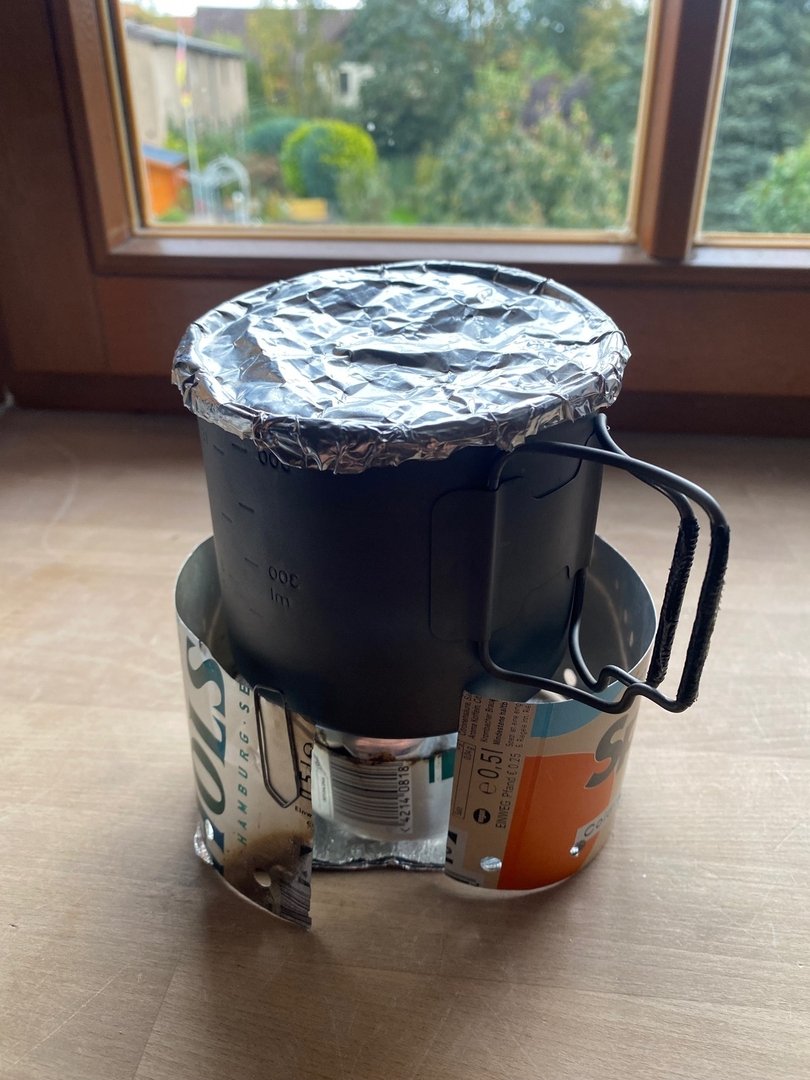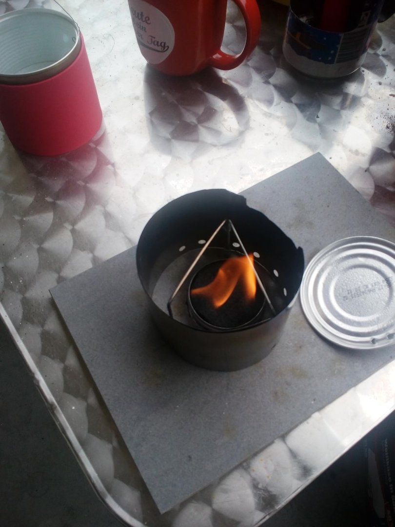 Topfdeckel und Windschutz bestehen aus dem Alu von billigen Einwegservierplatten aus dem Action-Markt (lagen noch vom Umzug rum ) , der Topfstand besteht aus dem Rost eines Einweggrills (beim Gassigehen gefunden) und der Kern des ganzen ein einfacher Carbonfeltkocher aus einer leeren Bartwachsdose (Dank geht an Wilbo für das Felt), bei der Verbindung des Windschutzes sollte es erst ein Schwalbenschwanz werden, leider ist mein Alu dafür wohl etwas schlabberig, am Ende hab ich mir eine andere Verbindung abgeschaut, die sich auch bewährt hat.