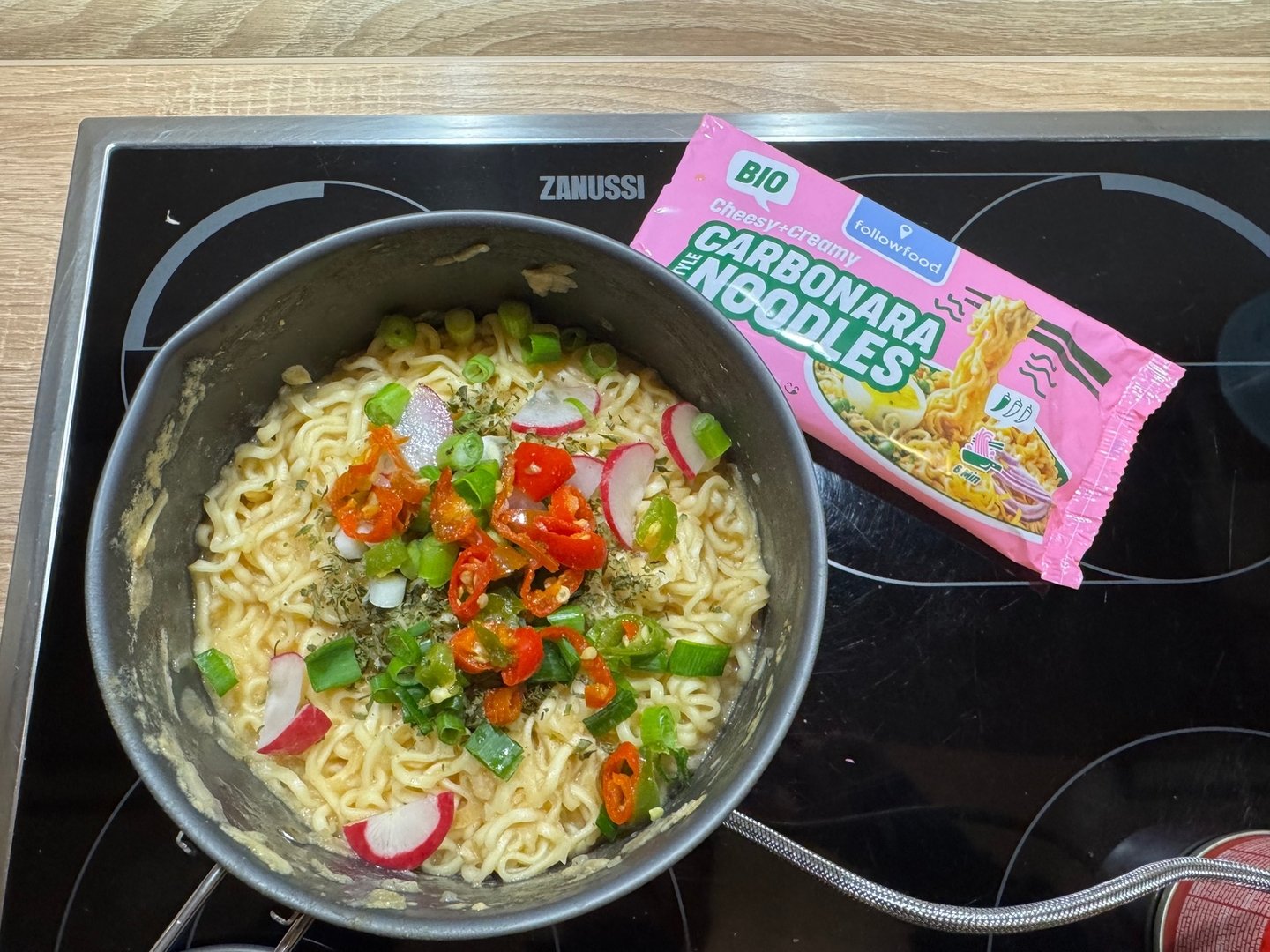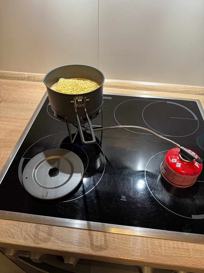 Bin völlig bereit, die Gewichts-Penalty zukünftig auf mich zu nehmen. (Der Kocher wiegt vorbildliche 94,5 g (mit 95 angegeben), der Wärmetauscher-Topf ist leider etwas schwerer als die angegebenen 188g (hatte angesichts von offiziell nur 2 oder 3g Gewichtsunterschied den 800ml-Ramen-Topf statt des G2 (mit 750ml) genommen). Dafür ist es aber ein tatsächlich mehr als 900ml Topf (hat dann noch 1cm Füllrand, ich denke, ein Liter geht rein bis zum Rand = super für mein morgendliches Teekochen, ich mache mir morgens die Flaschen voll). Doppelportion Ramen ging easy rein, plus Extras und noch Luft zum Rühren.