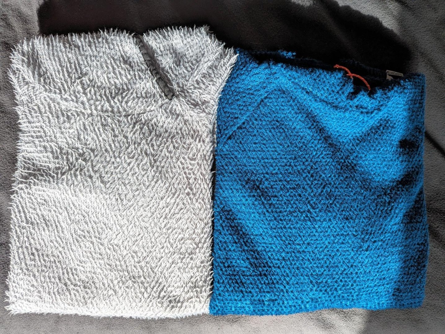 Beim Stoff erkennt man den Unterschied ziemlich eindeutig. Beide Pullis haben das gleiche Gitter, an dem diese Fusseln hängen. Aber die 90gsm vom FarPointe sind viel dichter als die 60gsm vom Nahleko. Das sieht man, weil auf der gleichen Fläche einfach deutlich mehr dieser Fusseln sind. Wie viel Unterschied das beim Wärmeerhalt spielt, kann ich nicht beurteilen. Wie weiter oben geschrieben, hatte ich nicht das Gefühl, dass die 90gsm mehr Wärme speichern, als die 60gsm. Vielleicht erkennt man den Unterschied der beiden Stoffe auf dem nächsten Bild...