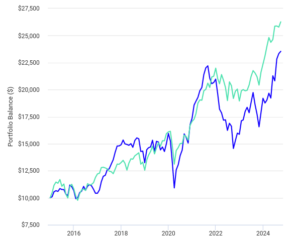 Nochmals, das soll hier keine Anlageempfehlung sein. Beide Grafiken von https://www.portfoliovisualizer.com