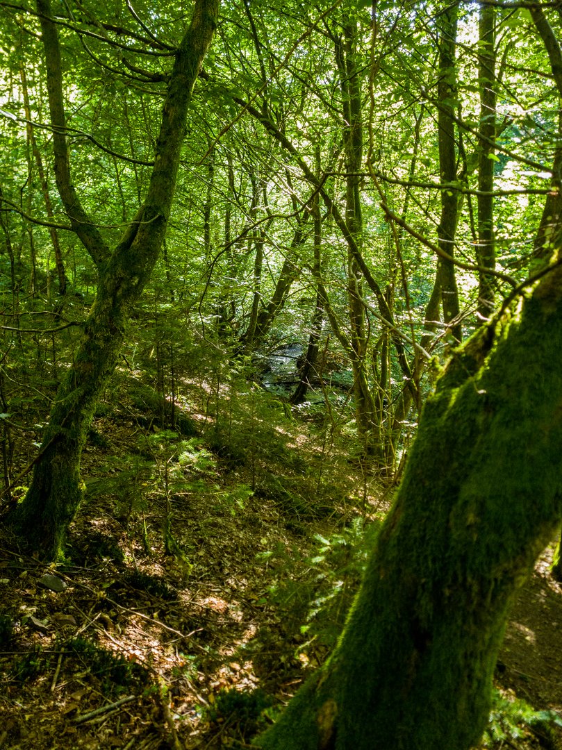 Der Weg ging direkt sehr schön weiter und ich lief auf schmalen Singletrails durch einen mystisch-stillen Wald. Am Kneipbecken am Holzbach tauschte ich das braune Wasser gegen klares Wasser. Das bekam auch meinem Magen besser. Ich folgte weiter den Schilden des Saar-Hunsrück-Steigs, vom Saarlandrundwanderweg war leider immer noch nichts zu sehen. Genauso wenig wie vom Wild im Wildpark Rappweiler. Dafür sah ich den ersten Schwarzspecht in meinem Leben.
