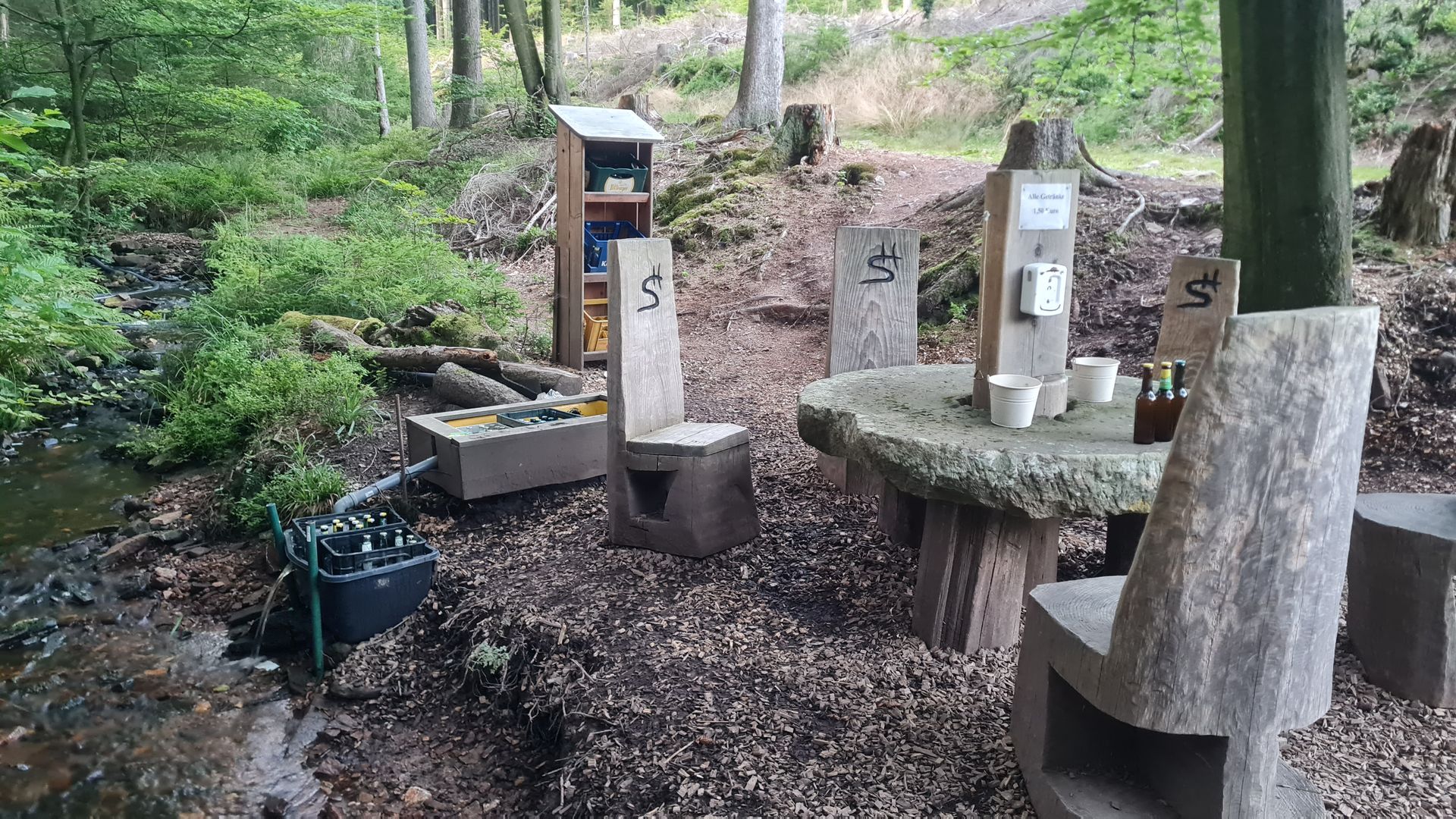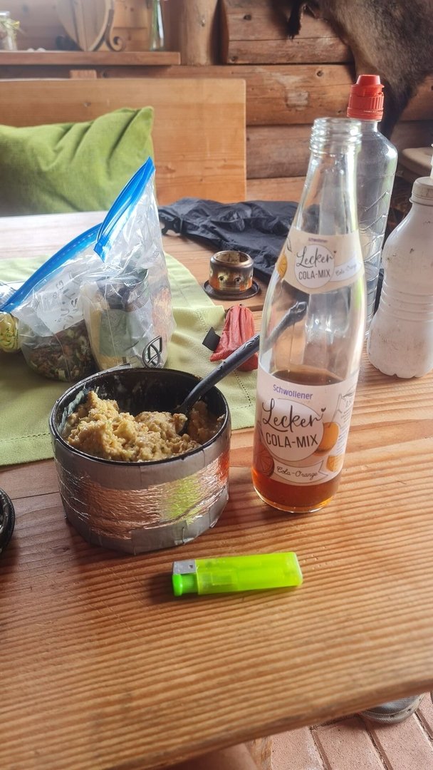 Die nächsten 10 km zogen sich wie Kaugummi. Ich merkte, dass ich kaum was gegessen hatte und quälte mich die eigentlich sehr schönen Wege entlang. Dazu fing es ganz leicht an zu regnen. Aber the Trail provides! Und so lief ich, wie schon 2022 auf dem NST, die tolle Wanderhütte bei Reidelbach an. Hier gab es nicht nur kühle Getränke, sondern auch eine Tüte mit mehreren Feuerzeugen. Ich nahm mir eins mit und schmiss dafür noch etwas Geld in die Kasse. Und jetzt gab es auch endlich was Warmes zu Essen - Couscous-Curry mit Kokosnusspulver, gefriergetrockneten Suppengrün, Röstzwiebeln und Sojaflocken. Das brachte mich wieder auf Touren.