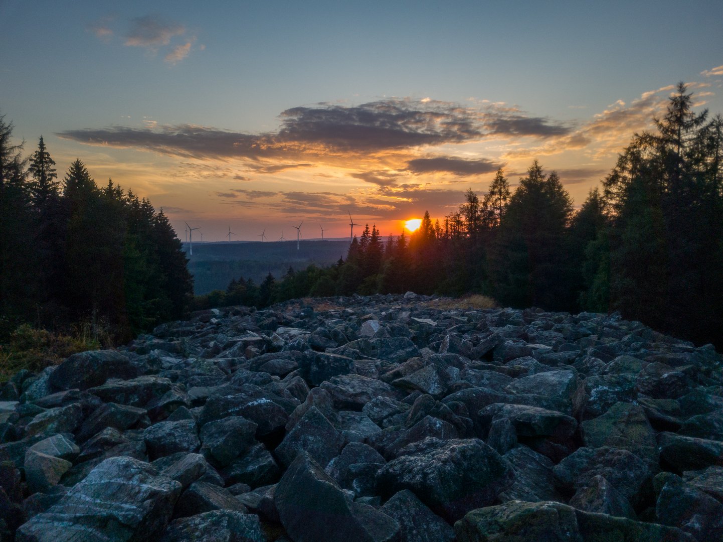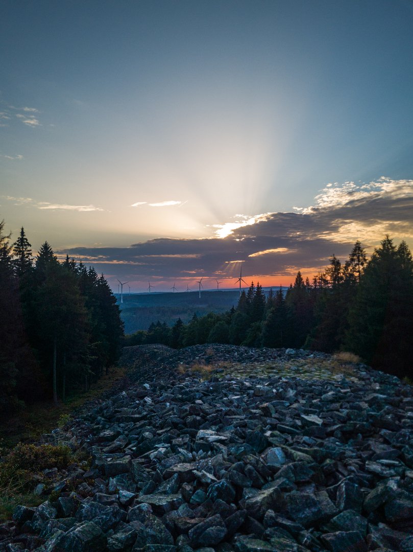 Der Anstieg auf den Schreck (535 m) gehörte zu den steileren meiner Wanderkarriere. Oben gab es dann leider keinen Ausblick, dafür aber einen tollen Wald und angenehme Stille. Anschließend ging es durch Nonnweiler durch und hoch zur Talsperre. Hier gab es noch eine kurze Pause und das offene Klo des Kiosks. Mit vollen Wasserreserven griff ich den letzten Anstieg zum Hunnenring an. Oben angekommen, war ich völlig fertig. Knapp 38 km waren einfach zu viel. Als Entschädigung gab es dafür einen wunderbaren Sonnenuntergang und frisch gekochtes (!) Abendessen ganz oben auf dem Ringwall. Anschließend ging es völlig platt in die nahegelegene Schutzhütte, wo ich schnell einschlief.