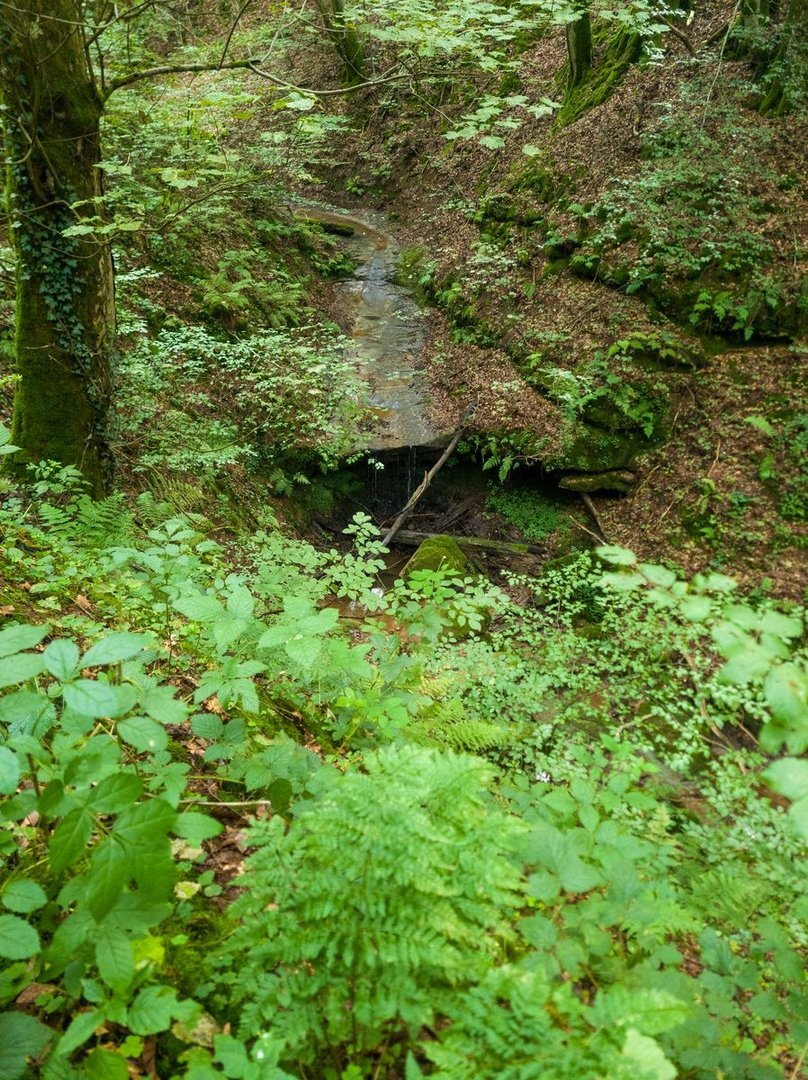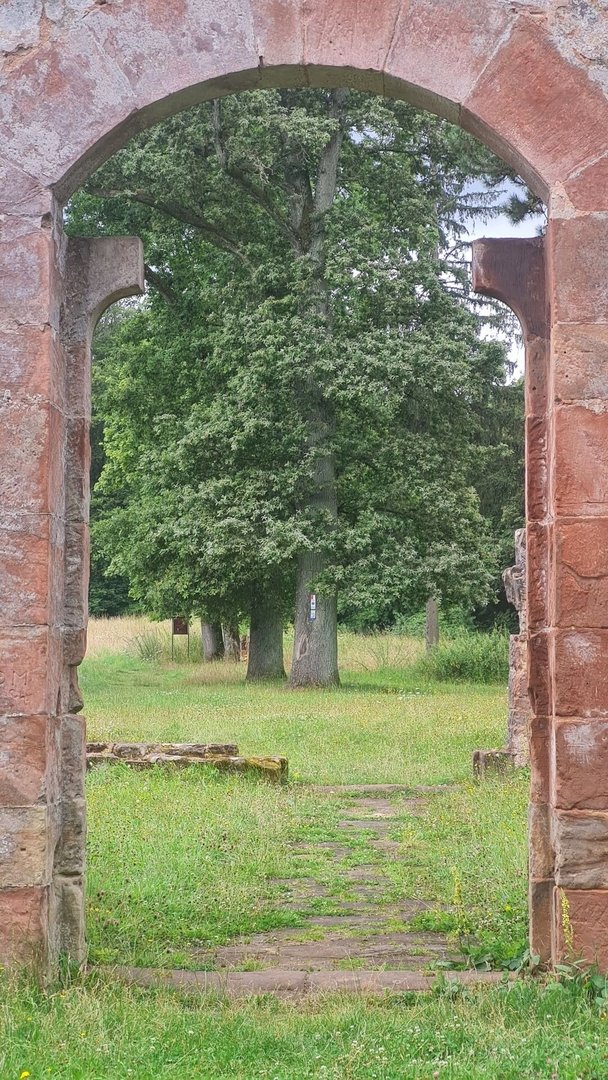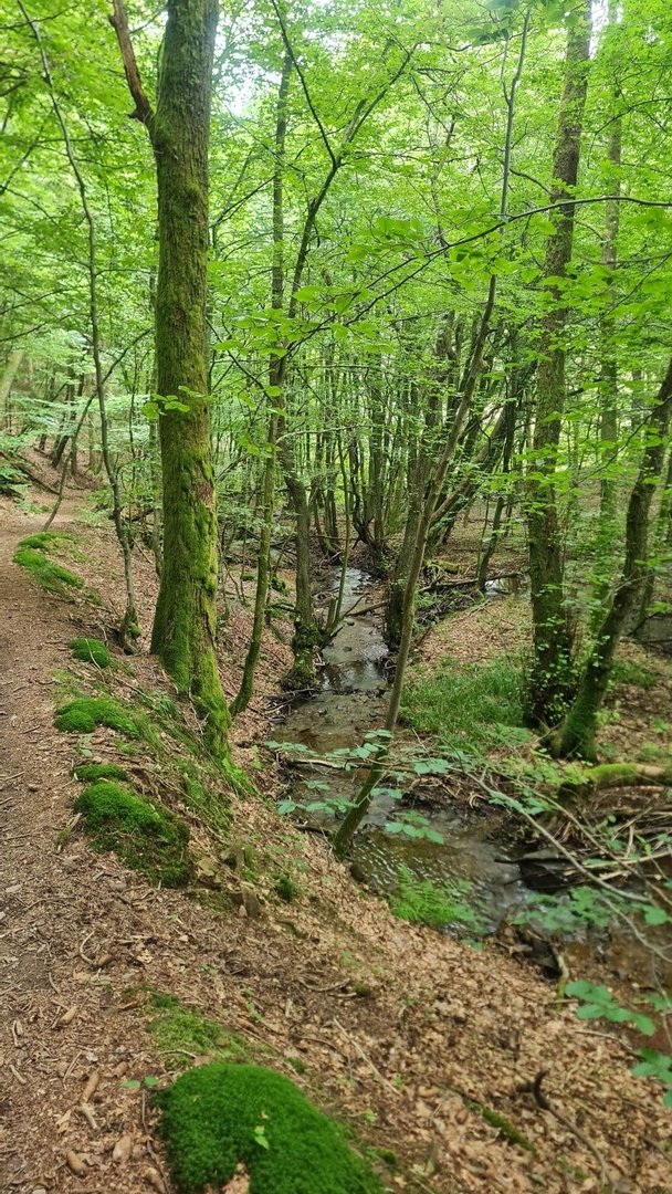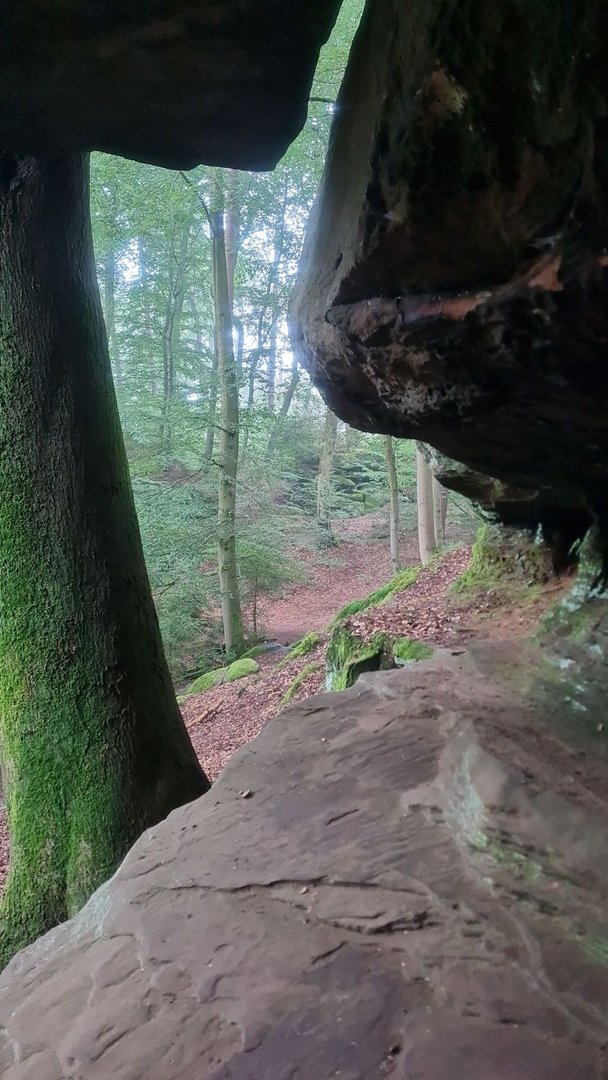 Das alles klang jetzt sehr negativ. Warum soll das dann der schönste Wandertag überhaupt sein? Aus zwei Gründen: dem Weg und dem nächsten Schlafspot. Zunächst zum Weg - dieser ist einfach nur wunderschön! Bis auf ganz wenige Stellen läuft man den ganzen Tag Singeletrails und schmale Pfade. Das erste Highlight war dabei das Lambachstal. Auf einem schmalen Pfad, weit über dem Talgrund, lief ich an vermoosten Buntsandsteinfelsen vorbei. Dabei scheuchte ich in einiger Entfernung eine Rotte Wildschweine auf. Nach einem knackigem Aufstieg zum Berghof Einöd, mit tollen Blicken zurück auf die Burgruine Homburg, ging es durch das nächste schöne Bachtal, dem Pfänderbachtal. Hier hat sich der Bach tief in den Boden eingefressen. Etwas versteckt, konnte ich hier auch einen kleinen Wasserfall entdecken. Es folgte der steilste Aufstieg der Tour zur Klosterruine Wörschweiler. Auch hier gab es einen tollen Blick zurück auf die bereits erwanderte Strecke.