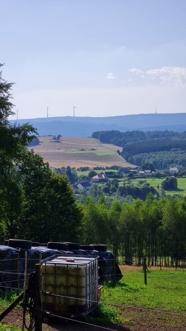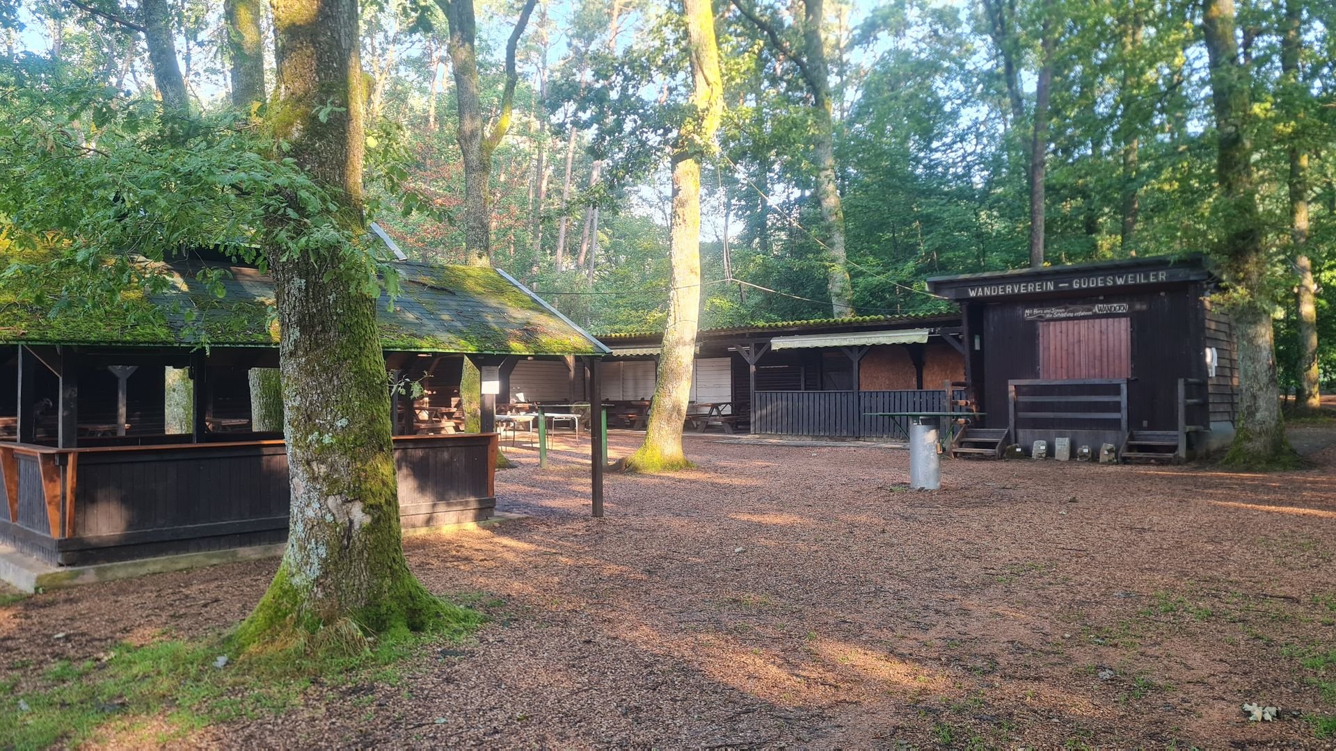 Ein kurzes Stück ging es noch an der Nahe entlang, die hier nur ein kleiner Bach war. Anschließend umrundete ich den Leißberg, einem alten Vulkan (übrigens ein Rhyolith) mit tollen Fernsichten und wollte am Friedhof von Güdesweiler noch kurz Wasser holen. Das Wasser war aber seltsam trüb - nein danke. Ich telefonierte dabei noch parallel mit meiner Freundin als plötzlich die Welt unterging. Ein Gewitter direkt über mir mit sintflutartigen Regenfällen. Ich rettete mich noch unter ein Vordach der Friedhofskapelle und wartete erstmal ab. Bis zur anvisierten Hütte wäre es noch eine Stunde Fußmarsch. Mit klitschnassen Schuhen hatte ich jetzt nicht so wirklich Lust darauf. Egal weiter. 100 m später sehe ich ein großes Schild, das eine Rast für Wanderer versprach. Ich hatte die Hüttenanlage des Güdesheimer Wandervereins gefunden. Und die sah nicht schlecht aus. Als ich dann noch eine offene, saubere und funktionierende Toilette fand, war die Entscheidung gefallen. Ich würde hier bleiben.