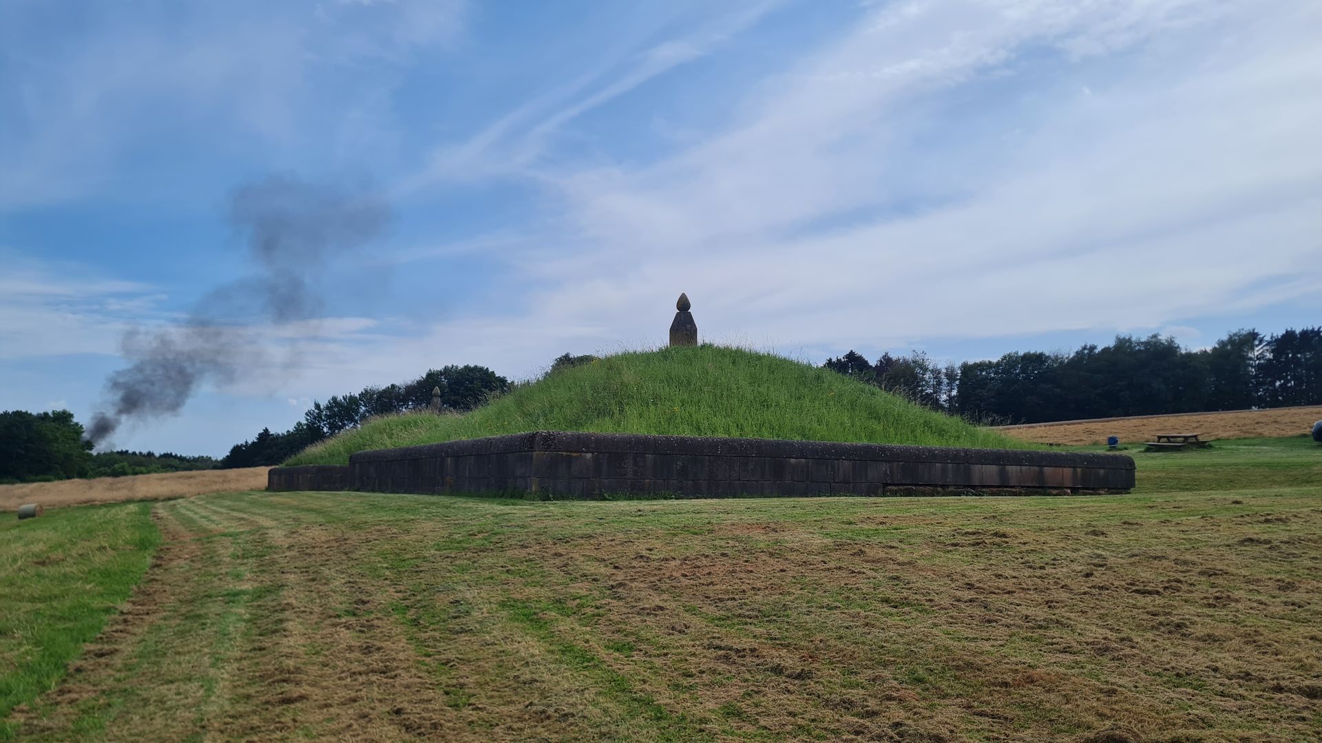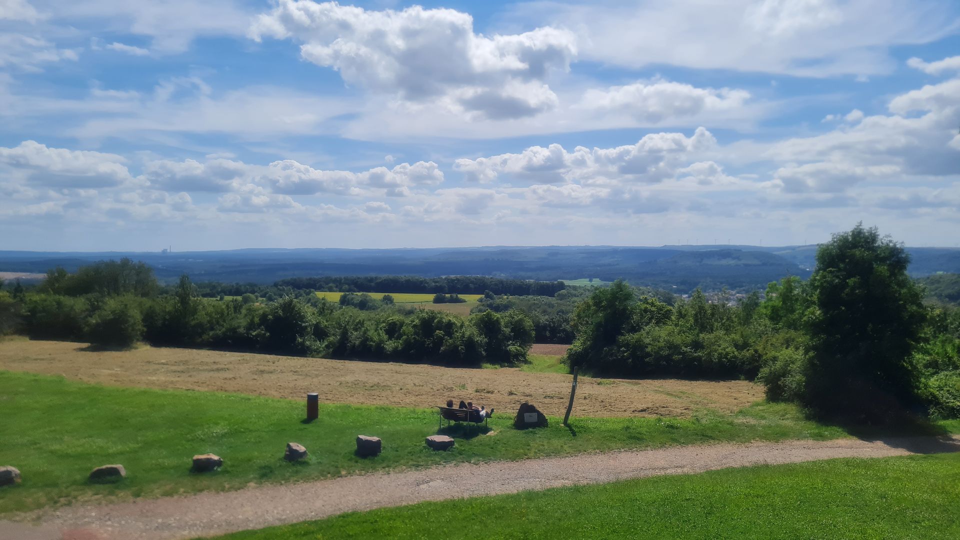 Nach der Unterquerung der Bundesstraße standen wir plötzlich wieder auf einem wunderschönen Singletrail. Ein wirklich schöner Weg. Dann wurden wir leider einmal längs durch den Ort Überherrn geführt, obwohl es eine schöne Alternative durch das Bisttal gegeben hätte. Das hatten wir leider zu spät gesehen. So steuerten wir stattdessen den Rewe an und kauften ein paar frische Sachen fürs Mittagessen. Für diese Pause hatten wir uns das Europadenkmal ausgeguckt. Dazwischen lag noch ein kräftiger Anstieg, der sich ordentlich zog. Oben angekommen, war die Pause dann bitter nötig. Vom Denkmal aus, hat man leider keine schöne Rundumsicht (dafür ist das Denkmal leider viel zu niedrig), man blickt viel mehr nur nach Frankreich - trotzdem sehr schön!