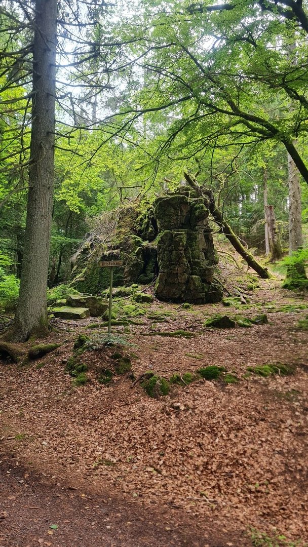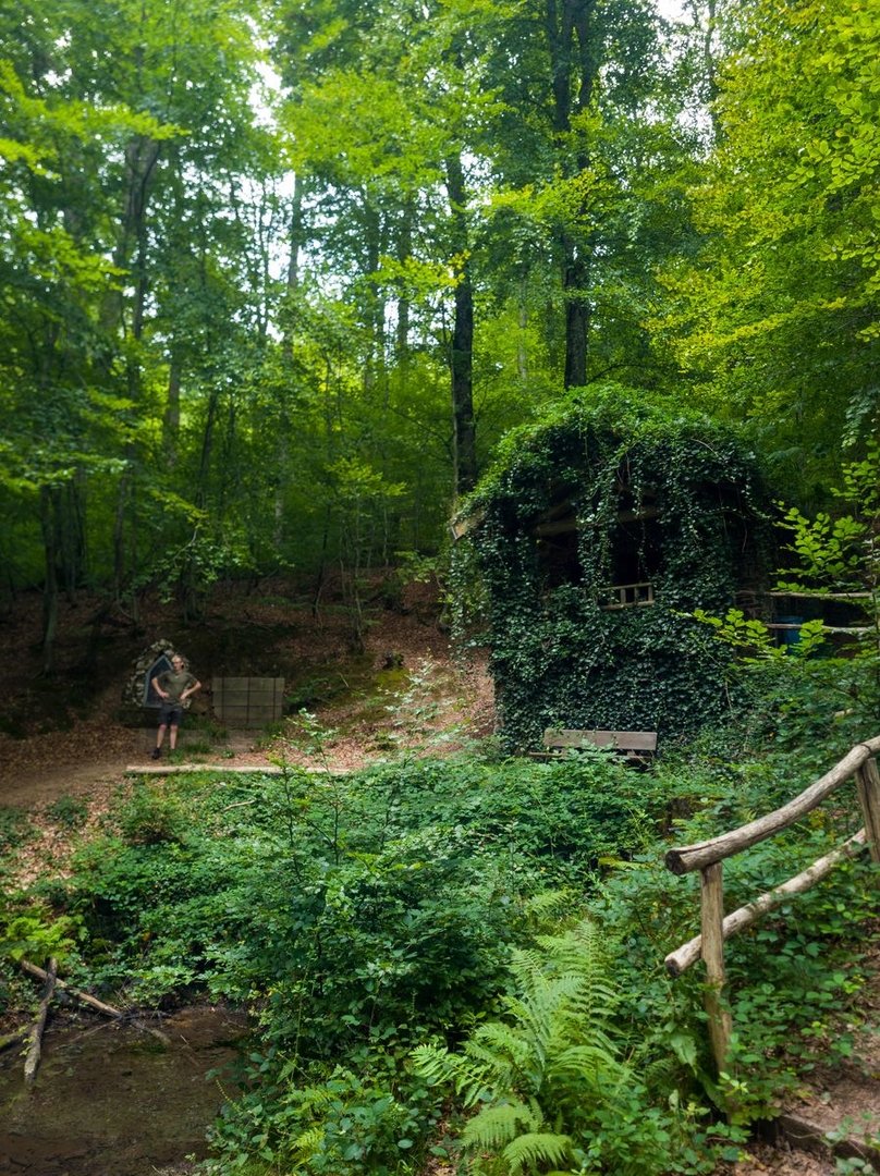 Es folgten die Überquerung der A8 und ein kurzes Stück entlang einer Landstraße. Auch sowas gehört leider mal zu einem sonst so schönen Wanderweg. Das war aber alles wieder schnell vergessen, als es wieder in den Wald hineinging. Direkt war es wieder einsam und ruhig. Auf der Karte hatte ich gesehen, dass es am Ende des rund 2 km langen Anstiegs eine Pausenmöglichkeit am Johannisbrunnen geben würde. Das gab uns nochmal neue Kräfte. Oben angekommen, konnten wir unseren Augen nicht wirklich glauben. Der Johannisbrunnen entpuppte sich nämlich als steinerne, verwunschene Hütte mit eigener Wasserquelle und tollen Sitzmöglichkeiten. Dazu absolute Stille und Einsamkeit. Wäre unser Ziel nicht die Saarschleife gewesen, wären wir für die Nacht auf jeden Fall hier geblieben.