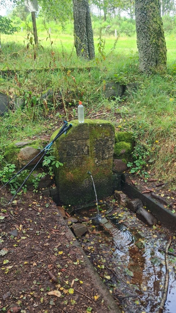 Im nächsten Ort steuerte ich den Friedhof an. Ich brauchte neues Wasser und wollte dem stärker werdenden Regen entkommen. So gab es erst mal Mittagsessen, ehe es nach einer guten Stunde weiter ging. Der Weg verlief nun größtenteils auf Asphalt. Das wunderte mich nicht, denn nun war ich im St. Wendeler Land. Die Wanderwege bieten unglaubliche Panoramen, aber eben oft auf befestigten Straßen. Mich störte es nicht. Am Petersberg unterhalb der Peterskapelle konnte ich am Grindborn frisches Quellwasser tanken.