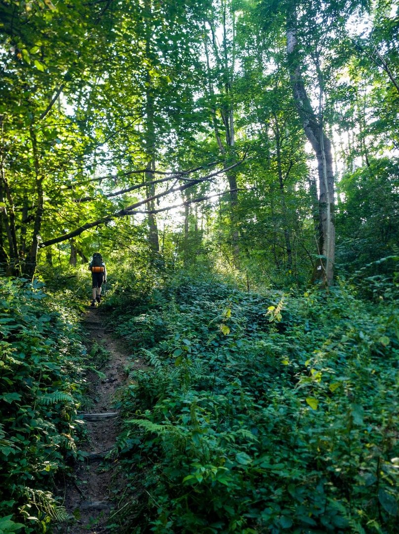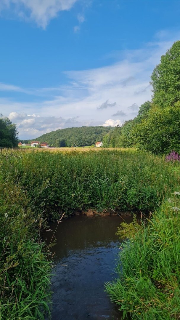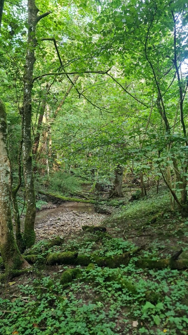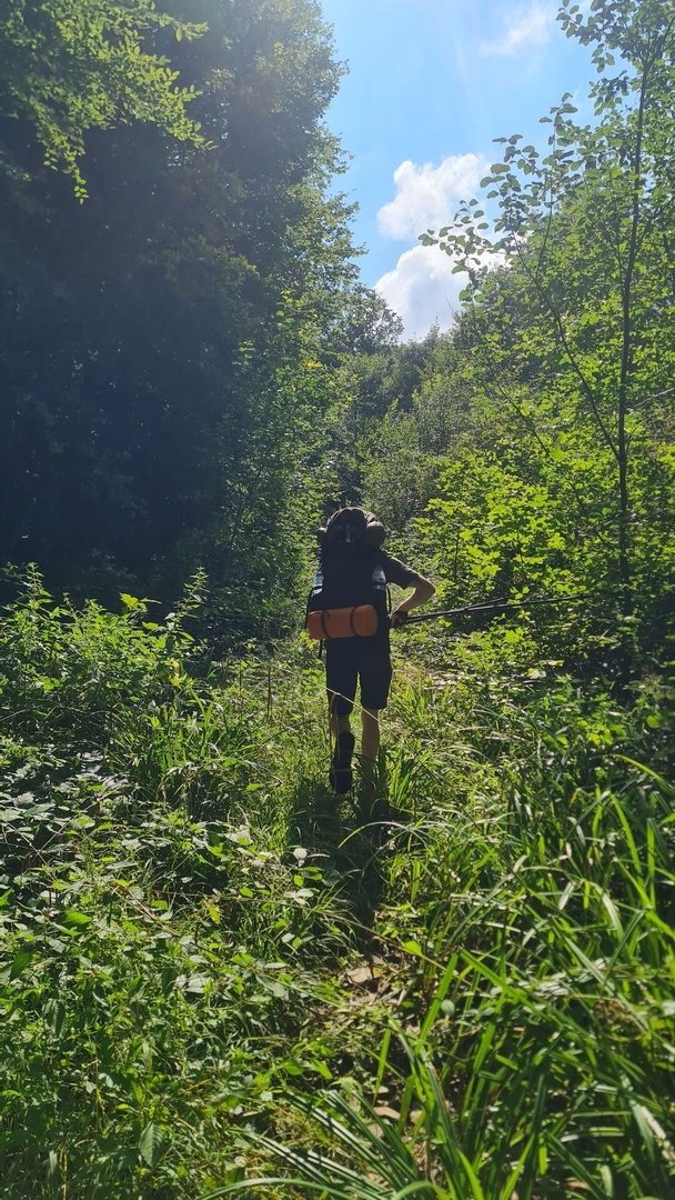 Bei Großrosseln wartete ich dann auf den Bus. Wegfahren wollte ich nicht. Viel mehr wartete ich auf einen Kumpel, der mich für die letzten Tage begleiten würde. Ich freute mich sehr darauf, meinen Kumpel wiederzusehen und diesen schönen Weg mit jemanden teilen zu können. Direkt ging es auf einen wilden Pfad, der kaum noch zu erkennen war. Ein guter Start! Und wie schon den ganzen Tag ging es weiter durch den wilden saarländischen Wald. Die Kilometer flogen nur so dahin. In St. Nikolaus konnten wir an einem Trinkwasserbrunnen direkt am schönen Weiher unser Wasser auffüllen. Anschließend folgte ein wunderschönes Tal, durch das wir immer höher stiegen.
