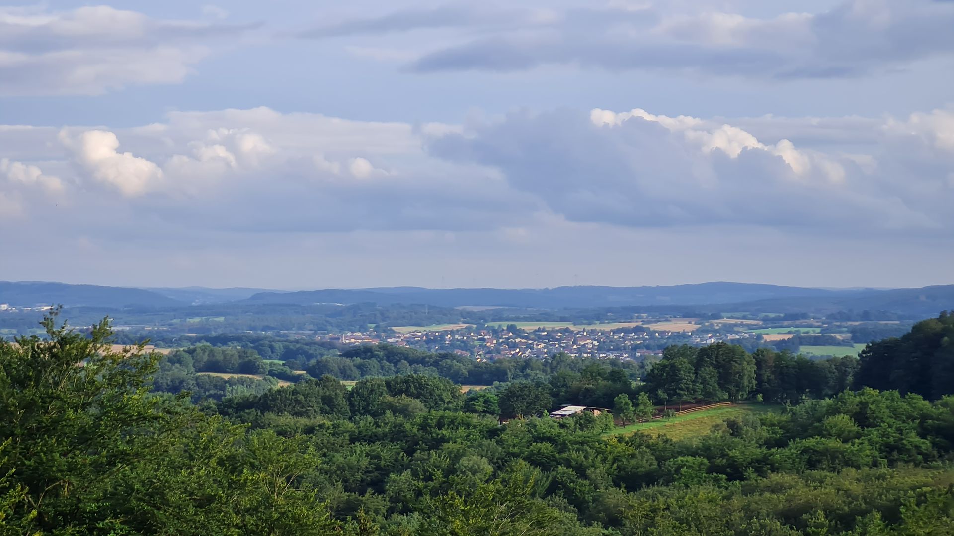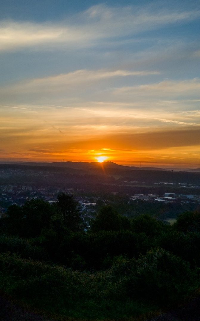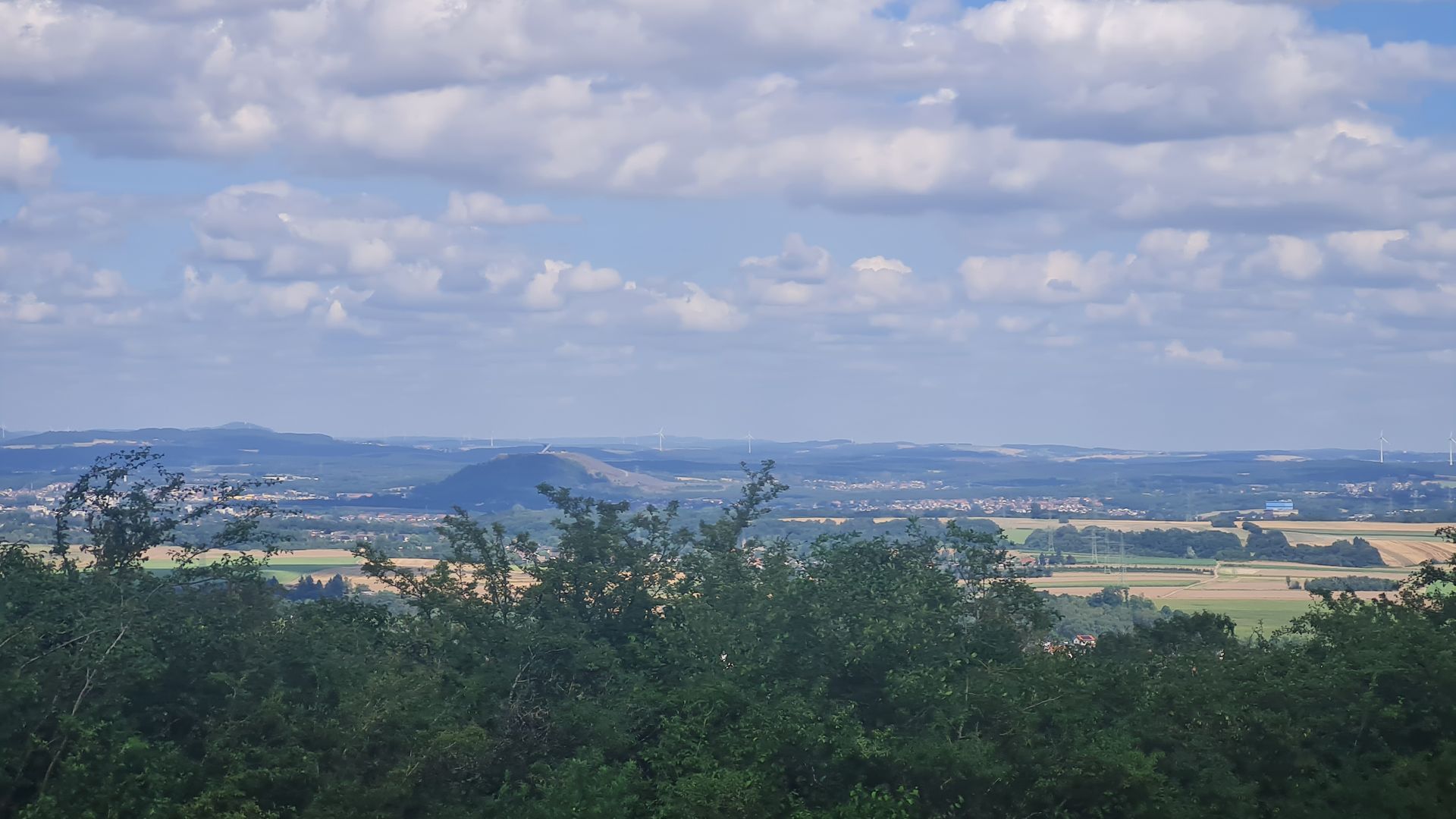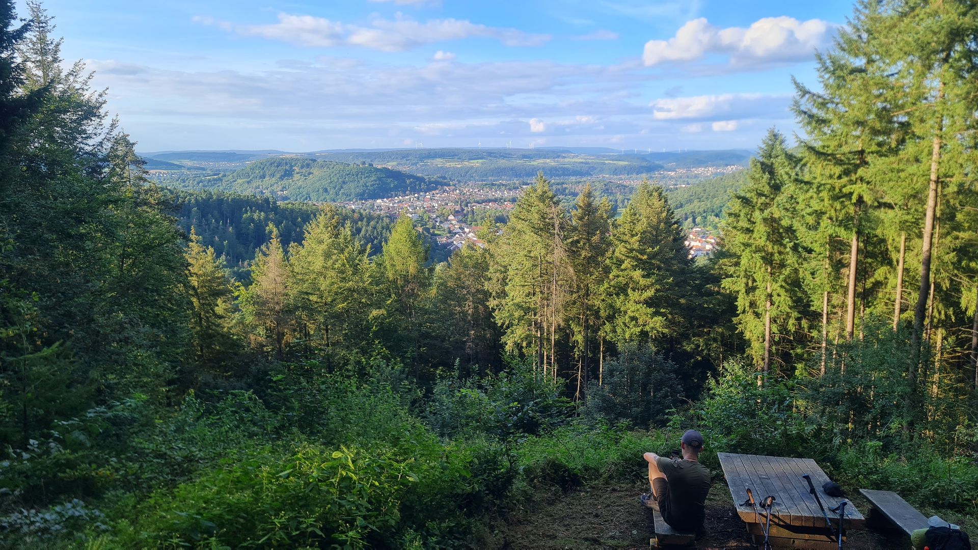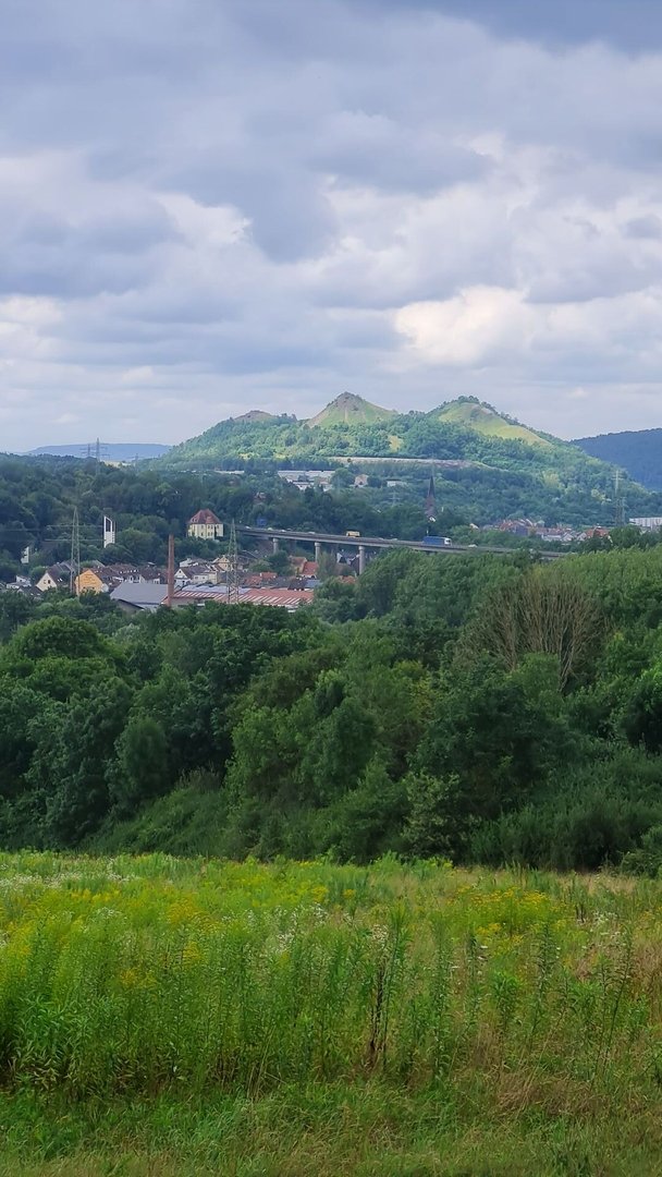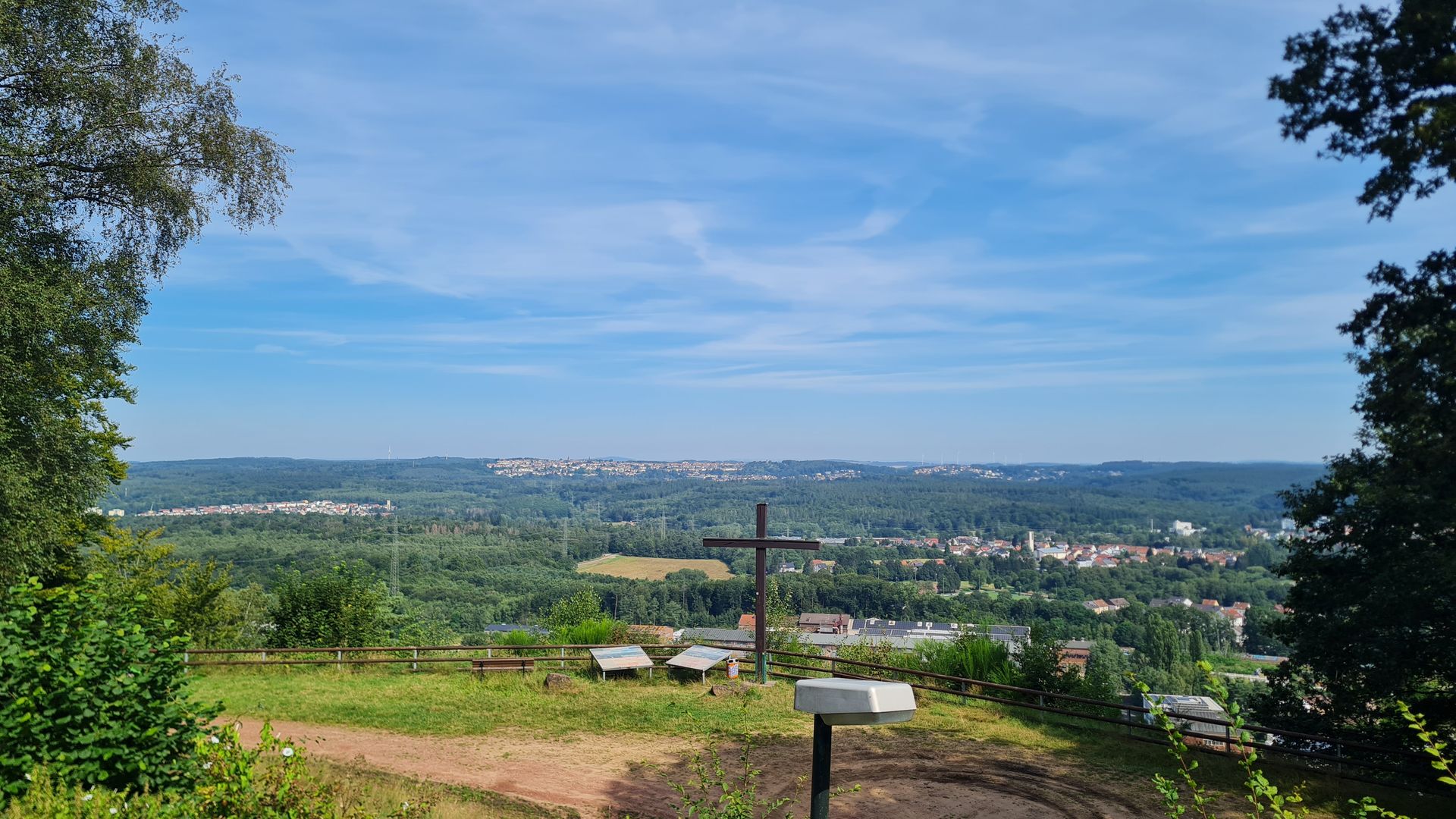 Als das Orgelspiel vorbei war, zog ich weiter zum Supermarkt, vertrödelte noch Zeit beim Bäcker, um weiter Strom zu laden und machte mich dann weiter. Steil und immer steiler führte mich der Weg aus dem Ort raus, bis ich bei einem Aussichtspunkt einen spektakulären Ausblick über St. Wendel genießen konnte.