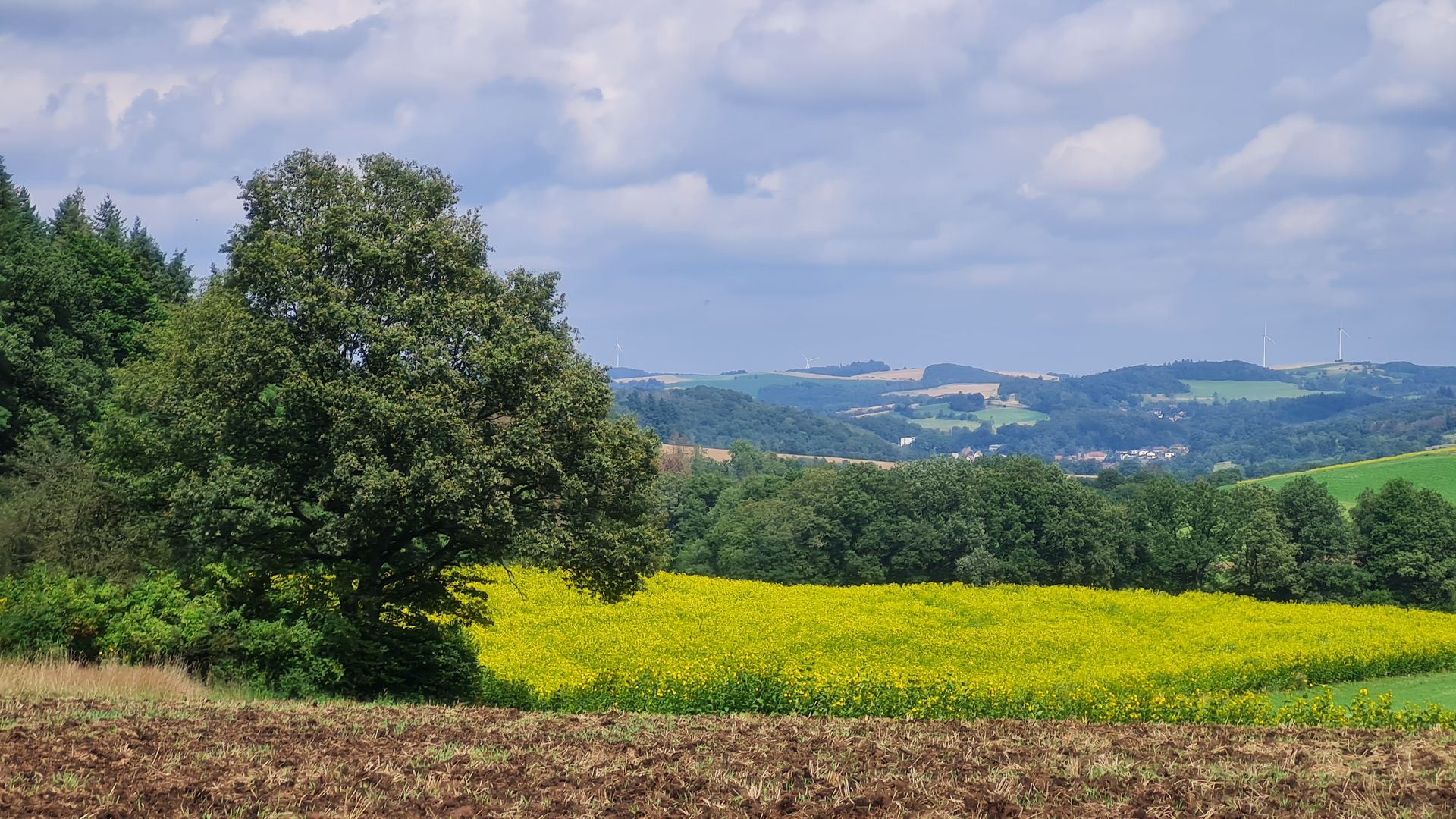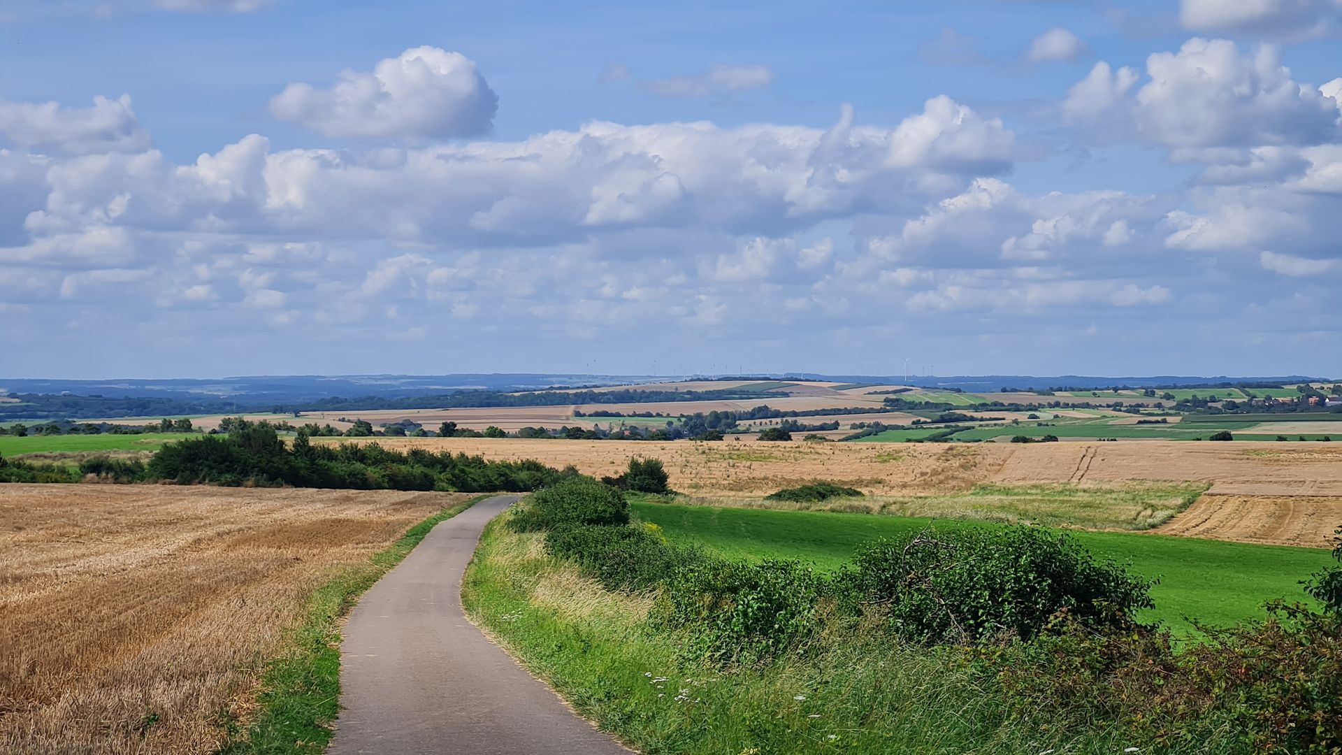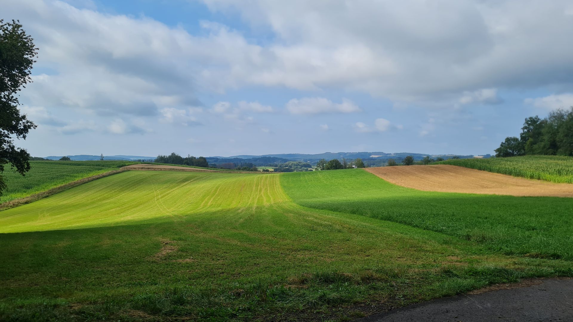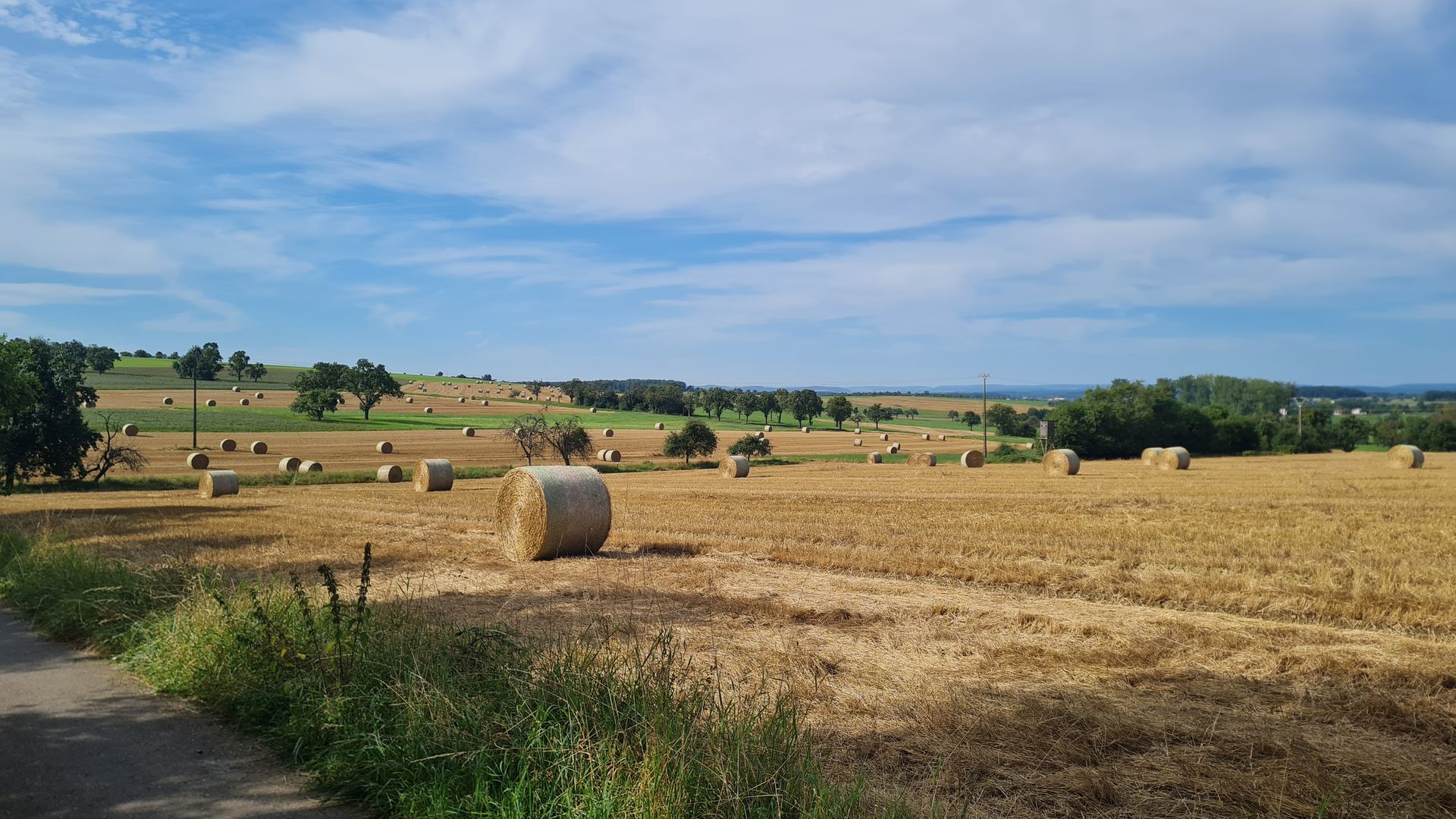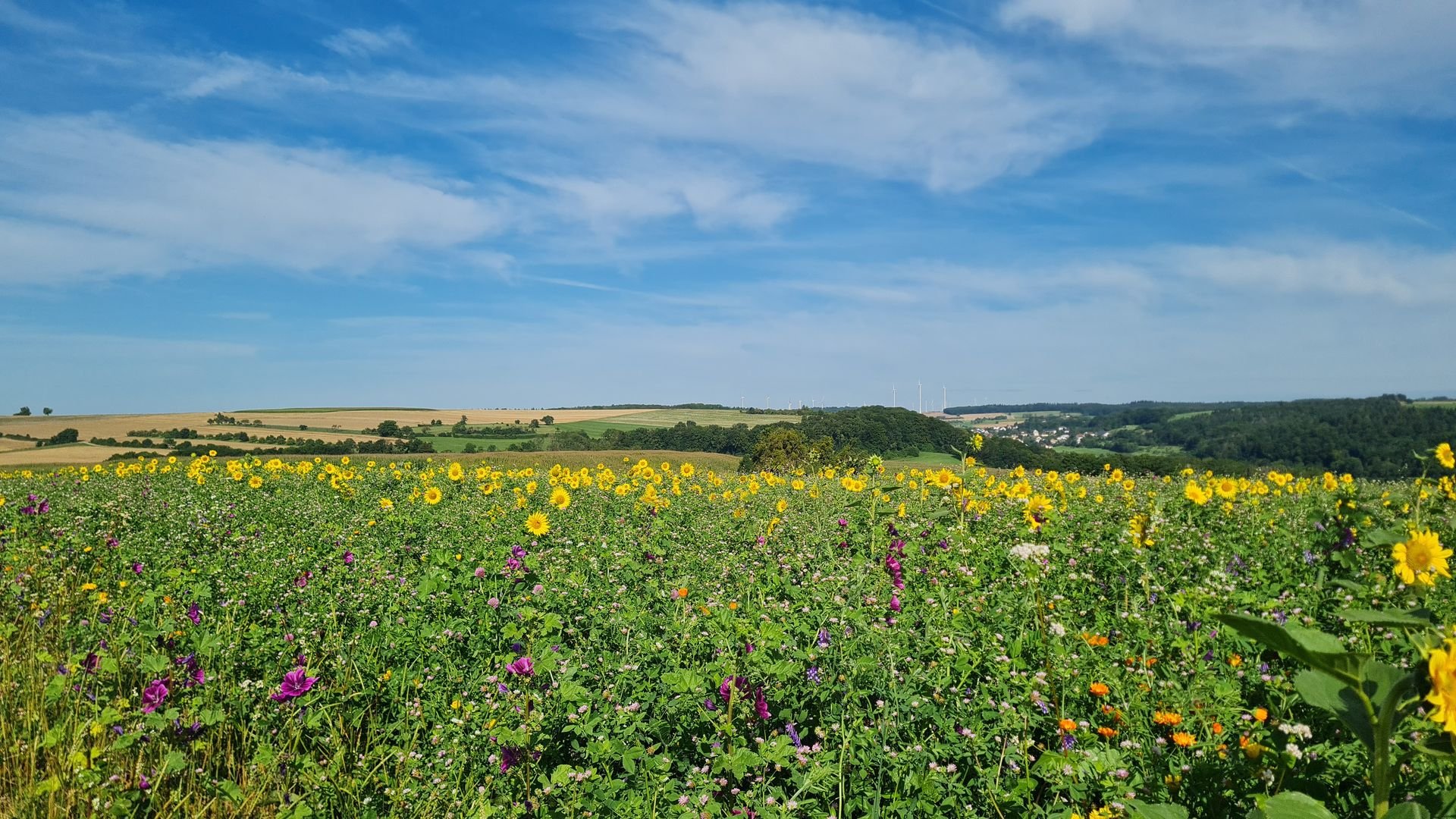 Frisch gestärkt ging es nun in die nächste Region des Saarlands, den Saargau. Diese Kulturlandschaft, wird, was das Wandern angeht, die Community wahrscheinlich in zwei Teile spalten. Ich finde solche Wege klasse, andere werden sie hassen. Durch den Saargau liefen wir nämlich hauptsächlich auf Asphalt durch eine geschwungene Hügellandschaft voller Getreidefelder und alten Obstplantagen. Dazu gab es viel Sonne von oben und nur wenig Schatten. Aber dafür gab es auch dauerhaft Ausblicke und tolle Fernsichten über die hügelige Landschaft. Ständig blieben wir stehen und mussten unsere Blicke schweifen lassen. Einfach toll! Teilweise ging es dann sogar noch an blühenden Sonnenblumenfeldern vorbei. Uns hat der Abschnitt total Spaß gemacht.
