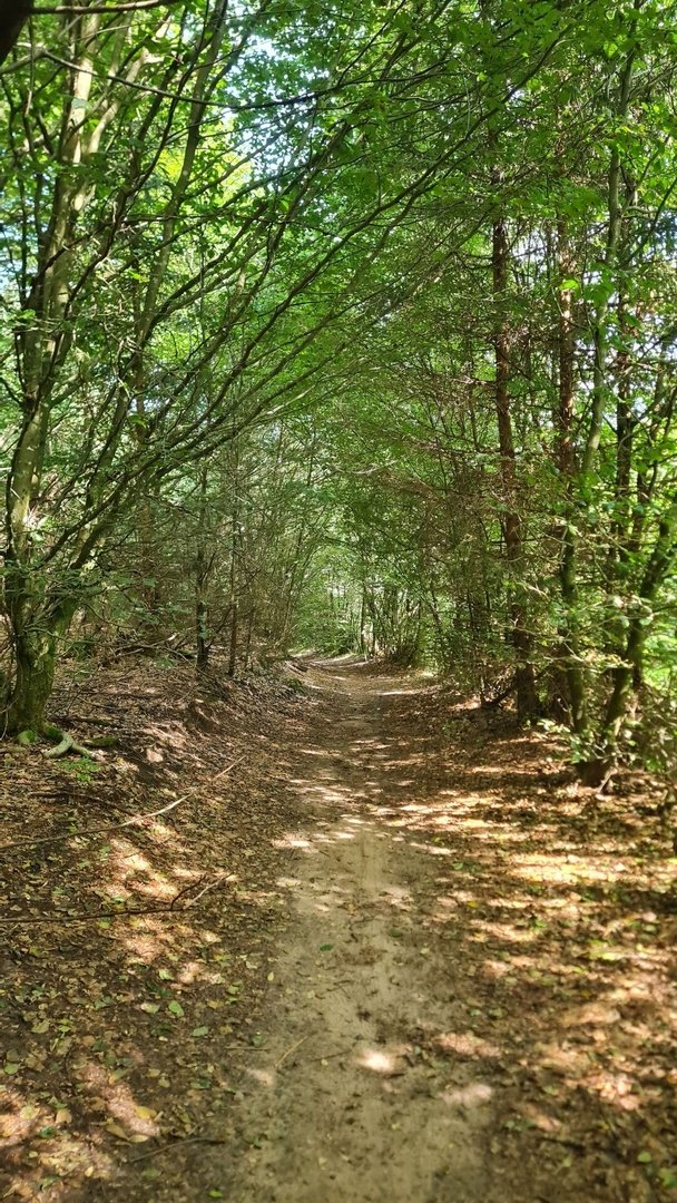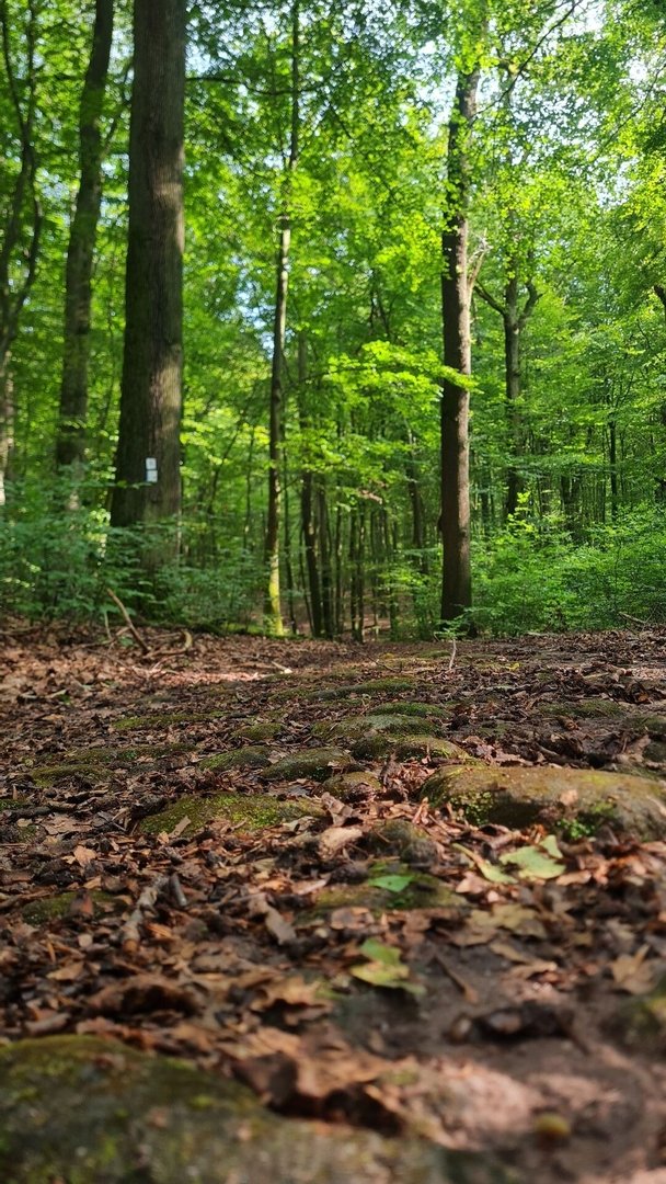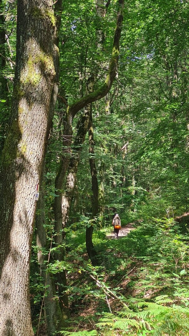 Kurz nach einem Wald und tollen Aussichten erreichte ich Furth, wo ich kurz mein Wasser auffüllte. Hinter dem Ort lief ich zunächst durch einen Dschungelpfad mit tief hängenden Brennnesseln, ehe ich in einen Wald abbog. Und plötzlich stand ich auf einer uralten gepflasterten Straße, die mich steil den Berg hochführte. Oben erfuhr ich, dass dieser Weg wohl rund 450 Jahre alt sein soll. Ein kurzes, aber tolles Highlight des Tages.