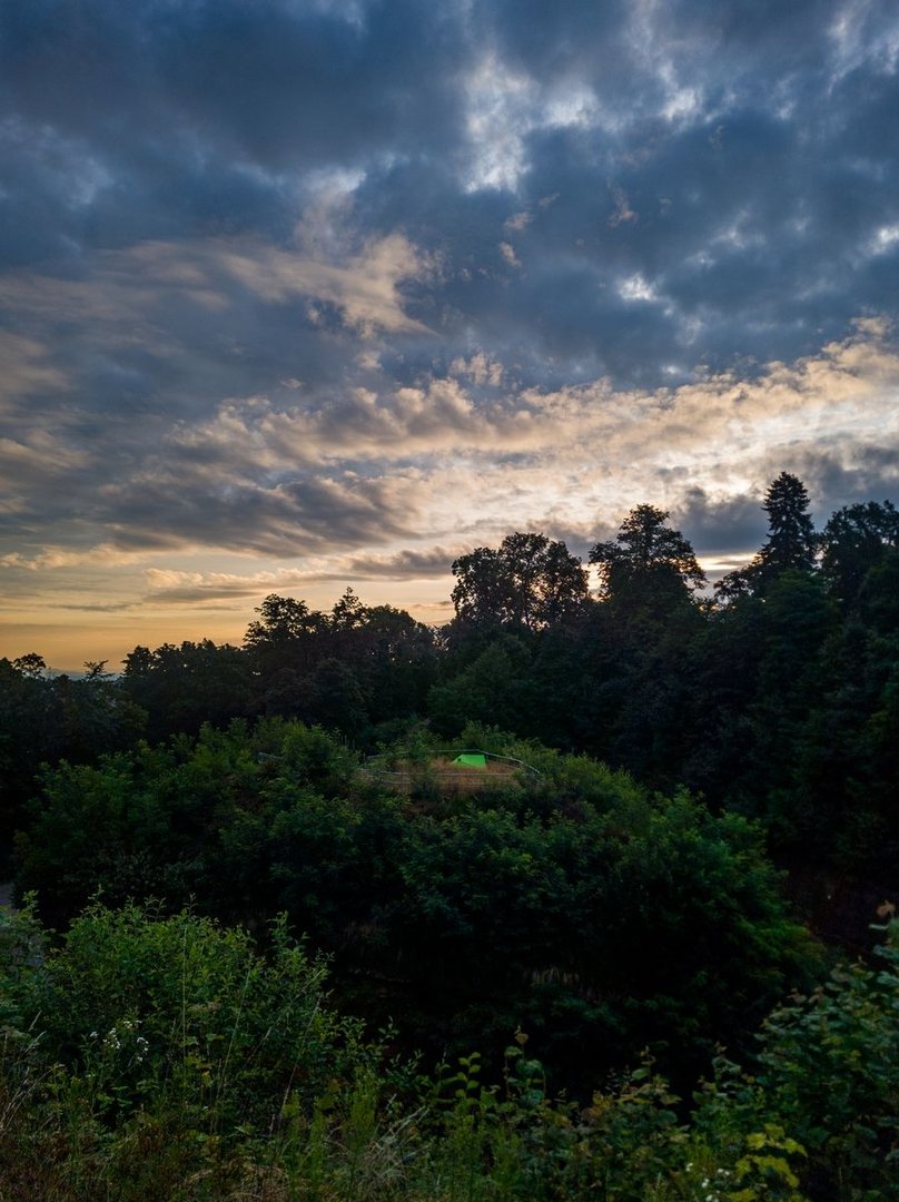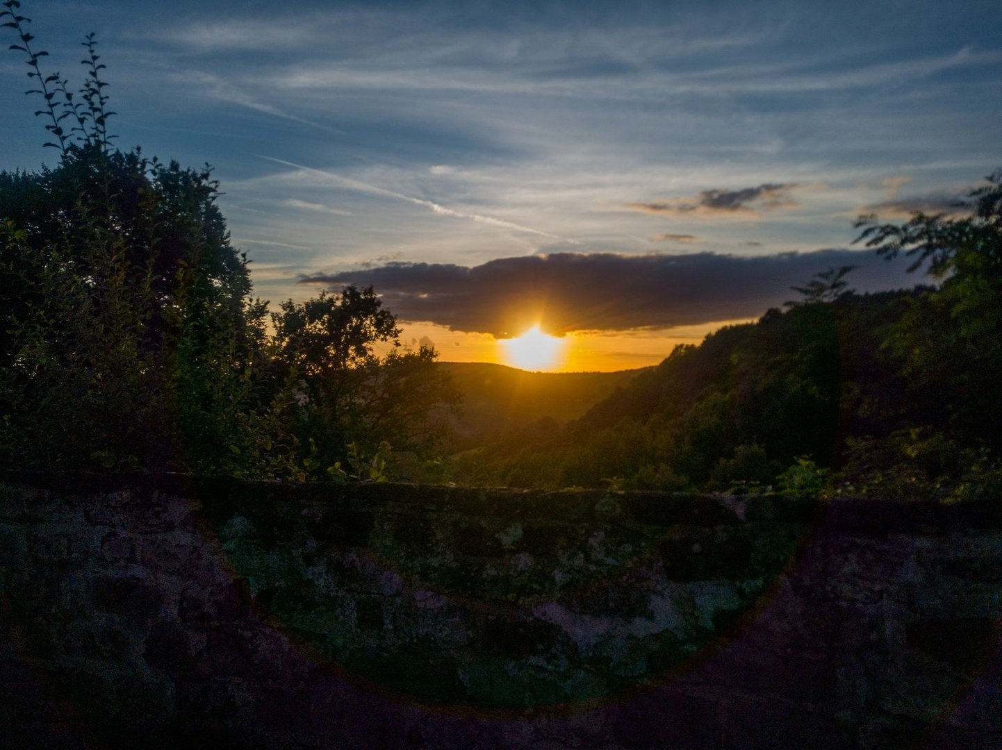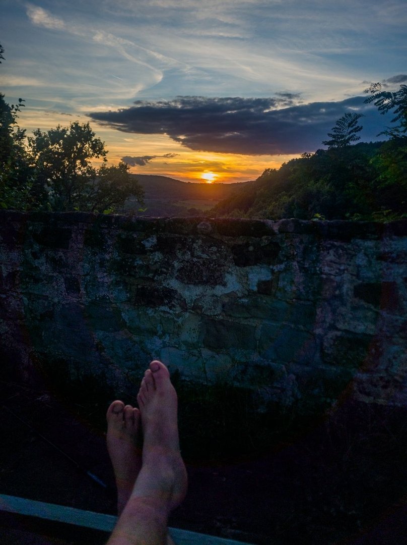 Der Weg, der folgte, war tatsächlich nochmal sehr schön. Durch einen Wald, der fast genauso aussah wie der Pfälzer Wald - sandiger Boden, Buntsandsteinfelsen und jede Menge Kiefern ging es runter bis nach Siersburg. Dabei gab es keinen guten Spot, wo wir mein Tarp hätten aufspannen können. Also schnell weiter. Wir hatten uns zudem auf den Sonnenuntergang gefreut. So gaben wir nochmal richtig Gas und liefen die Berge hinunter - quasi Speedhiking. Nichtmal die gesperrte Brücke an der Hessmühle konnte uns aufhalten. Wir kletterten einfach drüber. Und so schafften wir es doch noch rechtzeitig, kurz bevor der Himmel in ein sattes Orange getaucht wurde, die Siersburg. Nach insgesamt und dazu ungeplanten 38 km, bot sich uns ein tolles Spektakel an einem der schönsten Spots, wo ich bis jetzt schlafen konnte! Die Burg liegt so weit oben (und übrigens nicht im NSG), dass man quasi eine 360° Sicht auf die Umgebung hat. Auf der einen Seite ging die Sonne hinter waldigen Hügeln unter, auf der anderen Seite konnten wir tief ins Saartal blicken. Und wieder sahen wir den Kontrast zwischen wilder Natur und Hochindustrie. Und jetzt konnte ich auch einordnen, woran mich dies erinnerte. Dies war ein Setting, wie es gut in einen Studio Gibhli Film passen würde. In den japanischen Anime-Filmen wird nämlich sehr gerne mit genau solchen Elementen aus Natur und Industrie gespielt.