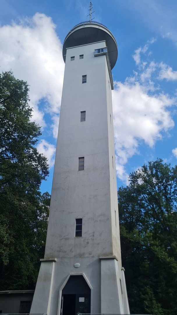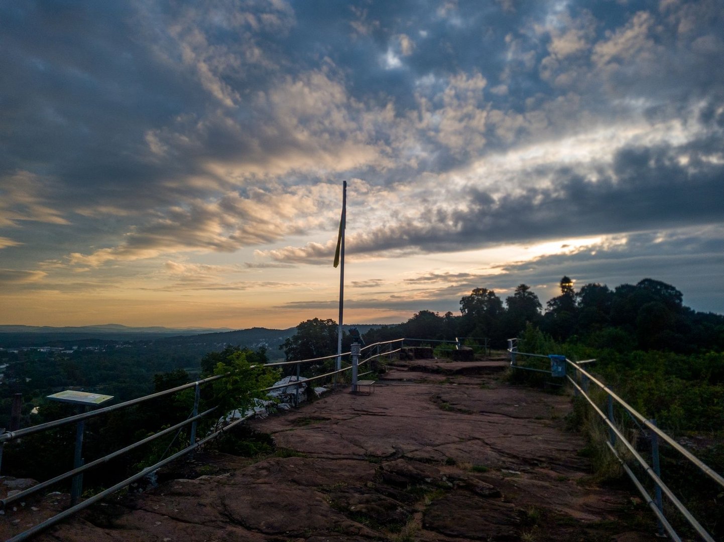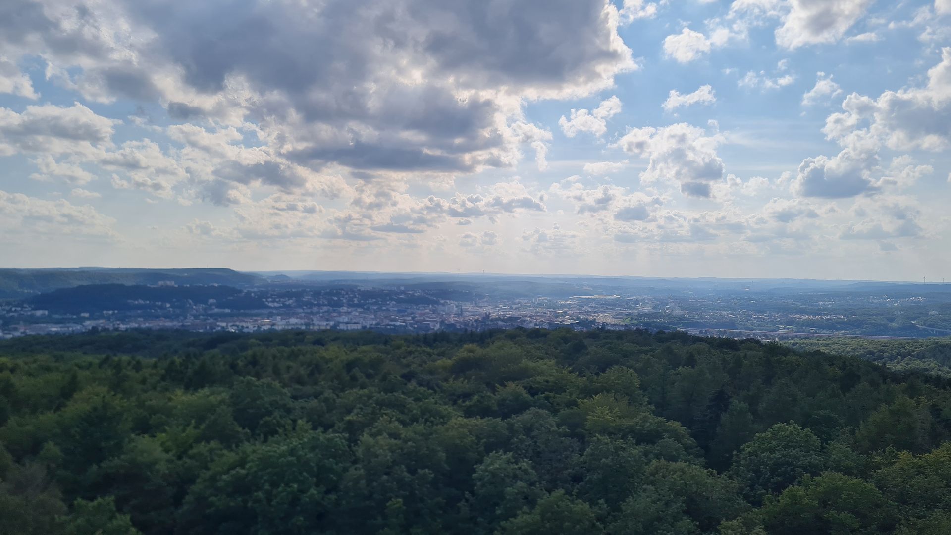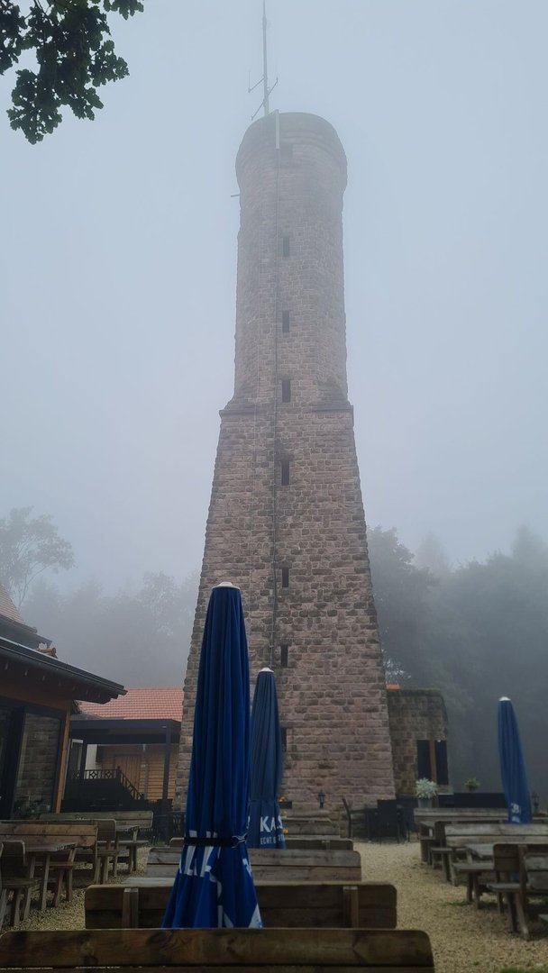 Irgendwo auf diesem Abschnitt meckerte plötzlich mein linker Fuß und irgendwas tat weh. In St. Ingbert stieg ich daher kurz in den Bus und fuhr zur nächsten Apotheke. Ausgestattet mit Ibus und keiner Fußgelenksbandage (über 80€ waren mir einfach zu viel dafür) ging es wieder auf den Trail. Für den Rest des Tages nahm ich die Geschwindigkeit nun fast ganz raus. Nun ging es aus St. Ingbert raus, am großem Stiefel, einer Felsformation, vorbei, Richtung Saarbrücken. Die Wege waren jetzt alle etwas breiter, die Singletrails den Mountainbikern vorbehalten - gut, auch die wollen irgendwo fahren. Das absolute Highlight dieses Abschnittes ist der Schwarzenbergturm. Was ein wahnsinniger Ausblick über die Landschaft, der bei gutem Wetter bis in die Vogesen reicht.