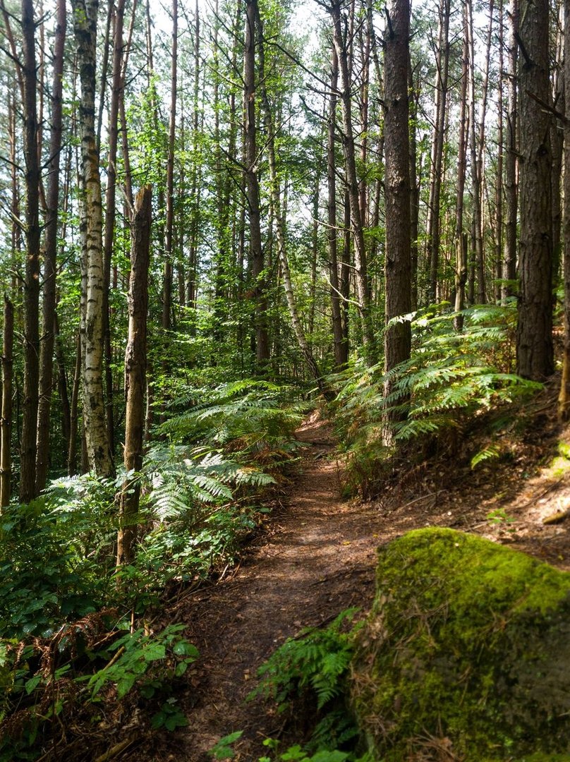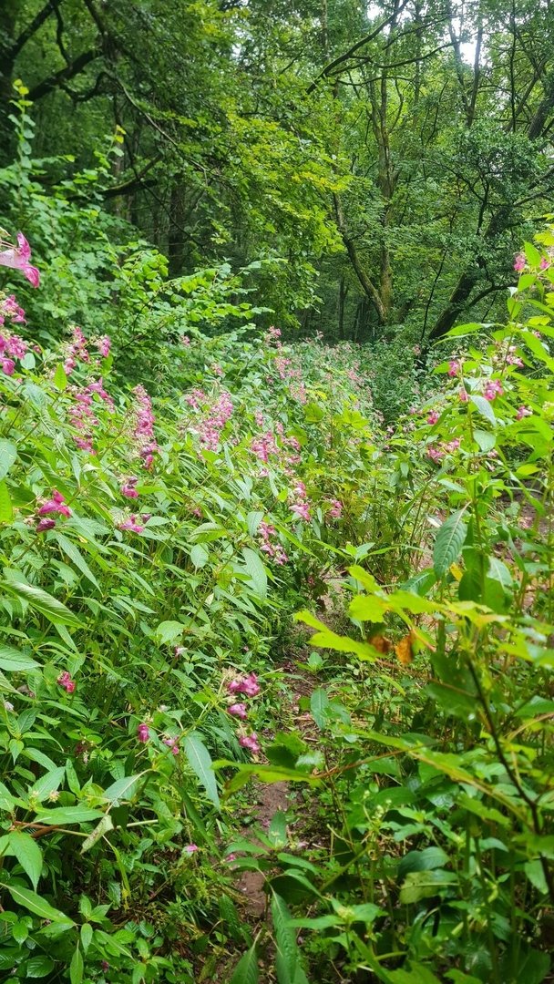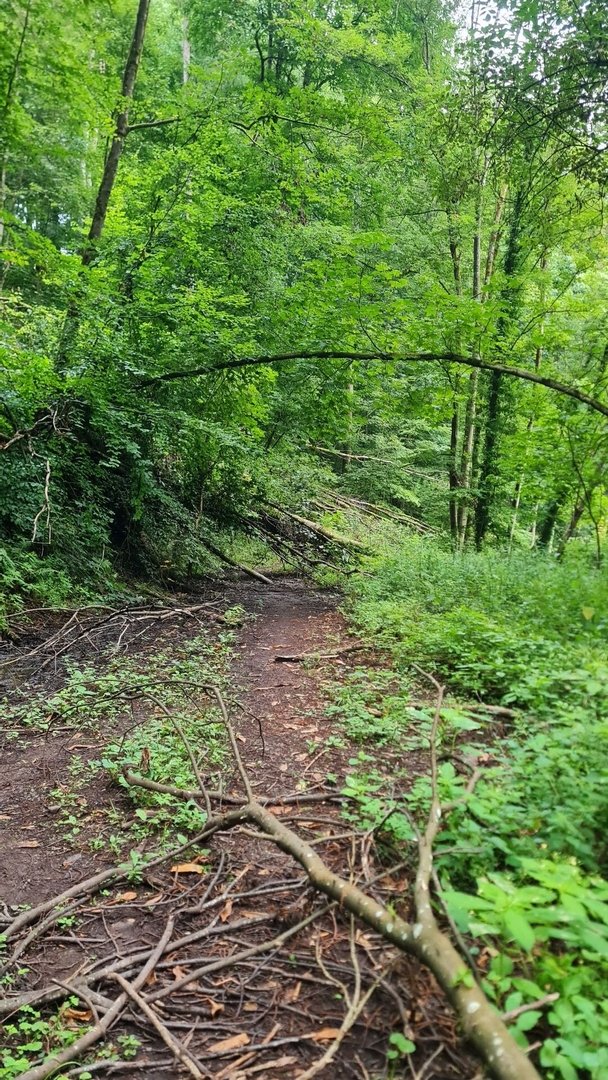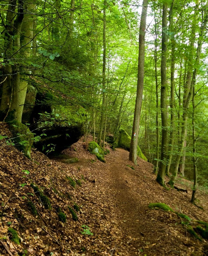 Das große Finale ist dabei der Schmetterlingspfad kurz vor Kirkel. Für 4 km läuft man durch einen grünen Tunnel. Teilweise kann man nur 3 m den Weg vor und hinter sich sehen. Sonst guckt man in Bäume. Der Weg verläuft mitten am Hang, der Talboden ist dabei nicht auszumachen - zu viele Bäume. Das Gleiche über einem - nur zwischendurch befinden sich über einem Buntsandsteinfelsen. So ungefähr stelle ich mir den Appalchian Trail vor! Habe ich erwähnt, dass ich den 1½ Stunden, die ich auf diesem Pfad war, komplett alleine war...