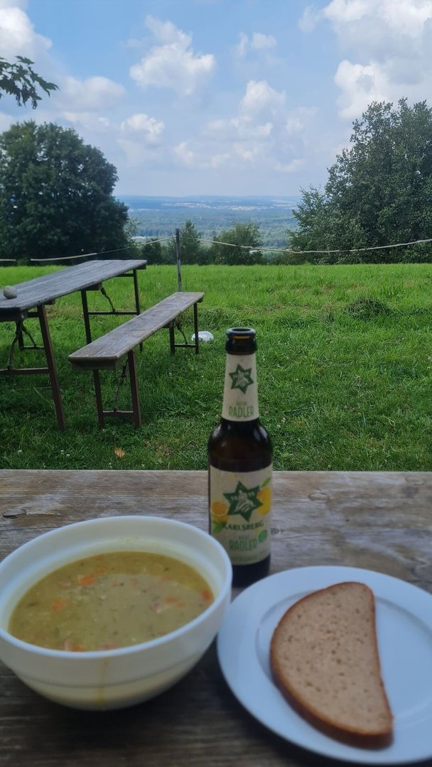 An der Peter Schulzen Hütte, einer Hütte vom Pfälzerwald-Verein, entdeckte ich eine funktionierende Steckdose. So entschied ich mich spontan, meine Powerbank etwas zu laden und mein gesamtes nasses Gerümpel in der immer stärker werdenden Sonne zu trocknen. Nach einer Stunde ging es weiter. Ich schaffte es knappe 4 km ehe ich an der Kehrberghütte, einer weiteren Hütte des Pfälzerwald-Vereins, eine erneute Pause einlegte. Dieses Mal mit Erbsensuppe und einem Radler. Diese Region ist einfach super zum Wandern!