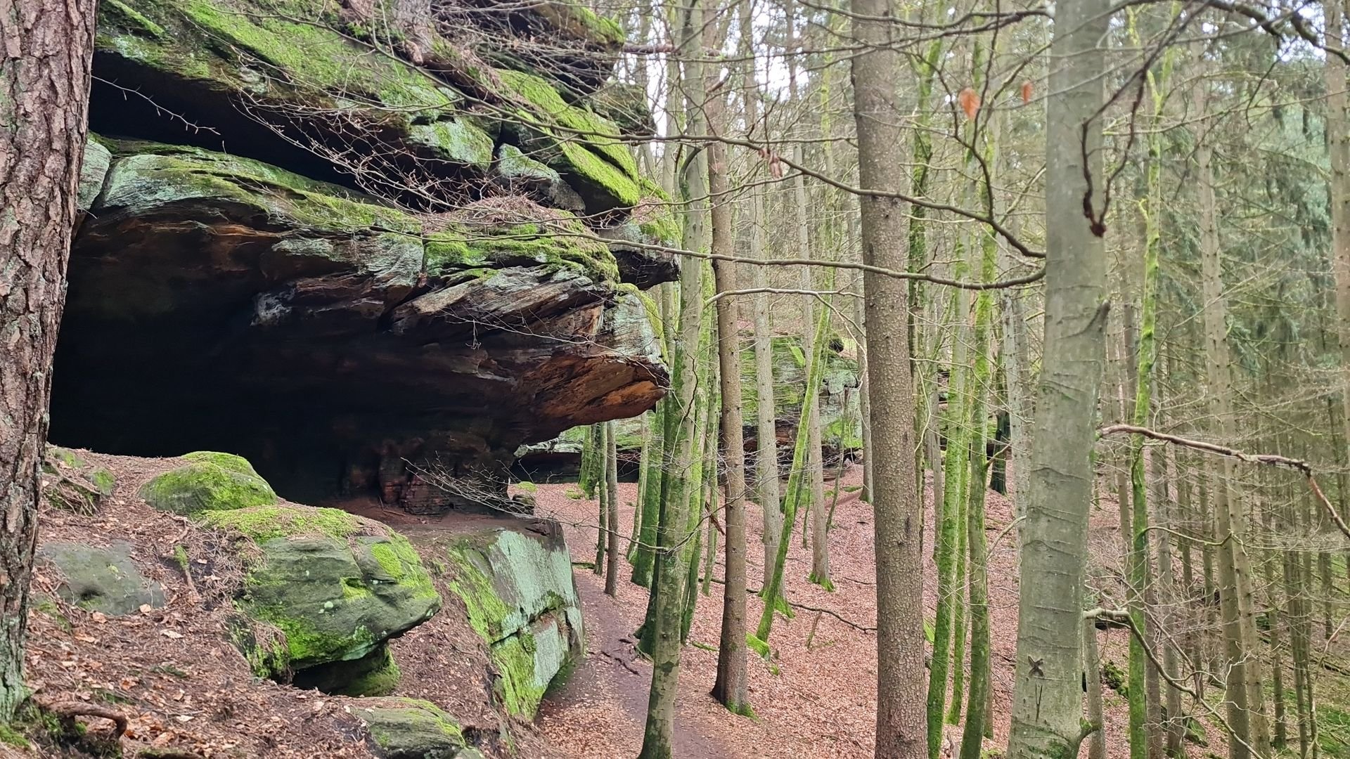 Für die letzten Kilometer nach Kirkel wechselt man auf den Felsenpfad (das erste Bild ist noch von Ostern). Eine kleine Höhle in den Felsen gewährte mir noch eine halbe Stunde Unterschlupf vor dem Regen, ehe ich ganz abstieg und mein Tagesziel und den heutigen Schlafspot erreichte: das Naturfreundehaus Kirkel. Wer hier wandert, muss hier einen Pflichtstop einlegen! Das Haus ist einfach toll. Man spürt die Geschichte, die diesem Haus innewohnt, alle sind nett und die Preise sind mehr als günstig.