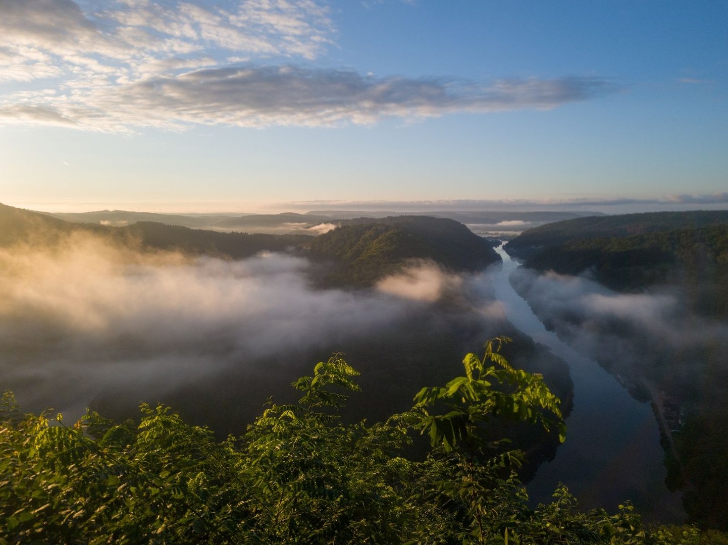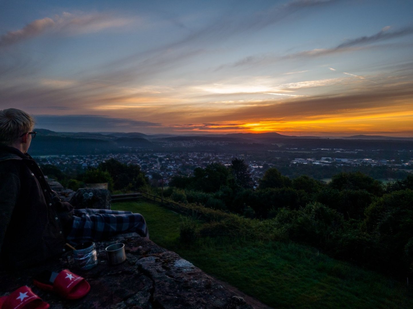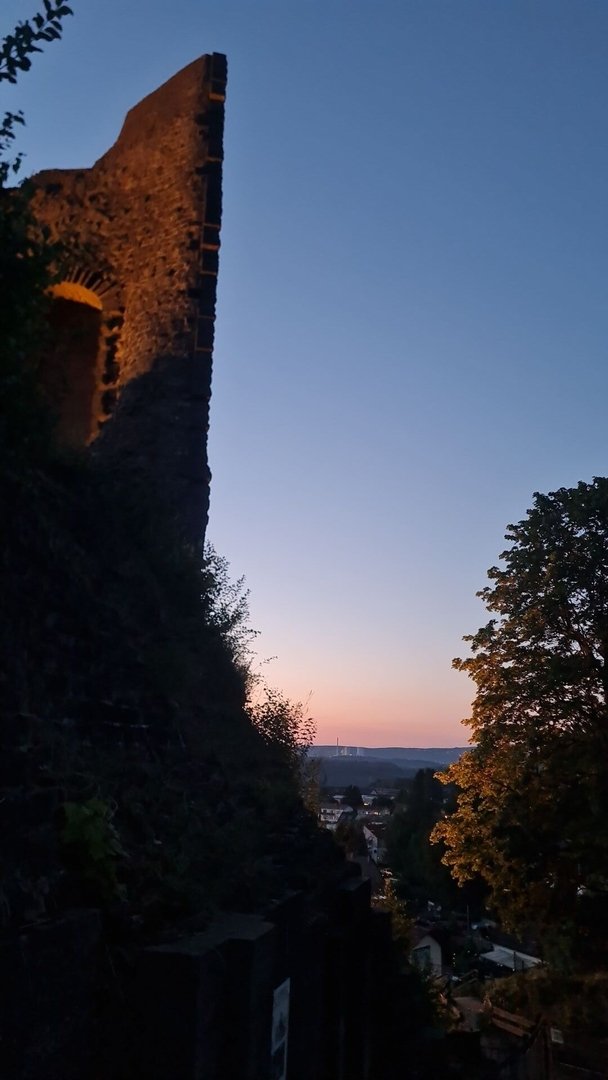 Die Nacht auf den breiten Bänken der Siersburg direkt unter dem Sternenhimmel war einfach klasse. Der Morgen sollte noch schöner werden. Früh klingelte der Wecker und mein Kumpel und ich mussten uns nur noch aufsetzen, konnten Kaffee kochen und die ersten, zögerlichen Sonnenstrahlen des Tages genießen. Schon bald zog es uns aber aus der etwas versteckten Ecke der Burg nach vorne auf die Burgmauer. Von hier hatten wir ein wunderschönes Panorama über das Saartal mit den Städten Dillingen und Saarlouis. Auch das Saarpolygon konnten wir in der Ferne erspähen. Die Sonne schob sich immer höher über die Berge und wir erlebten einen der schönsten Sonnenaufgänge auf meinen bisherigen Wanderungen. Einfach nur schön!