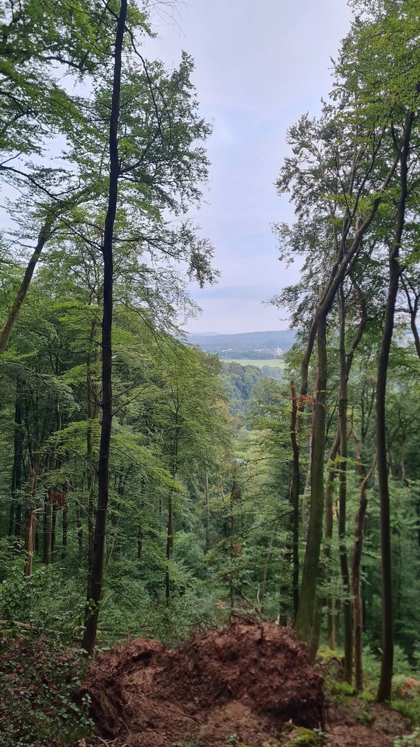 Nun folgte ein echtes Highlight des Saarlandrundwanderweges: das Naturschutzgebiet Nackberg. Von einer asphaltierten Straße bogen wir auf einen schmalen Singletrail ein und befanden uns direkt in einem dichten Dschungel. Es ging jetzt steil den Berg hinauf. Immer wieder erhaschten wir Blicke auf das bereits gelaufene - Toll! Oben angekommen bot sich uns ein Wahnsinnsblick bis in den Hunsrück hinein. Dort war ich vor knapp zwei Wochen aufgebrochen. Bald war es also geschafft.