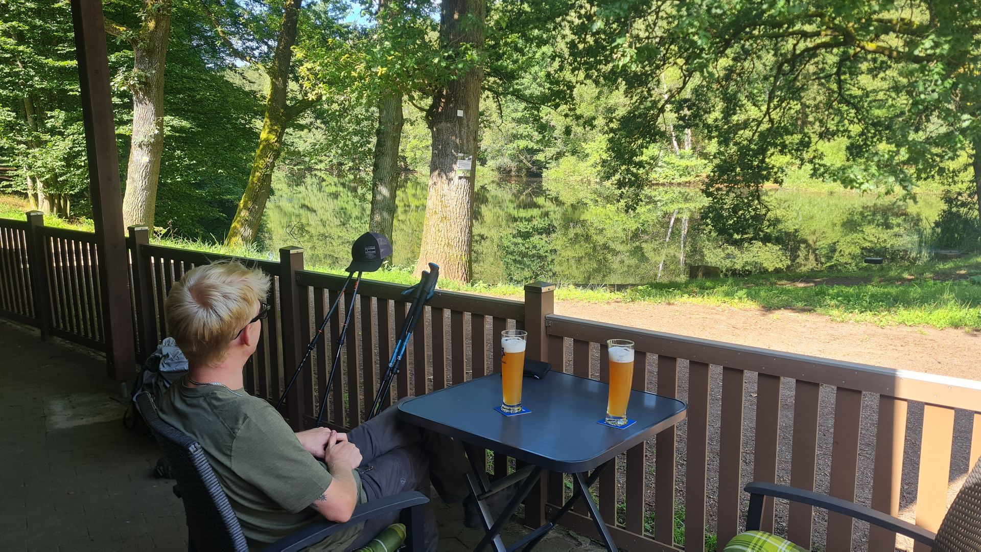 Die Nacht in der Grillhütte war klasse und wir konnten bis kurz vor 8:00 Uhr ausschlafen. Das tat nach den letzten Tagen richtig gut. Schnell gab es noch Frühstück und Kaffee und schon liefen wir wieder los. Genauso wie gestern folgte zunächst wieder toller, wilder Wald mit einfach zu laufenden Wegen. Angekommen am Warndtweiher entdeckten wir, dass das ansässige Gasthaus schon geöffnet hatte. Da die Küche noch geschlossen hatte, gab es ein zweites Frühstück bestehend aus einem Kaffee und einem Weizen. Gut gestärkt, ging es schon bald weiter.