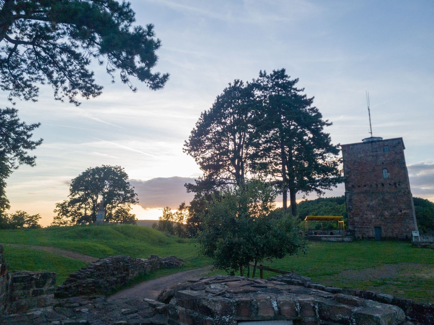 Die letzten Kilometer des Tages führten mich an der Ruine des Karlsberger Schlosses und an der Karlsbergquelle vorbei, bis zum Schloßberg über Homburg. Als ich das letzte Mal an Ostern hier war, zog ich noch drei Kilometer weiter zu einer Schutzhütte. Beim Weggehen, sah ich beim letztes Mal etwas, was wie eine zugige Hütte im hinteren Teil der Burgruine aussah. Das sollte mein Schlafquartier werden! Auf der Burg angekommen musste ich enttäuscht feststellen, dass es sich dabei nur um die Überdachung einer Treppe hinauf zur Burg handelte. Da ich nicht weiter wollte, entschied ich mich dazu mein Ponchtarp im hinteren und nicht einsehbaren Bereich (außer an einer Stelle), aufzubauen. Nach ein bisschen herumprobieren, war ich sehr zufrieden. In der Nacht sollte es leicht regnen. So wäre es aber kein Problem.