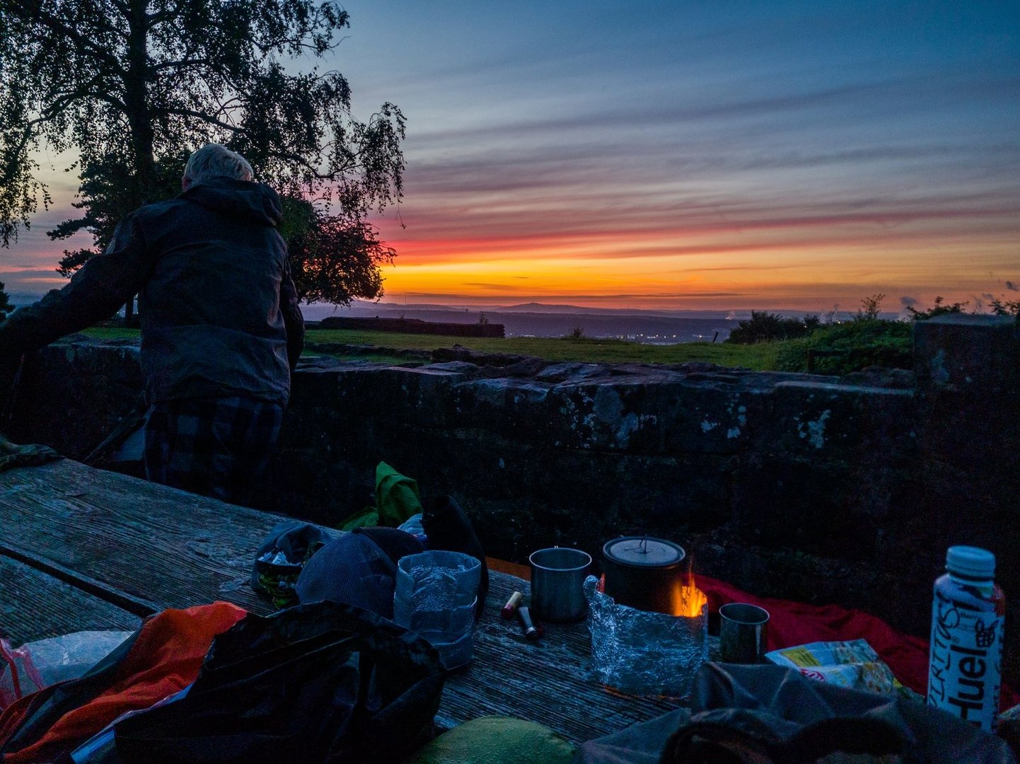 Die Schnecken überranten mich und bald war ich, war alles voll mit Schneckenschleim. Sich diesem Schicksal fügend, schloss ich die Augen und schlief tatsächlich fast ein, bis ich merkte, dass meine Hüfte den Boden berührte. Nein, bitte nicht, dachte ich mir. Vielleicht habe ich nur das Ventil nicht richtig verschlossen. Schnell pustete ich die Matte wieder auf und schlief wieder ein. Aber ihr könnt es euch schon denken und nachdem ich nochmal mit der Hüfte auf dem Boden aufgewacht war, hatte ich Gewissheit. Die Matte hatte ein Loch. Zum Glück hatte ich mir den Wecker so gestellt, dass ich zum Sonnenaufgang aufstand. Die Nacht war somit schnell um. Für den Sonnenaufgang ging ich nochmal hoch auf den Hauptaussichtspunkt der Burganlage. Tja, und dann war es bewölkt. Voll mit Schneckenschleim, total gerädert und mit einer Prise Galgenhumor, gab es dann erstmal einen Kaffee. Dann alles zusammen gepackt und los. Es sollte zum Glück noch einer der schönsten Wandertage meiner Karriere werden.