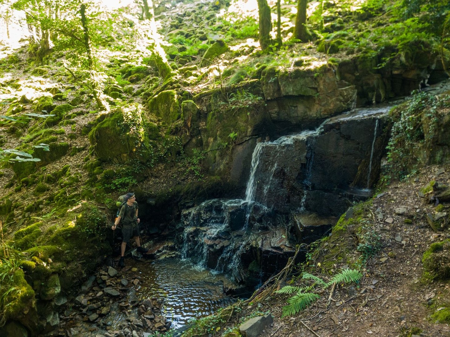 So ging es aber für uns weiter. Es folgte ein Abstieg zur Saar auf teils breiten Forststraßen und teils völlig verwilderten, schmalen Pfaden durch gigantische Douglasien-Haine. Direkt an der Saar (leider wieder Landstraße) entlang, liefen wir bis zur Saarschleifenlodge, am Fuße der Cloef. Hier gab es endlich wieder eine dringend benötigte Stärkung in Form von Kuchen und Weizen. Auch unsere Powerbanks durften wir hier nochmal laden. Wir kauften noch ein weiteres Bier für den Abend und wollten gerade los, als wir mit den Tischnachbarn ins Gespräch kamen. Er empfahl uns einen anderen Weg, um zur Cloef aufzusteigen, der nicht durch das, ohnehin gesperrte, Steinbachtal führte. So bogen wir auf einen noch deutlich steileren Pfad ein. Der Herr hatte nicht zu viel versprochen. Schon bald standen wir an einem Wasserfall. Klasse!