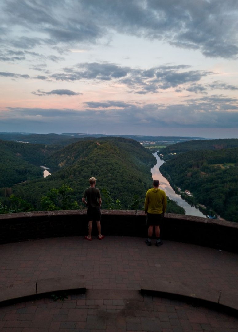 Am frühen Abend erreichten wir dann unser Tagesziel. Die Schutzhütte an der Cloef, direkt über der Saarschleife. Dieser Ort ist einfach magisch. Das sehen nur leider viele so und so war eigentlich immer was los an der Aussichtsplattform. Aber da war ja noch der angekündigte Besuch! Schon bald stieß niemand geringeres als der NST-Wanderer der Class of 2024 zu uns. Auf seinem NST war er gerade in der Ecke und so passte es perfekt. Es folgte ein toller Abend mit vielen Späßen und Geschichten. Ein perfekter Abschluss also.
