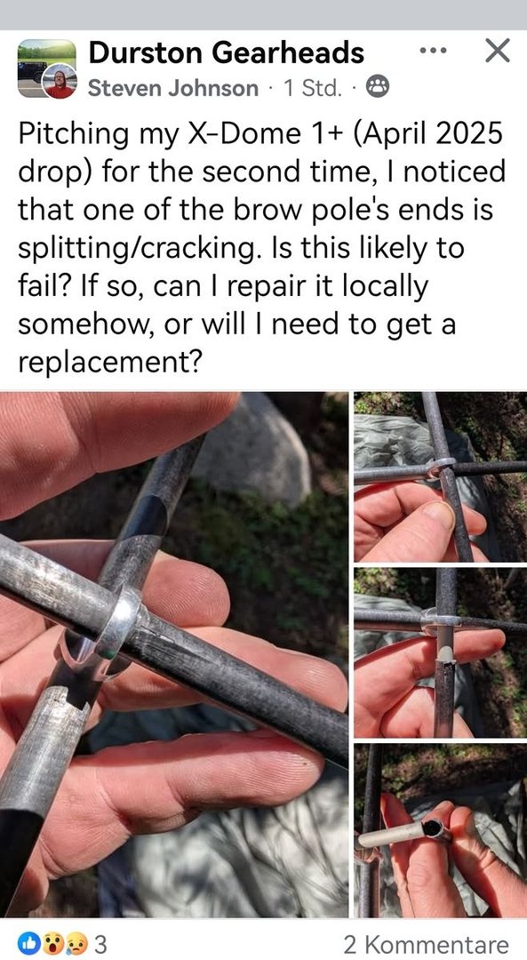 Bei Tarptent ist gestern auch eine Querstange aufgetaucht, bei der der Einsatz nach innen gerutscht ist. Aber die Hauptbögen sind bei TT ja eigentlich Aluminium, jetzt DAC.