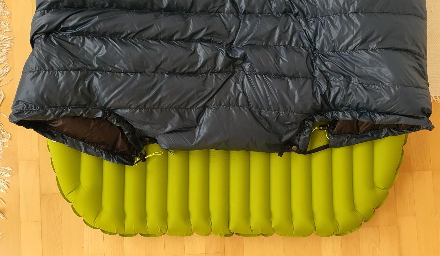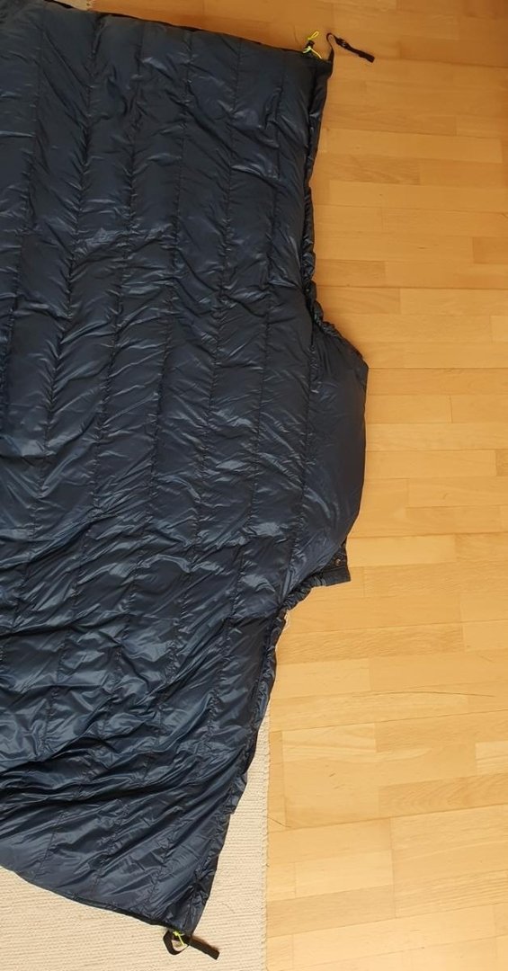 Das Ding kann komplett als Decke geöffnet werden, oben gibt es zwei separate Schnürzüge, die Footbox wird mit 3 RVs geschlossen, unten gibt es trotzdem noch einen Schnürzug, damit man notfalls Kopf an Fuß pennen kann (enge Stockbetten auf den Hütten auf dem TA z.B.), der RV an Fußende ist nach innen versetzt, so bildet sich automatisch eine Abdeckung für den RV und es zieht nicht rein. Ich bin 1,90 daher ist das Ding relativ großzügig geschnitten. Bei den Abmessungen sollte man dran denken dass die Länge auch für die Footbox benötigt wird. Wir haben eine etwas größere Breite gewählt anstatt Draft stopper anzubasteln. Das Gewicht steigt dadurch minimal aber die Arbeit ist viel geringer...
