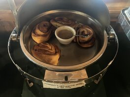 Die Cinnamon Roll ist nicht mehr bewältigbar nach Bacon, Eggs, Cheesy irgendwas und crispy potatoes und granola, fresh fruit and green yogurt. Zum Glück habe ich jemanden zum Teilen dabei ![]()