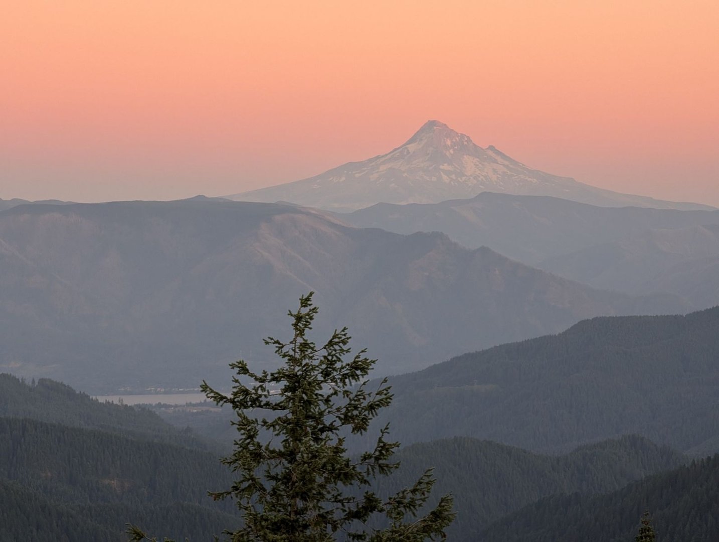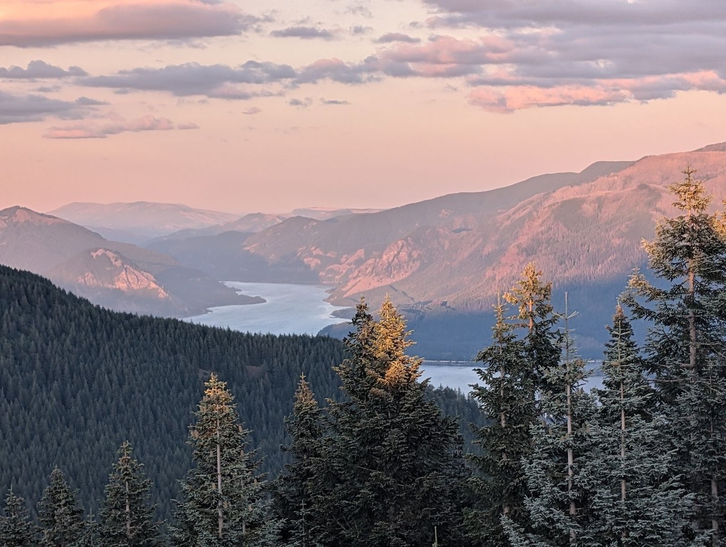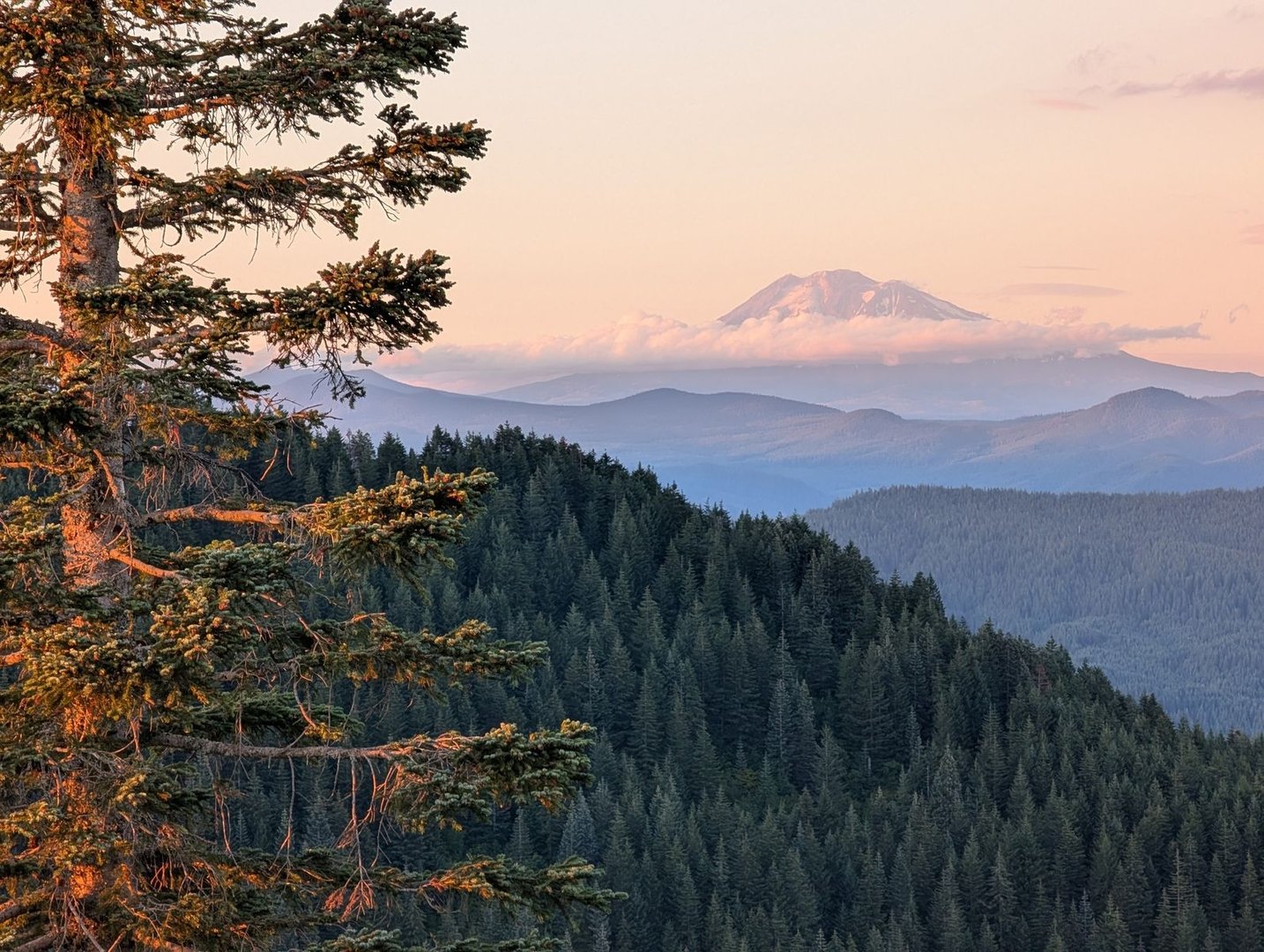 Die Columbia Gorge und der Wolken umkreiste Mt. Adams (3742 m) beim Sonnenuntergang. Auch der nächste Tag hält am Abend wieder eine exponierte Campsite bereit,