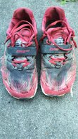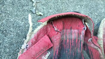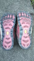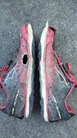 Das übliche Bild. Sohle weg bis auf die Zwischensohle, wenn auch nicht ganz so arg. Von Profil nicht mehr viel zu sehen. Dazu das übliche Loch an der äußeren Knickstelle - und neu bei diesem Modell - ein sich völlig ablösender Zehenschutz, ohne den der Schuh selbst nur unzureichend vernäht und geschlossen ist - das letzte Drittel war eher ein wide Option selbstgemacht...:rolleyes: