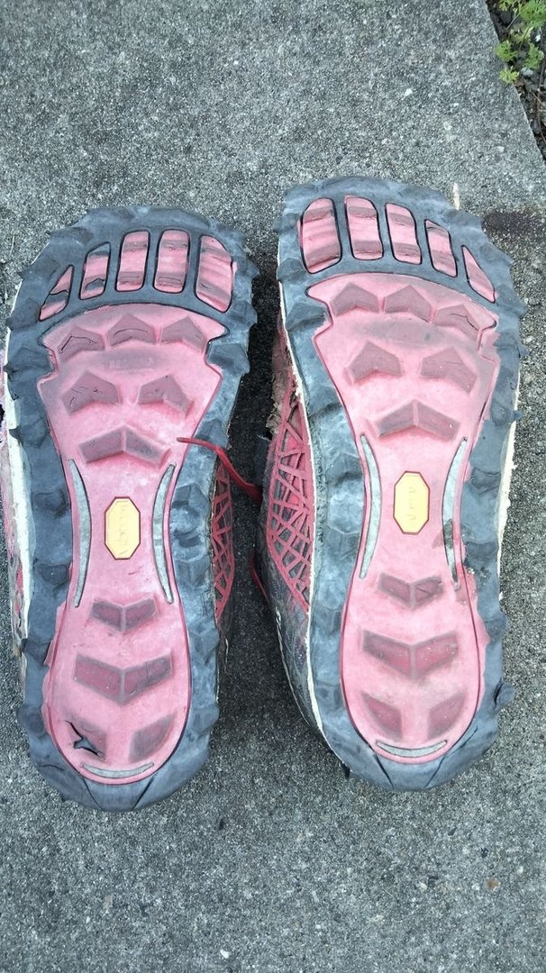 Profil weggeraspelt bis auf die Zwischensohle, das sogar schon deutlich früher. Die Dämpfung sieht vorne auch schon übel aus - und der Oberstoff ist wieder an der gleichen Stelle offen, wenn auch noch nicht so drastisch, aber da reicht ja dann ein Mal etwas rutschen.