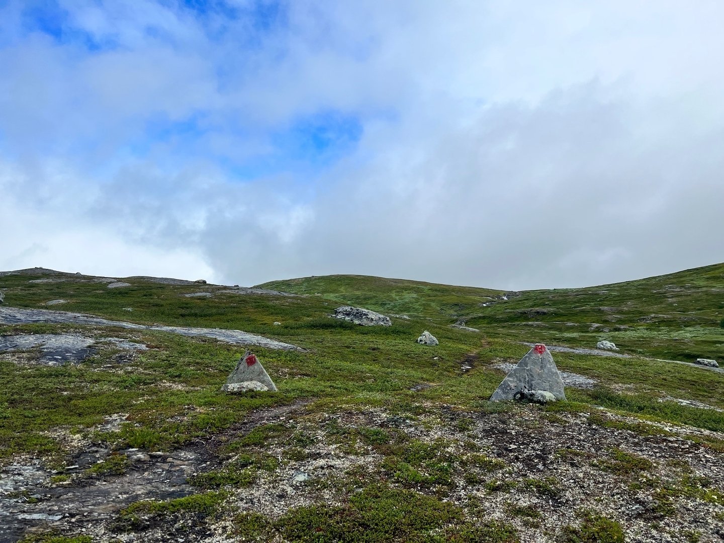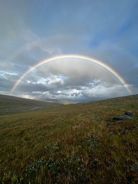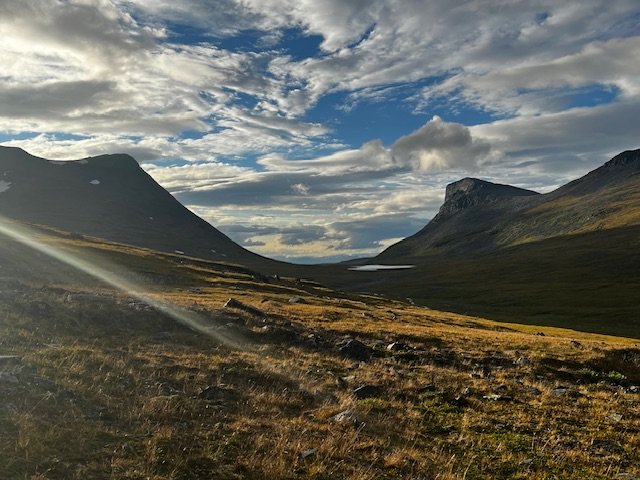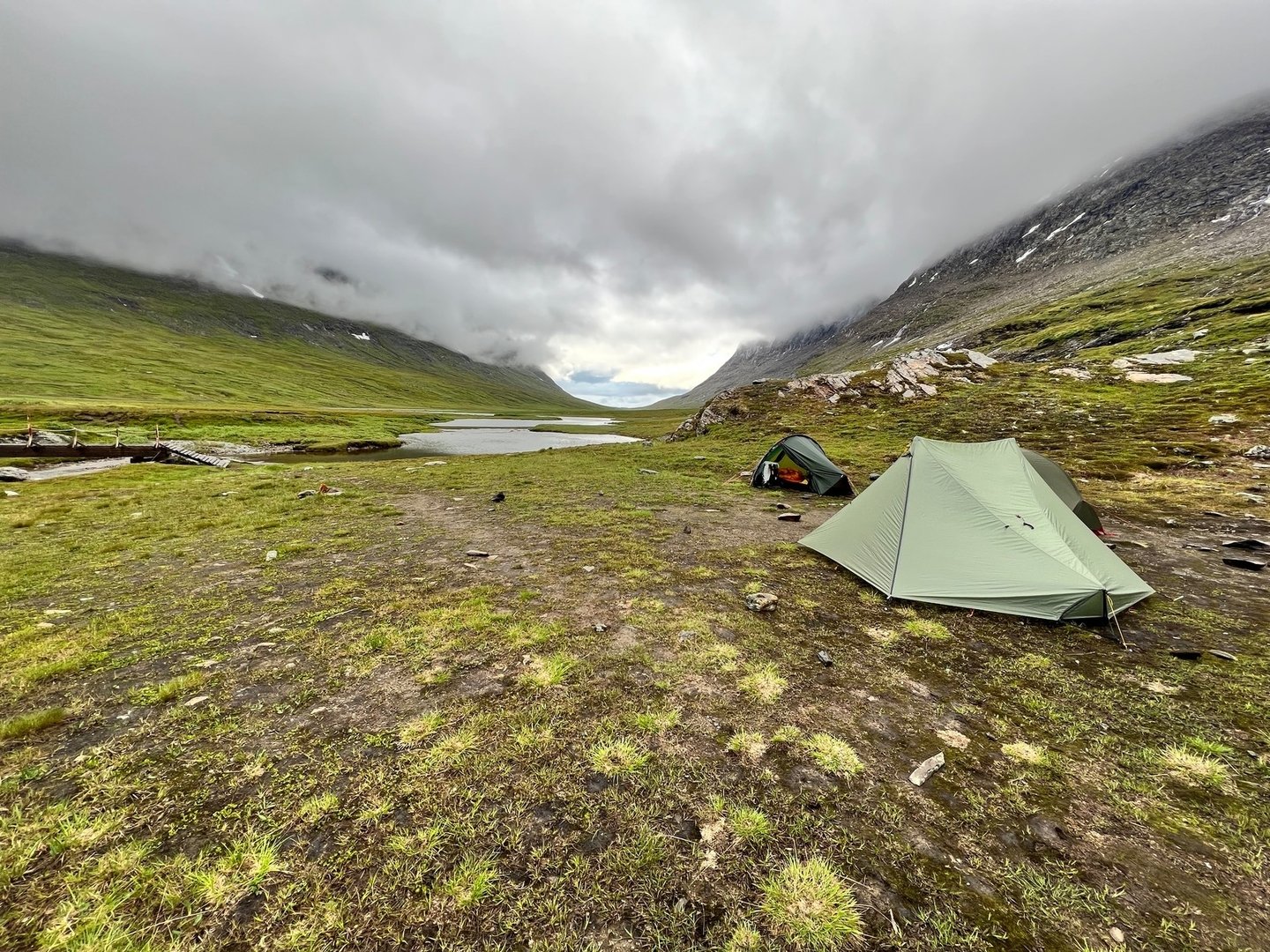 Vor dem nächsten Tag graut mir etwas, weil ich die Sümpfe noch in recht guter bzw. eher schlechter Erinnerung habe. Tatsächlich aber geht es bis zum Nissonvágge erstaunlich gut. Entlang des Vierrojohka finde ich diesmal eine wirklich gute Route. Kunststück, es wurde auch gerade frisch markiert. Wunderschöne Landschaft. Nach der Brücke über den Aliseatnu geht es kurz bergauf, und dann muss ich eben Richtung Osten und den markierten Weg verlassen. Tatsächlich aber finde ich einen recht gut ausgetrampelten Weg, das bushwhacking hält sich in Grenzen. Vielleicht hat sich aber auch einfach meine Toleranzschwelle verschoben? Am Nissonvágge angekommen, beginnt erstmal das große Grübeln. Damals konnte ich den Bach ohne Umwege direkt queren. Ich realisiere, was für großes Glück ich damals hatte, direkt eine leicht passierbare Stelle zu finden. Diesmal lande ich wohl etwas weiter östlich und stehe erstmal vor einem ordentlichen Canyon. Gehe ich links oder rechts? Ich entscheide mich für letzteres und mache so wohl einen deutlich größeren Umweg als wäre ich anders gegangen. Kurz nach Querung des Flusses stehe ich tief im Sumpf. Kacke! Es geht auch langsam gegen Abend zu. Ans Zelten ist hier aber sicher nicht zu denken. Über ein ordentliches Stück bleibt es erstmal sumpfig. Eigentlich wollte ich nicht oben im U-Tal von Lapporten zelten. Zu exponiert. Aber hier geht es ja nun auch nicht. Also weiter. Ich finde einfach keine trockene Stelle und so stehe ich dann doch irgendwann dort, wo ich eigentlich nicht sein will. Sehr exponiert. Und während es hier im U-Tal zwar endlich flache Stellen gibt, so sind die meisten immer noch nass und sumpfig. Die paar trockenen Flecken, sind genau da, wo es kaum Erde gibt um Heringe verankern zu können. Große Steine sind auch Fehlanzeige. Ich hab kein gutes Gefühl. Ich schlage das Zelt dennoch irgendwo auf, was soll ich auch sonst machen? Um weiter zu gehen bin ich viel zu müde, die Beine tun weh und es wird langsam dunkel. Ich freue mich noch über einen Regenbogen und da höre ich auch schon den ersten Donner. „Das ist doch jetzt nicht wahr, oder?“. Ich mache mich noch mal auf die Suche nach größeren Steinen, finde tatsächlich ein paar aber so recht überzeugend ist das ganze Setup leider immer noch nicht. Ich lege mich schlafen. Nach ein paar Stunden rüttelt der Wind so stark an meinem Zelt, dass mir Angst und Bange wird. Ich zieh mich an, gehe nach draussen und stelle fest, dass die Hälfte meiner Heringe lose ist. Mir ist da schon klar, dass das hier nix mehr wird, aber versuchen kann man es ja mal. Ich suche noch mehr Steine und verankere die Heringe neu. Ich lege mich hin und schlafe nochmal ein bis zwei Stunden.