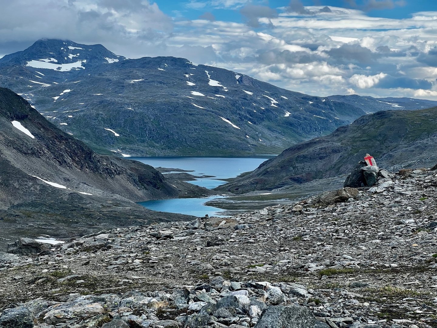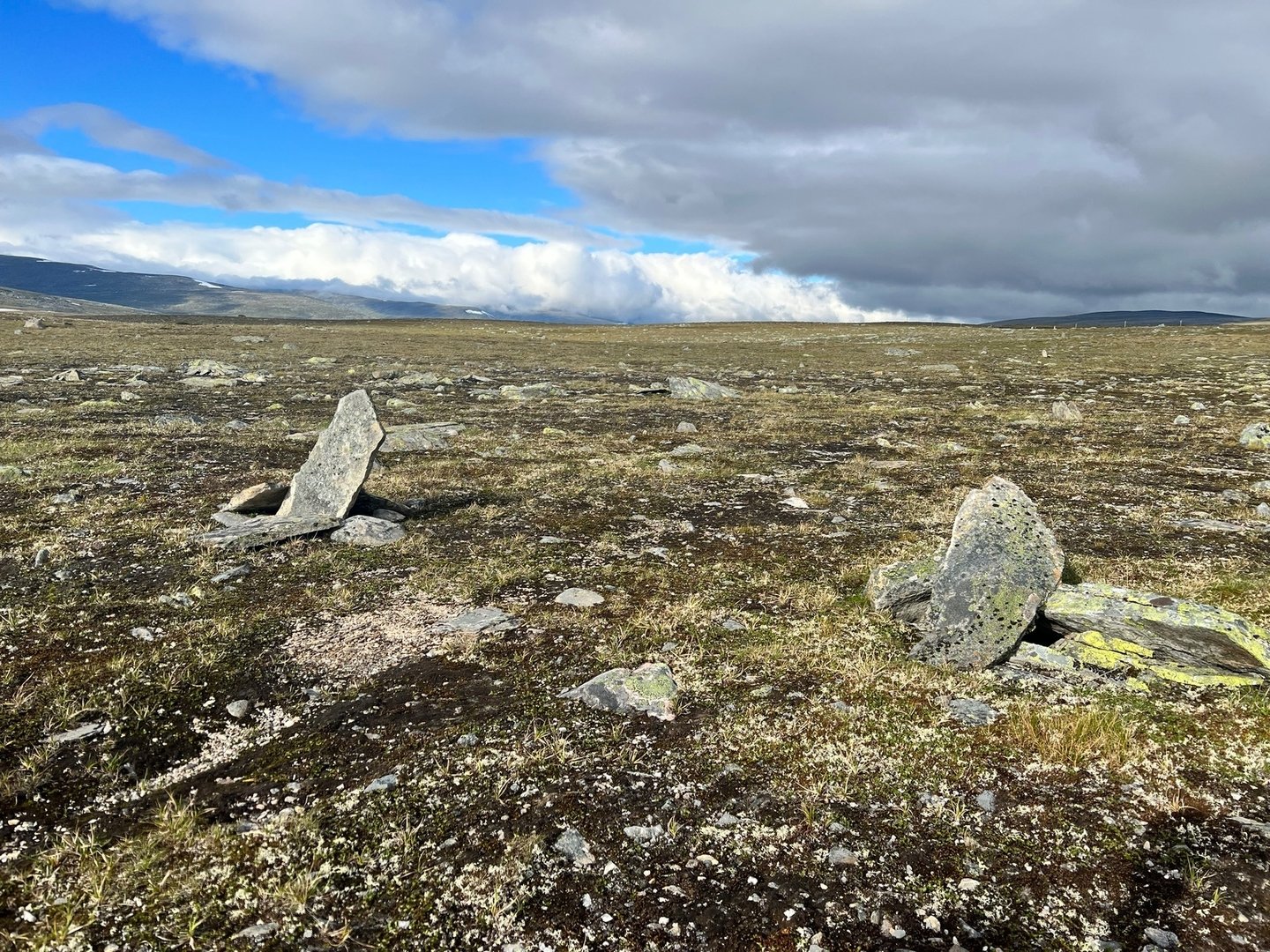 Jetzt geht es endlich auf den Nasaleden. Diesen Weg hatte ich auf meiner Karte gesehen, konnte aber kaum etwas dazu in Erfahrung bringen. Das einzige war eine Tourbeschreibung auf ODS (nicht mehr auffindbar). Er wird wohl nicht mehr gepflegt und daher auch kaum beworben. Schon nach ein paar Kilometern auf dem Trail verändert sich die Landschaft rapide. Wo gerade noch alles üppig und grün war, wird es plötzlich sehr karg. Steine und Geröll, soweit das Auge reicht, und schon bald queren wir auch wieder die Grenze zurück nach Schweden. Bald sehen wir auch schon die Warnschilder, über die ich auch schon im Internet gelesen hatte. Längs des Weges findet sich eine alte Silbermine und die Gewässer rings um sind bis heute gesundheitsgefährdend mit Schwermetallen belastet. Etwas südlich der eigentlichen Mine ist eine kleine Rasthütte, welche gleichzeitig als eine Art Minimuseum fungiert und an die unbeschreiblichen Gräuel und Entbehrungen unter denen die Menschen vor ein paar hundert Jahren dort gelebt und gearbeitet haben. Die Mine hatte ihren eigenen Friedhof, um all die Leute zu bestatten, die dort ums Leben kamen. Sie wurde erstmals in der Mitte des 17. Jahrhunderts betrieben. Es arbeiteten dort überwiegend Menschen, die vor die Wahl gestellt worden waren, entweder als Soldaten in den Krieg gegen Dänemark zu ziehen oder aber eben in der Mine zu arbeiten. Da der Betrieb zu viele Tote forderte ging man dazu über eine Schicht auf je drei Monate zu begrenzen. Die dort ansäßigen Samen wurden zwar nicht zur Arbeit in der Mine gezwungen aber wurden verpflichtet mit ihren Rentieren für Logistik und Transport zu sorgen. Viele der Tiere überstanden diese Torturen nicht und so blieb vielen Samen oft nur die Flucht, weil sie all ihre Hab und Gut verloren hatten. Dabei war die Mine nie kommerziell erfolgreich, hat nie wirklich die erhofften Mengen an Silber gefördert und wurde letzten Endes noch von den Dänen erobert. Deprimiert ziehen wir weiter. Die Landschaft ist offen und weit. Wir verlieren den Weg, aber das ist egal. Irgendwo finden wir andere, ältere Markierungen und folgen diesen. Wir übernachten bei recht rauen Verhältnissen zwischen zwei kleinen Seen.