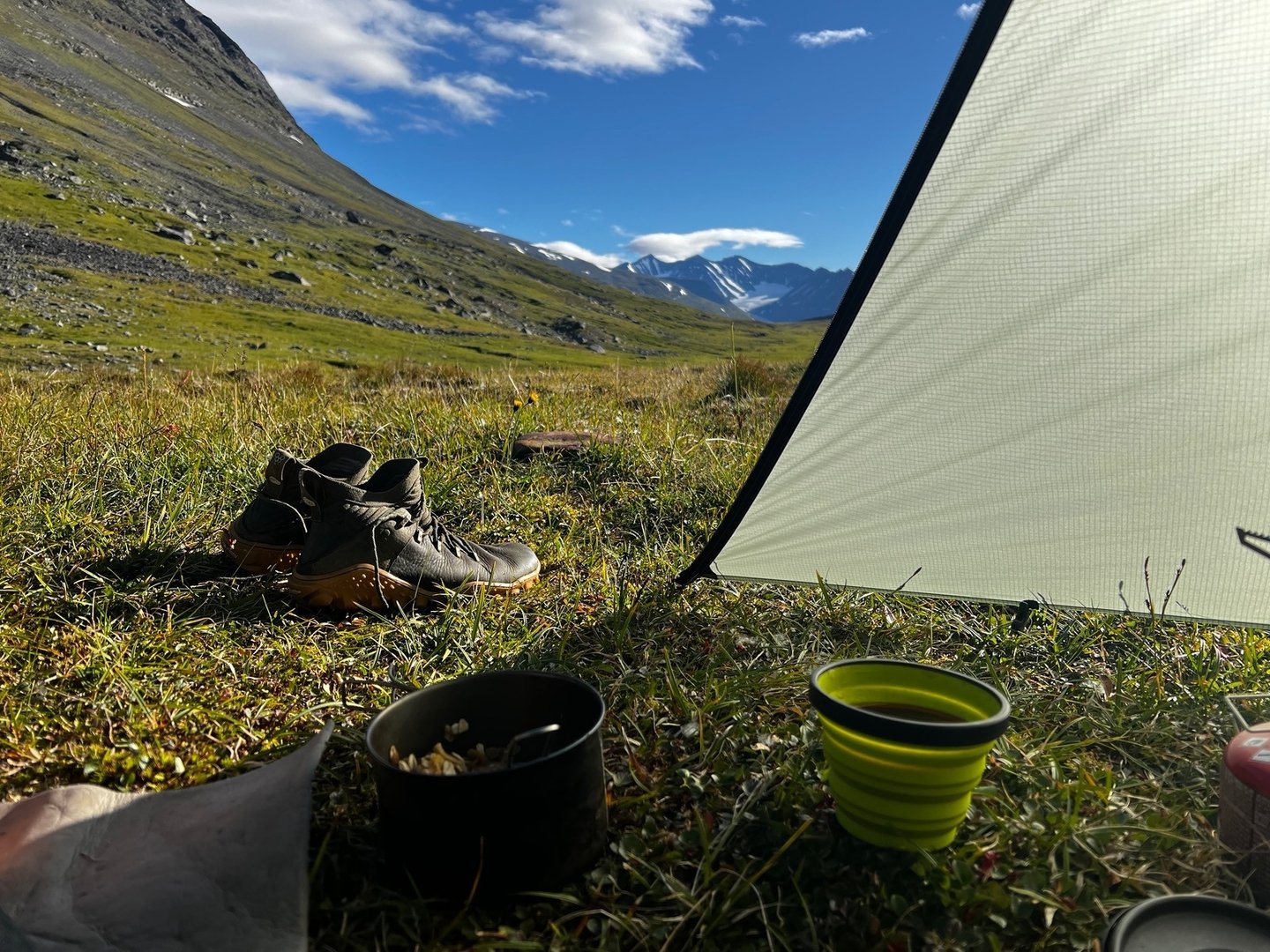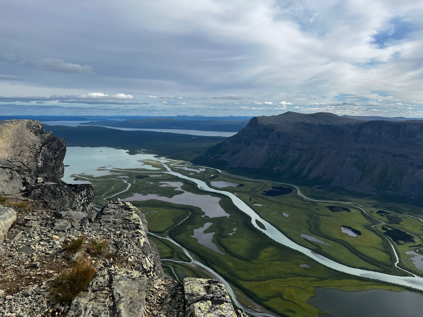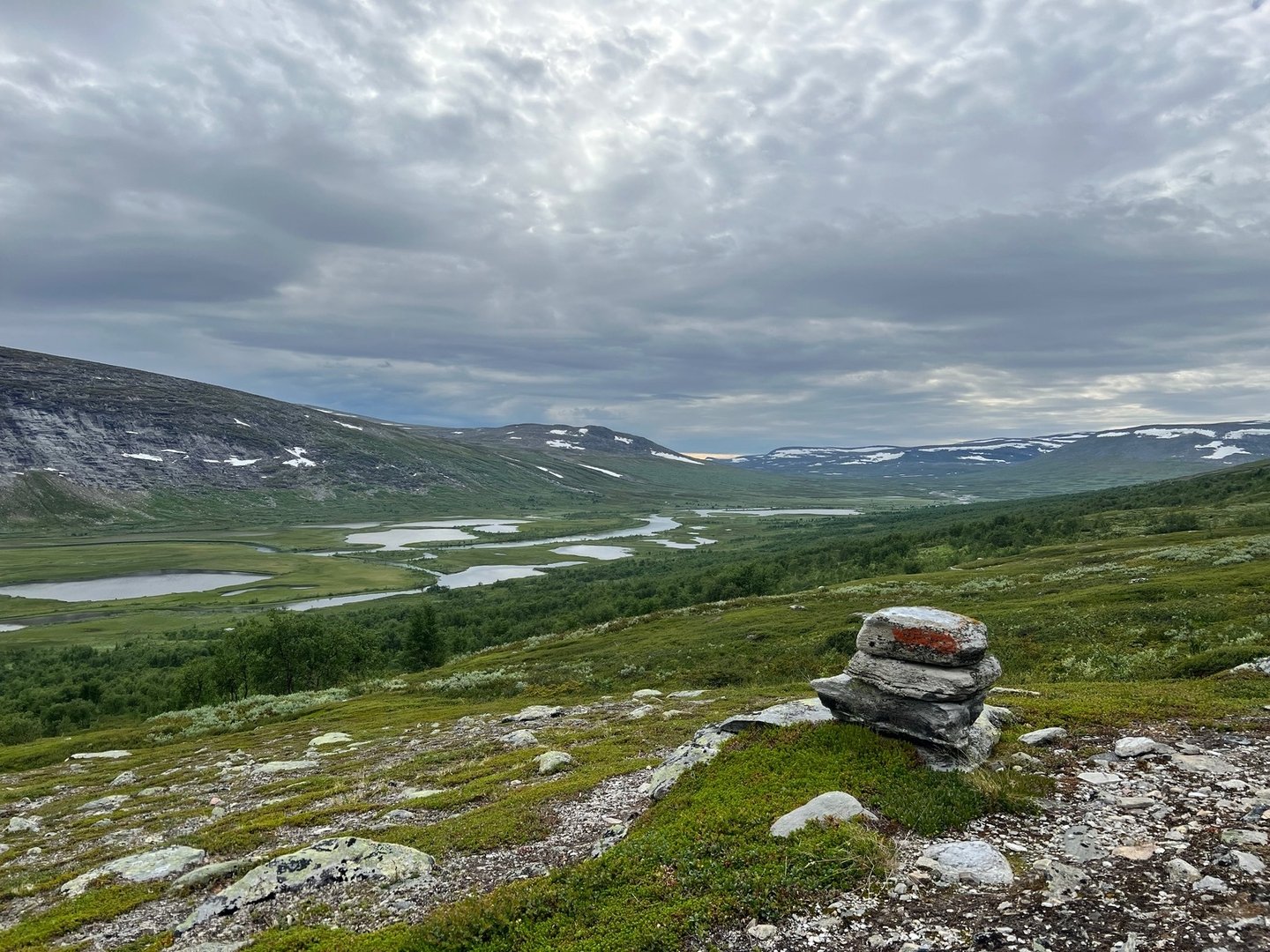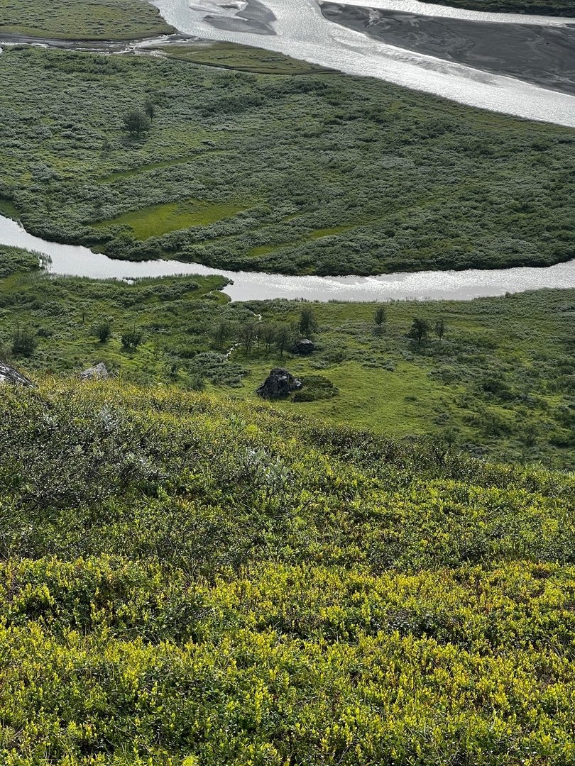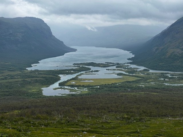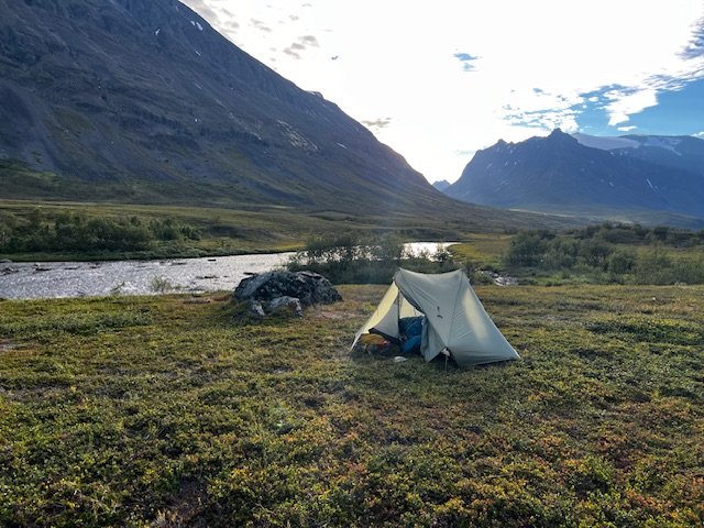 Obwohl es grau in grau ist und es immer wieder etwas nieselt, bleibt das Wetter eigentlich ganz okay. Der Morgen ist trotzdem recht frisch, hauptsächlich wegen einer etwas steiferen Brise. Ich mache mich auf den Abstieg ins Rappadalen und kann es kaum erwarten einen Blick auf den rovdjurtorg zu werfen. Tiere seh ich aber leider keine, die Kulisse beim Abstieg vor dem Stuor Skuorki ist trotzdem überwältigend. Vielleicht sogar ein bisschen furchteinflößend. Unten im Tal mach ich zwischen dem Gestrüpp und den Büschen eine Pause und gerade als ich los will, kommt mir ein älterer Mann entgegen. Er trägt einen monströsen Rucksack und stützt sich bei jedem Schritt auf einen schweren Holzstab. Eine Mischung aus Gandalf und Nikolaus. Wir kommen ins Gespräch. Er kommt aus Berlin und ist 75 Jahre alt. Er hat Essen für drei Wochen dabei, sein Rucksack wiegt über 35kg. Das ganze Unternehmen dokumentiert er für seinen YouTube-Kanal. Er beginnt zu erzählen, und so erfahre ich, dass er diese Tour in Gedenken an seine verstorbene Frau macht. Sie wären damals Ende der 80er mit Essen für drei Wochen in den Sarek aufgebrochen, mit nichts als einer groben Skizze in der Hosentasche, die er aus einem Buch abkopiert hatte. Währen der Tour wollte seine Frau die Scheidung einreichen, im Zug nach Hause hätten sie aber schon wieder den nächsten Trip geplant. Am Alep Vássjájågåsj drehe ich gen Westen ab, verlasse das Tal und sehe zu, dass ich an Höhe gewinne. Unterwegs hatte ich mir den Bauch schon ordentlich mit Heidelbeeren vollgeschlagen, aber nun stand ich mitten in Unmengen von hjortron, die ich auf gar keinen Fall einfach links liegen lassen kann. Also stapfe ich durch die Sümpfe und schlage auch hier nochmal ordentlich zu. Ich passiere ein kleines Häuschen und weiter oben, sobald ich oberhalb der Baumgrenze bin, bau ich mein Zeltchen auf. Wie lange es wohl noch bis zum Skierffe ist?