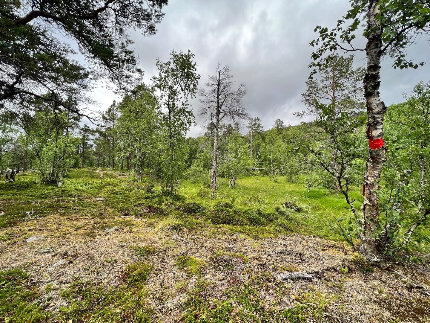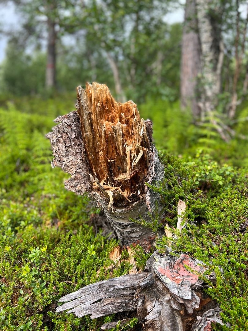 Es geht ein Weilchen auf einer Straße dahin, bis ich endlich vor dem relativ bekannten Gasthaus stehe. Ich lasse es aber links liegen und ziehe weiter. Ein bisschen später bin ich wieder auf einem single trail und finde mich Mitten in einem echten fjällurskog wieder, ein alter, unberührter Wald aus überwiegend Birken aber auch Kiefern. Alte Bäume, junge Bäume, tote Bäume. Genau das, weshalb ich hier unterwegs bin. Jörgen Johansson beschreibt das Seldutvágge als eine in Vergessenheit geratene Perle des schwedischen fjälls. Ein echter Geheimtipp also. Ich genieße die nächsten Stunde der Wanderung zutiefst. Ich finde einen perfekten Zeltplatz in Seenähe direkt unter ein paar Kiefern und haue mich aufs Ohr.