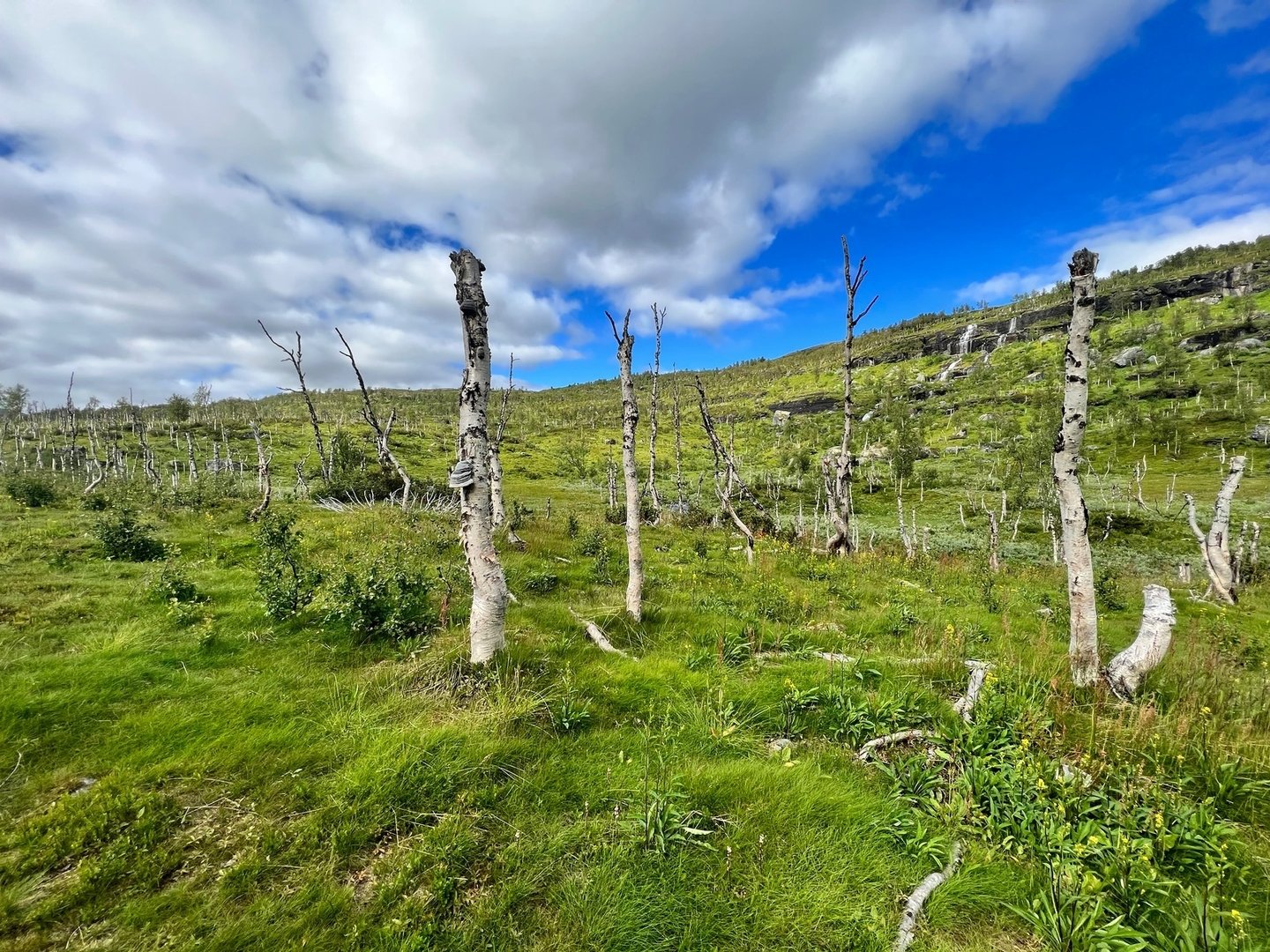 Früh am nächsten Tag verlasse ich den Urwald, es wird deutlich langweiliger. Brav aufgereihte Birken, auf ihre Abholzung wartend. Ich folge einer schnurstracks geraden Schneise. Und plötzlich ist es auch vorbei mit der guten Markierung. Da scheint das Team noch nicht weitergekommen zu sein, denn bislang war alles ganz neugemacht. Es wird auch deutlich sumpfiger und bald sind auch alle Birken von dieser fiesen Krankheit befallen, die sie halbtot und siech erscheinen lässt und sie letztlich zum Absterben bringt. Am Flussufer entdecke ich ein Camp von Anglern, die fachmännisch ihre Hängematten in Mitten von lauter toten Bäumen befestigt haben; am Horizont eine Wolke, welche frappierende Ähnlichkeit mit der Büste von Charles Darwin trägt. Wer ist schneller, er oder der Helikopter, der sie abholen kommt? Ein paar Stunden später treffe ich auf den Pfad, der südwestlich von einem Wanderparkplatz am Silvervägen kommt. Ab hier treffen ich regelmäßig auf Leute, hauptsächlich Norweger, wie mir scheint. Irgendwie naheliegend. Ich schaffe es bis zum Ikkesjávrre und baue dort mein Zelt auf.